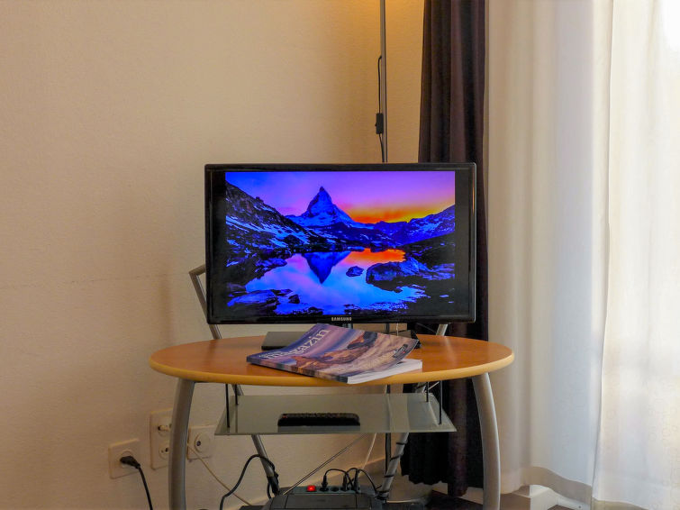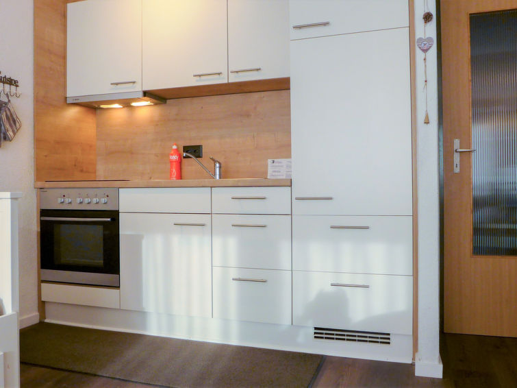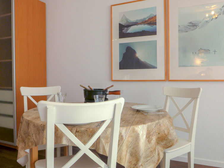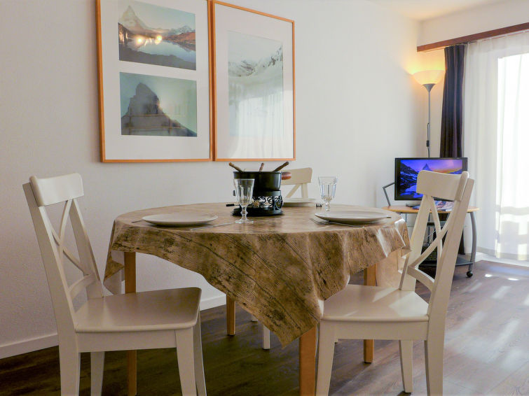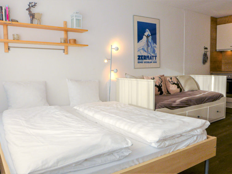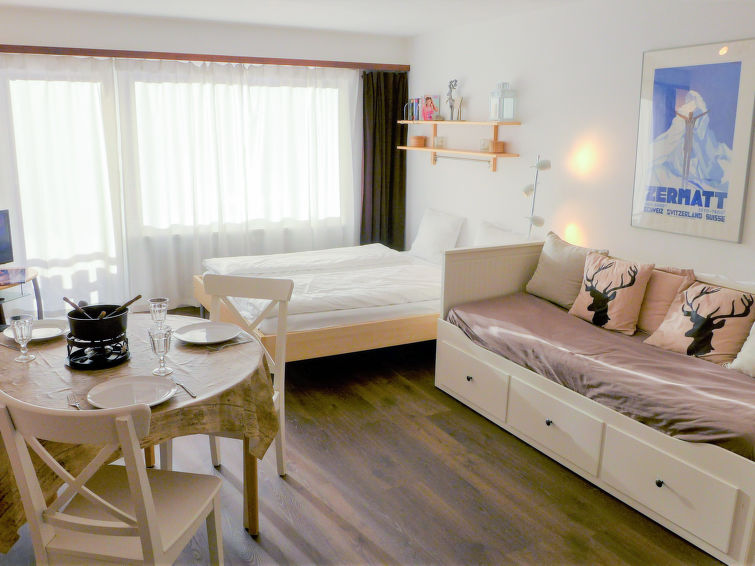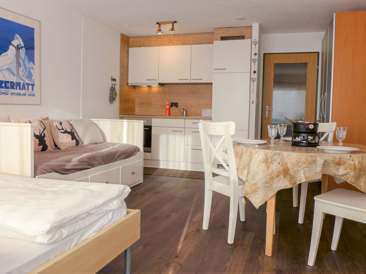 1-Zimmer-Wohnung 35 m2 im 2. Stock, Südlage. Hell, einfach und gemütlich eingerichtet: Wohn-/Schlafzimmer mit 1 Diwanbett (90 cm, Länge 200 cm), 1 Doppelbett (160 cm, Länge 200 cm), Esstisch und TV. Ausgang zum Balkon. Offene Küche (Backofen, 4 Glaskeramikplatten, Toaster, Wasserkocher, Tiefkühler, elektrische Kaffeemaschine, Racletteofen, Fondue Set (Käse)). Bad/WC. Balkon 7 m2, Südlage. Balkonmöbel. Schöne Sicht auf Matterhorn. Zur Verfügung: Haartrockner. Bitte beachten: Nichtraucher-Unterkunft. Kein Internet.