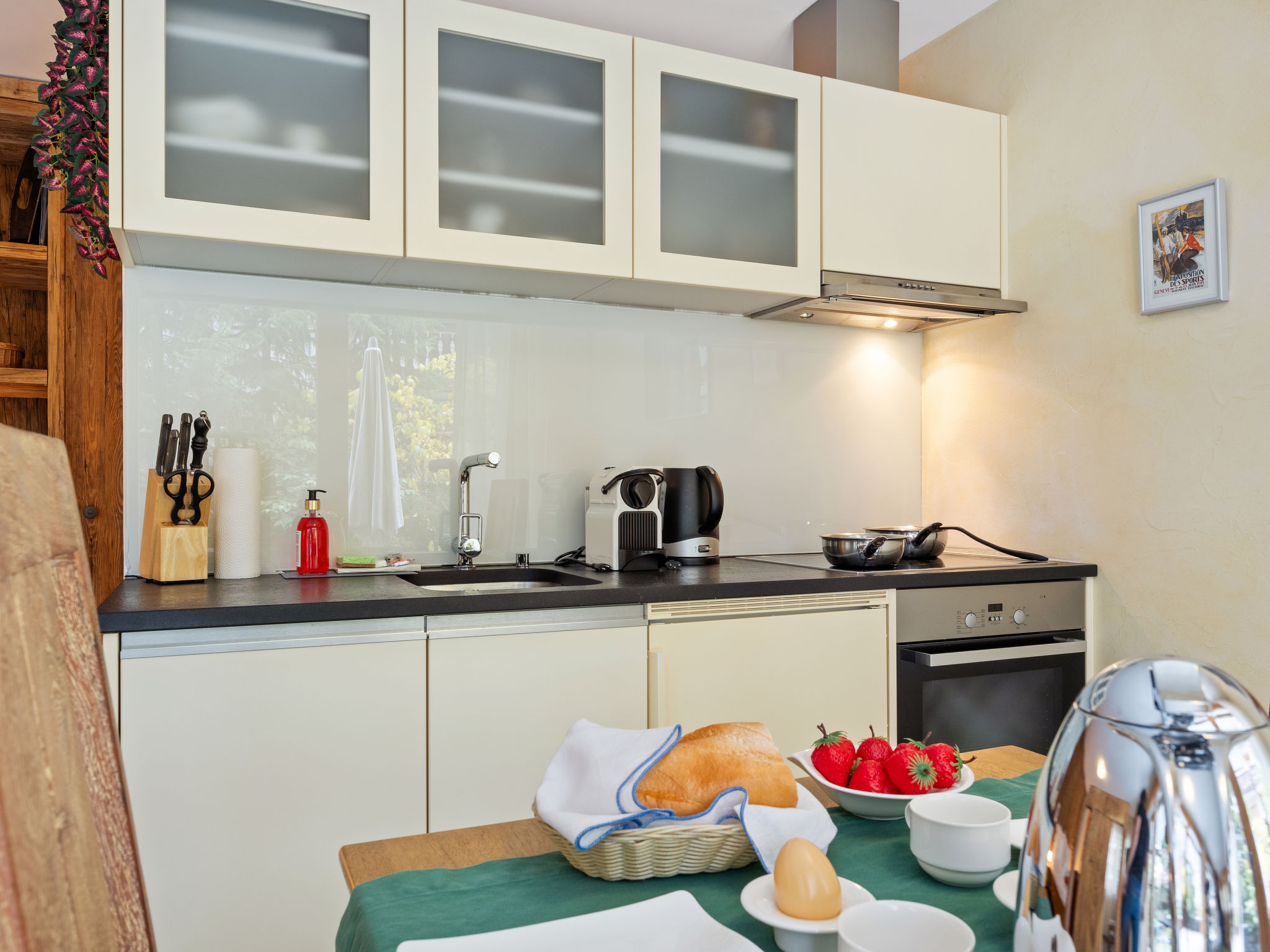 1-Zimmer-Wohnung 35 m2, im Erdgeschoss. Sehr luxuriös und gemütlich eingerichtet: offenes Wohn-/Schlafzimmer mit 1 Doppelbett, Esstisch, TV, CD, Stereoanlage und DVD. Ausgang zur Terrasse. Offene Küche (Backofen, Geschirrspüler, 4 Induktionskochplatten, Toaster, Wasserkocher, Tiefkühler, elektrische Kaffeemaschine, Kapseln für die Kaffeemaschine (Nespresso) extra, Racletteofen, Fondue Set (Käse)). Dusche/WC. Kleine Terrasse, Südlage. Terrassenmöbel. Zur Verfügung: Safe, Haartrockner. Internet (WLAN, gratis). Bitte beachten: Nichtraucher-Unterkunft.