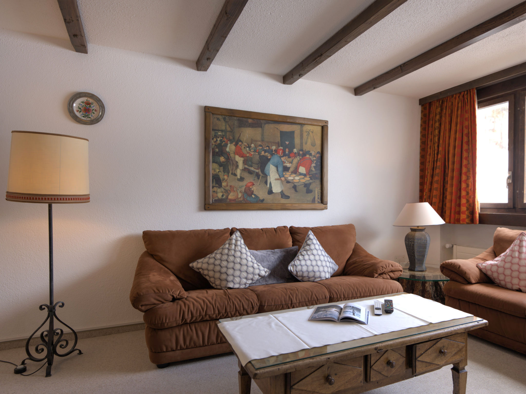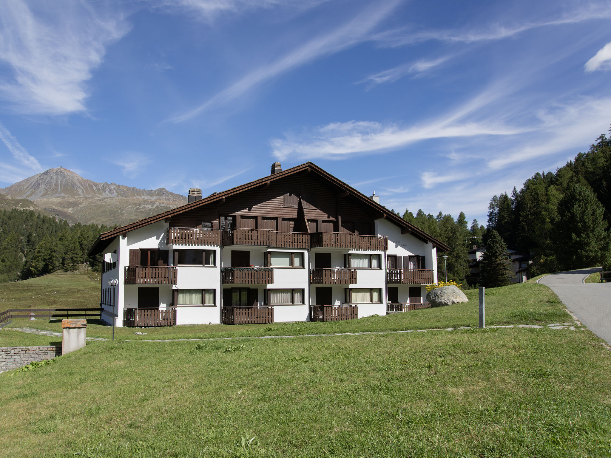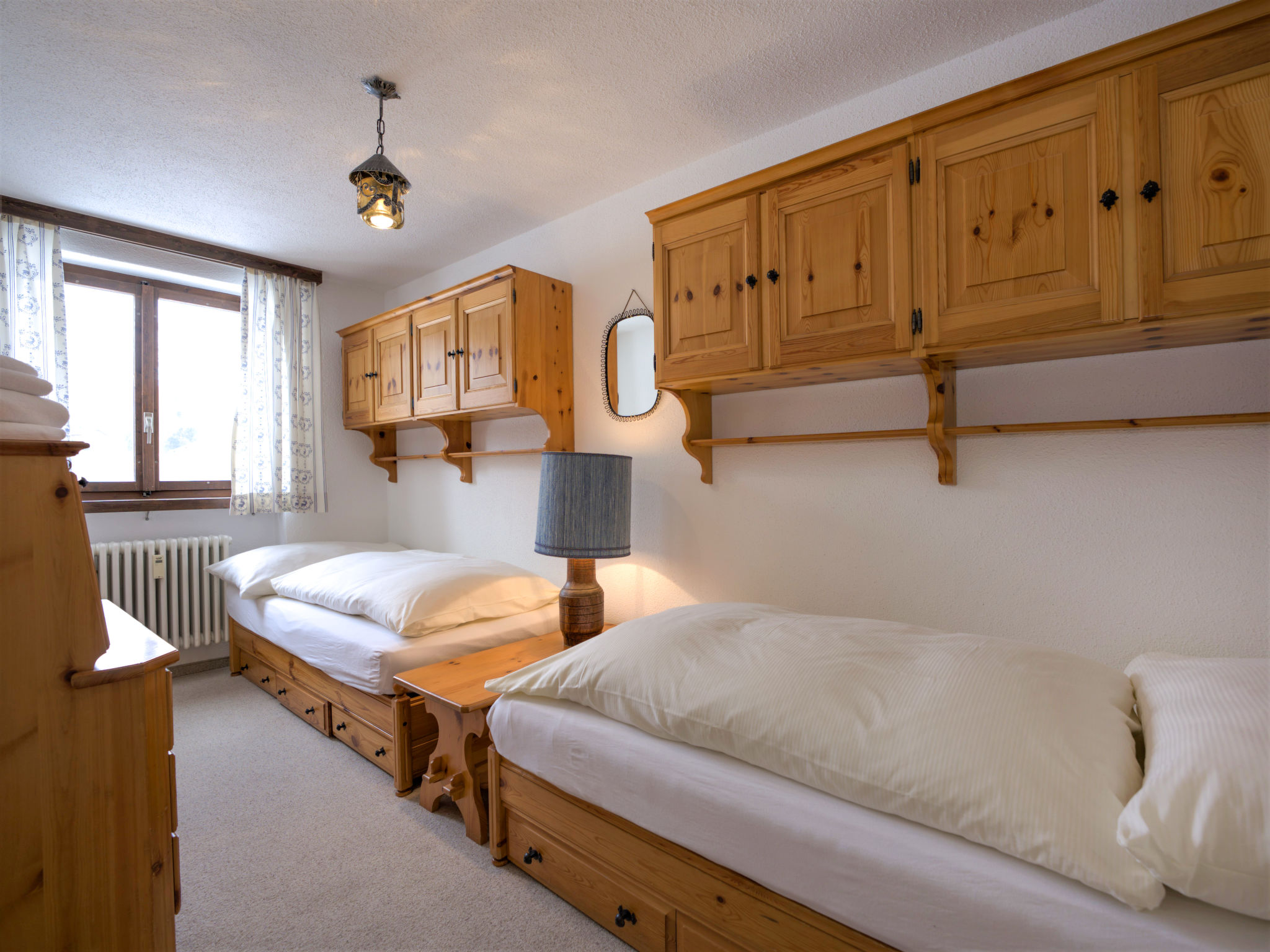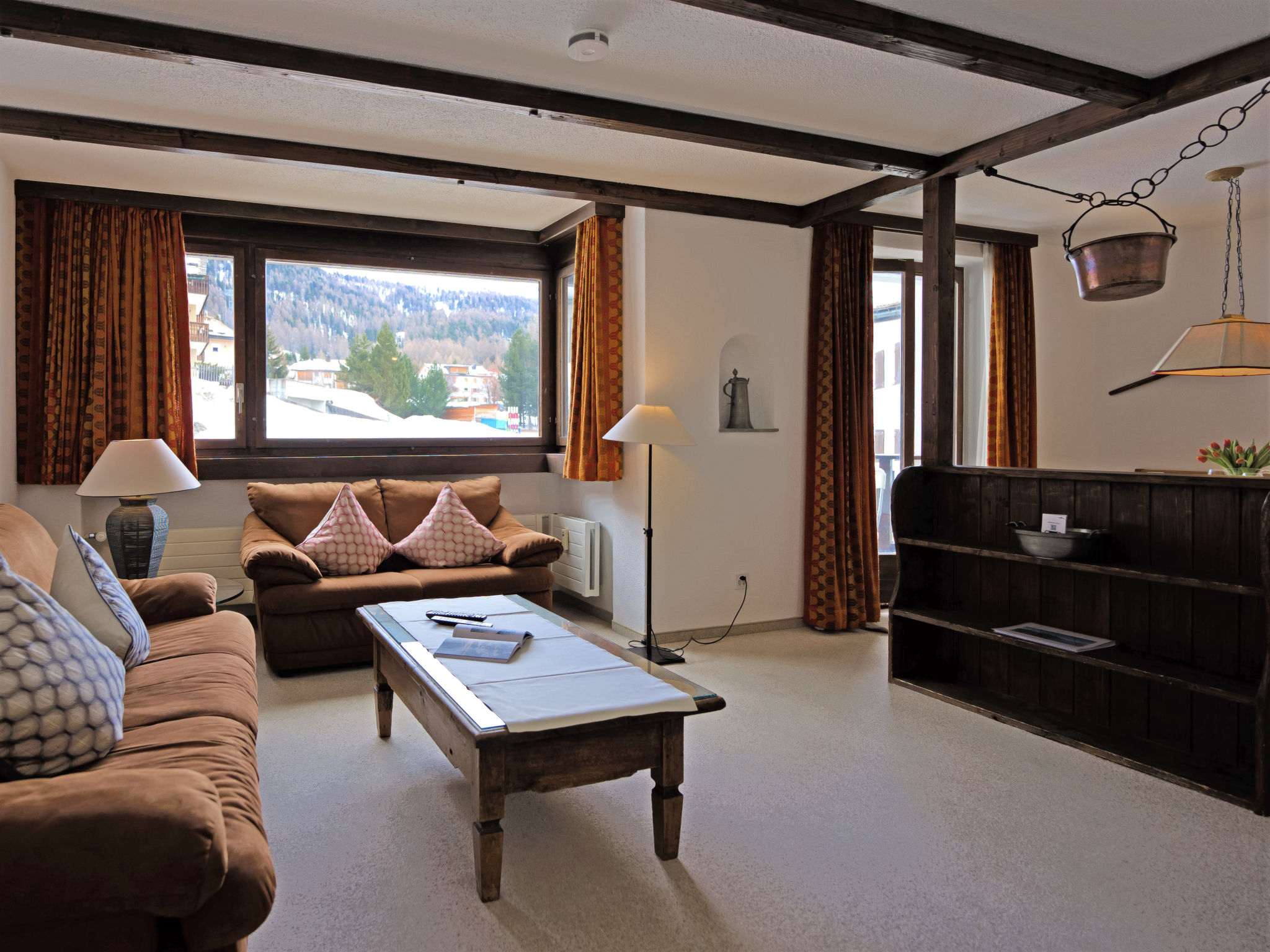 "Chesa Linaria", 3-Zimmer-Wohnung 70 m2, im erhöhten Erdgeschoss. Einfach eingerichtet: Wohnzimmer mit Essecke und TV (Flachbildschirm). Ausgang zum Balkon, Richtung Süden. 1 Zimmer mit 1 Doppelbett (2 x 90 cm, Länge 185 cm). 1 kleines Zimmer mit 2 Betten (90 cm, Länge 190 cm). Küche (Backofen, Geschirrspüler, Toaster, Wasserkocher, elektrische Kaffeemaschine, Kapseln für die Kaffeemaschine (Nespresso) extra, Racletteofen, Fondue Set (Chinoise)) mit Durchreiche. Bad/WC, Dusche/Bidet/WC. Heizung. Kleiner Balkon. Terrassenmöbel. Schöne Sicht auf die Berge. Zur Verfügung: Bügeleisen, Haartrockner. Internet (Wireless LAN, gratis). Garage Nr. 9 (small!), Höhe 205 cm, Breite 190 cm. Maximal 1 Haustier/Hund erlaubt. 756.8668.2733.01