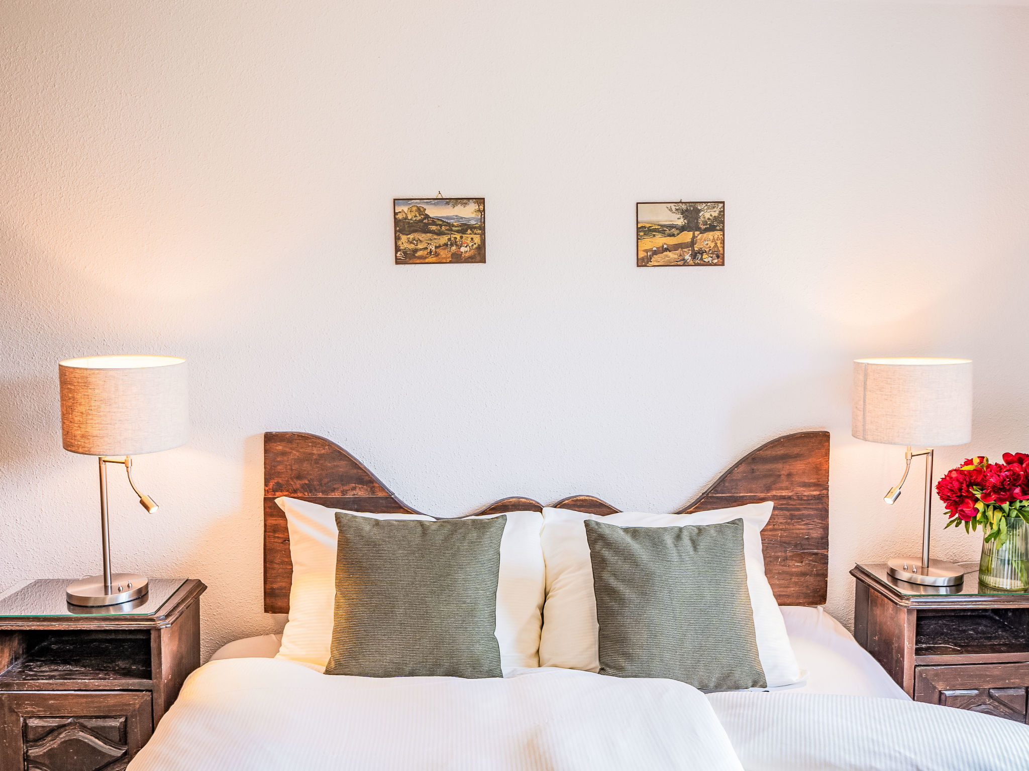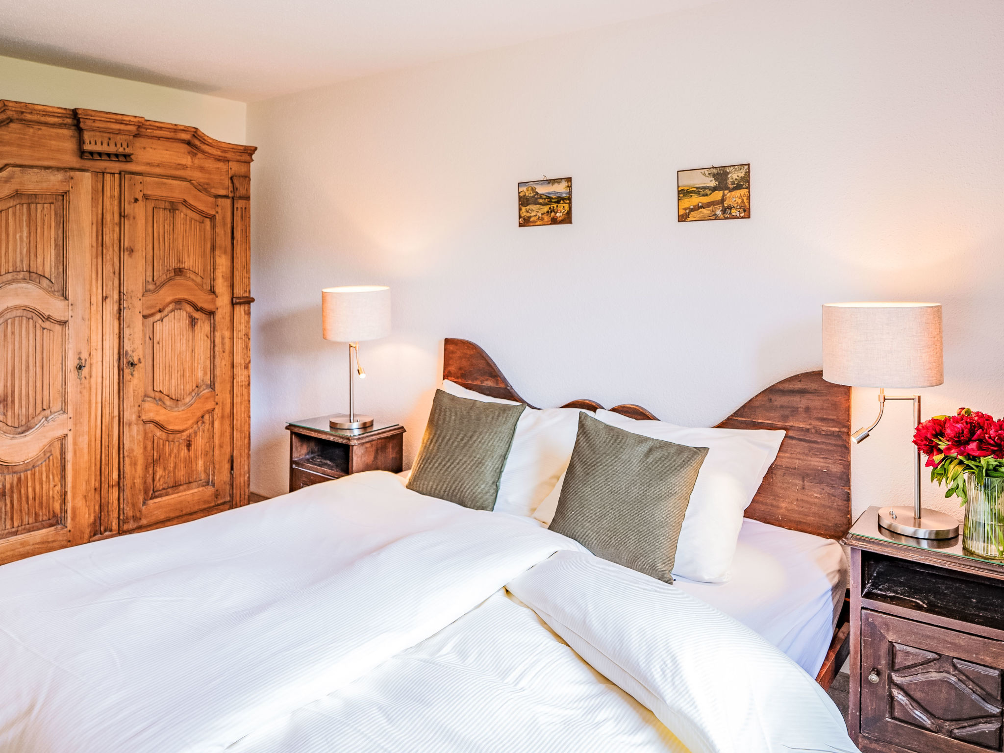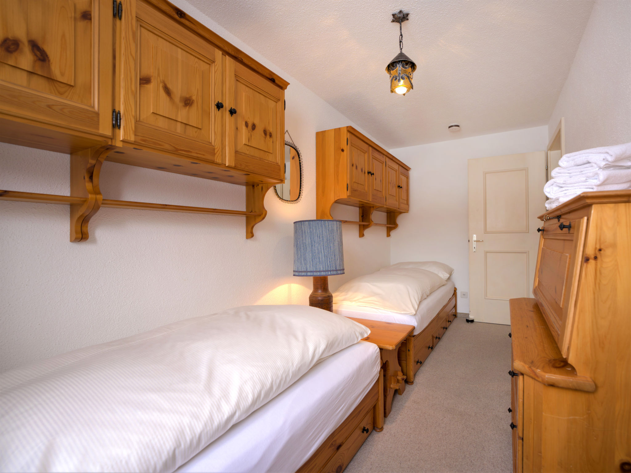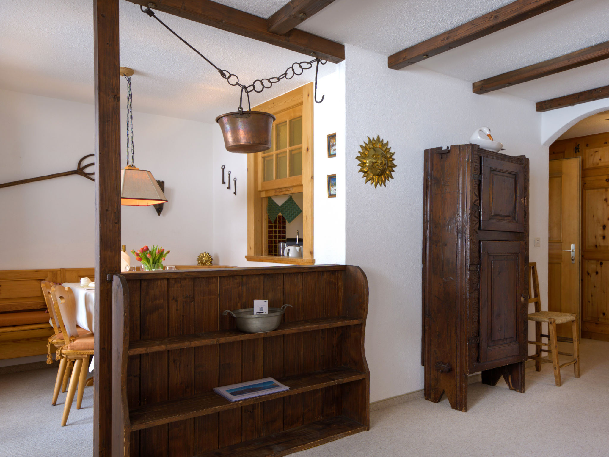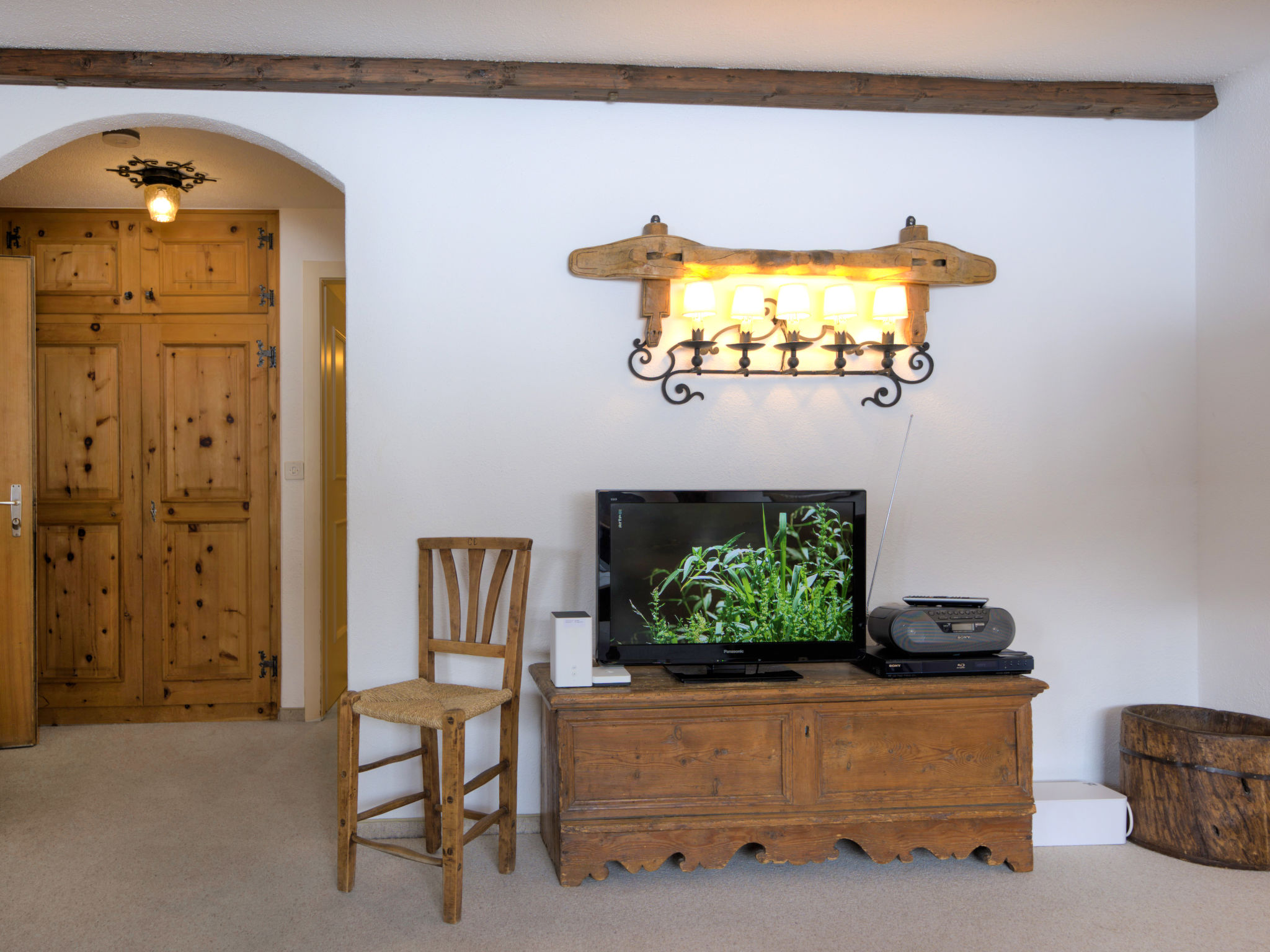 "Chesa Linaria", 3-Zimmer-Wohnung 70 m2, im erhöhten Erdgeschoss. Einfach eingerichtet: Wohnzimmer mit Essecke und TV (Flachbildschirm). Ausgang zum Balkon, Richtung Süden. 1 Zimmer mit 1 Doppelbett (2 x 90 cm, Länge 185 cm). 1 kleines Zimmer mit 2 Betten (90 cm, Länge 190 cm). Küche (Backofen, Geschirrspüler, Toaster, Wasserkocher, elektrische Kaffeemaschine, Kapseln für die Kaffeemaschine (Nespresso) extra, Racletteofen, Fondue Set (Chinoise)) mit Durchreiche. Bad/WC, Dusche/Bidet/WC. Heizung. Kleiner Balkon. Terrassenmöbel. Schöne Sicht auf die Berge. Zur Verfügung: Bügeleisen, Haartrockner. Internet (Wireless LAN, gratis). Garage Nr. 9 (small!), Höhe 205 cm, Breite 190 cm. Maximal 1 Haustier/Hund erlaubt. 756.8668.2733.01