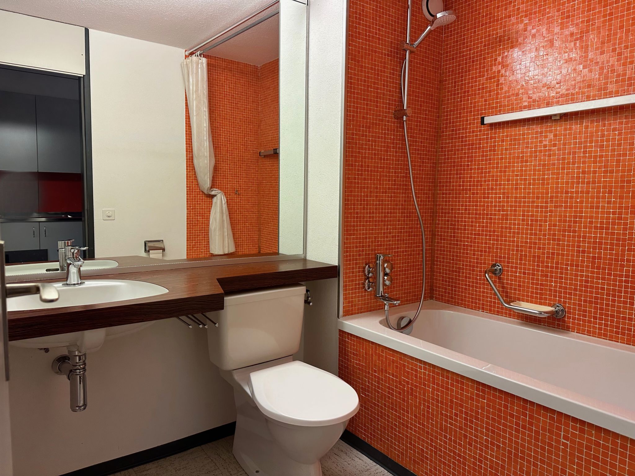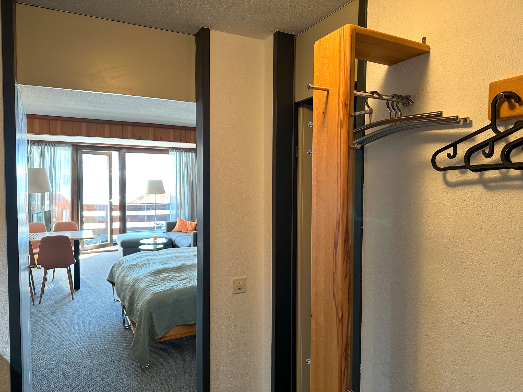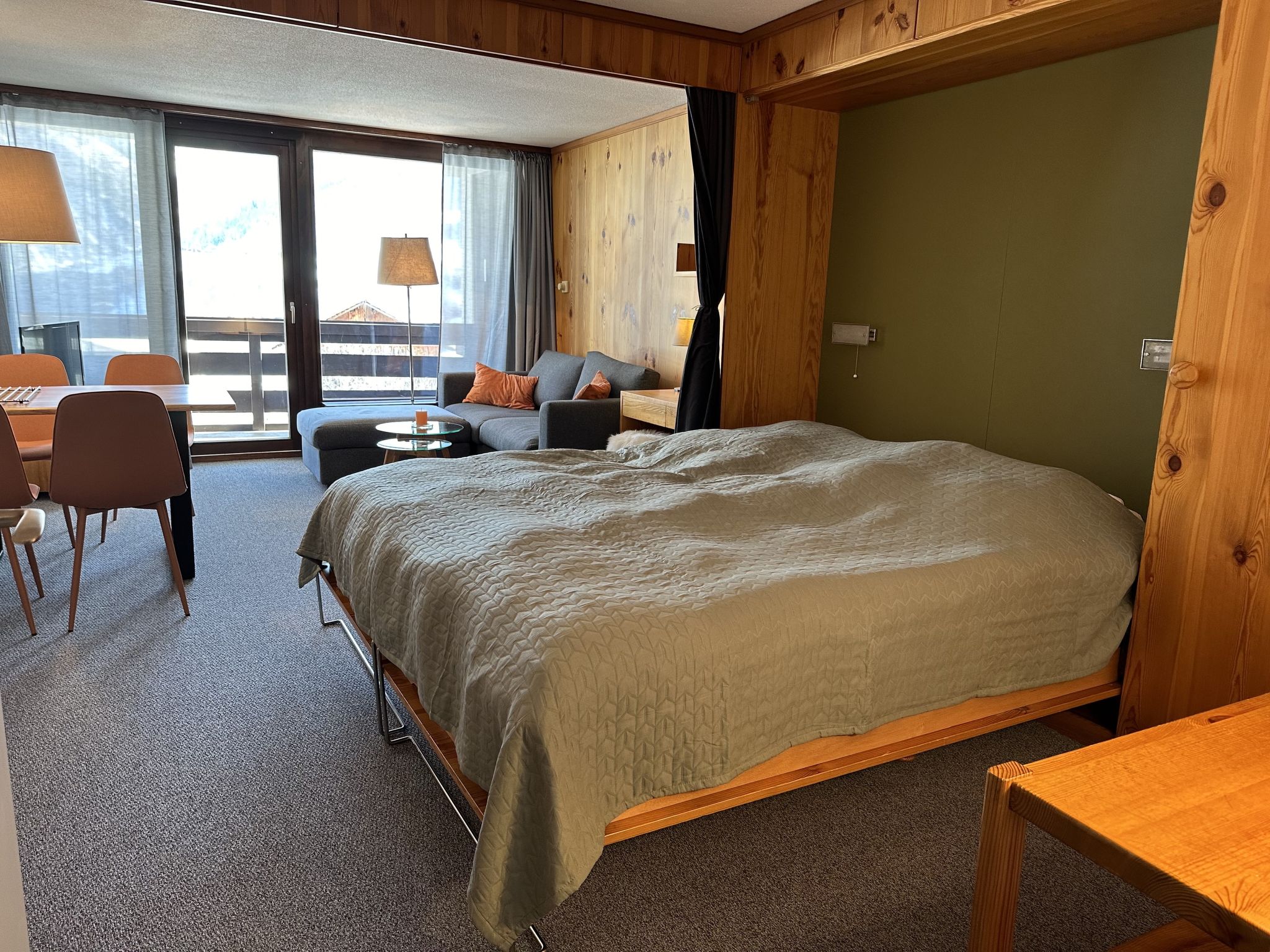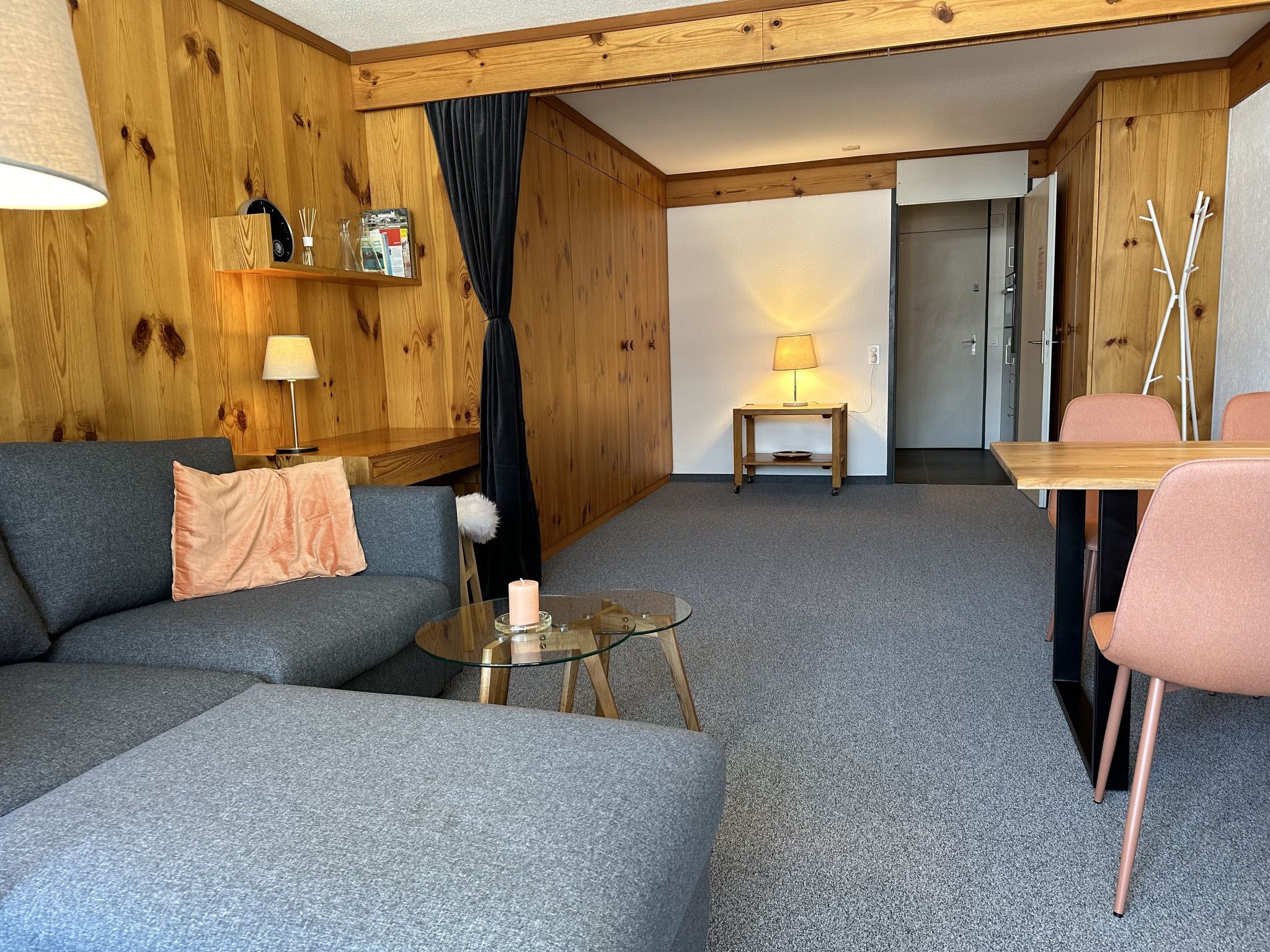 "Apt B 033", 1-Zimmer-Wohnung 39 m2 im 3. Stock. Objekt geeignet für 2 Erwachsene + 2 Kinder. Vollständig renoviert im Jahre 2023, komfortabel und gemütlich eingerichtet: Wohn-/Esszimmer mit 1 Diwanbett (140 cm, Länge 200 cm), 2 Wandschrankbetten (90 cm, Länge 200 cm), Kabel-TV (Flachbildschirm). Ausgang zum Balkon. Kochnische im Eingang (Geschirrspüler, 2 Glaskeramikplatten, Kombinationsmikrowelle). Bad/WC. Balkon, Südlage. Balkonmöbel. Schöne Sicht auf die Berge, die Landschaft und Medelsergletscher. Zur Verfügung: Internet (Wireless LAN, gratis). Bitte beachten: Nichtraucher-Unterkunft.