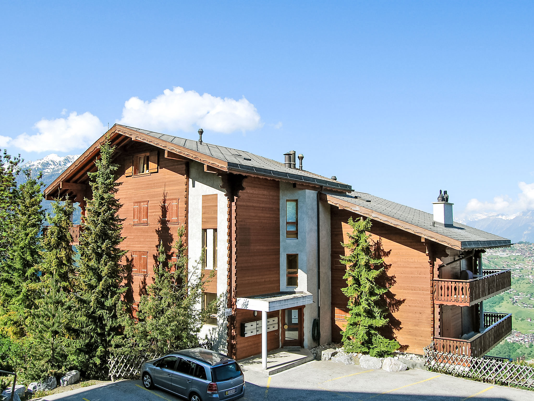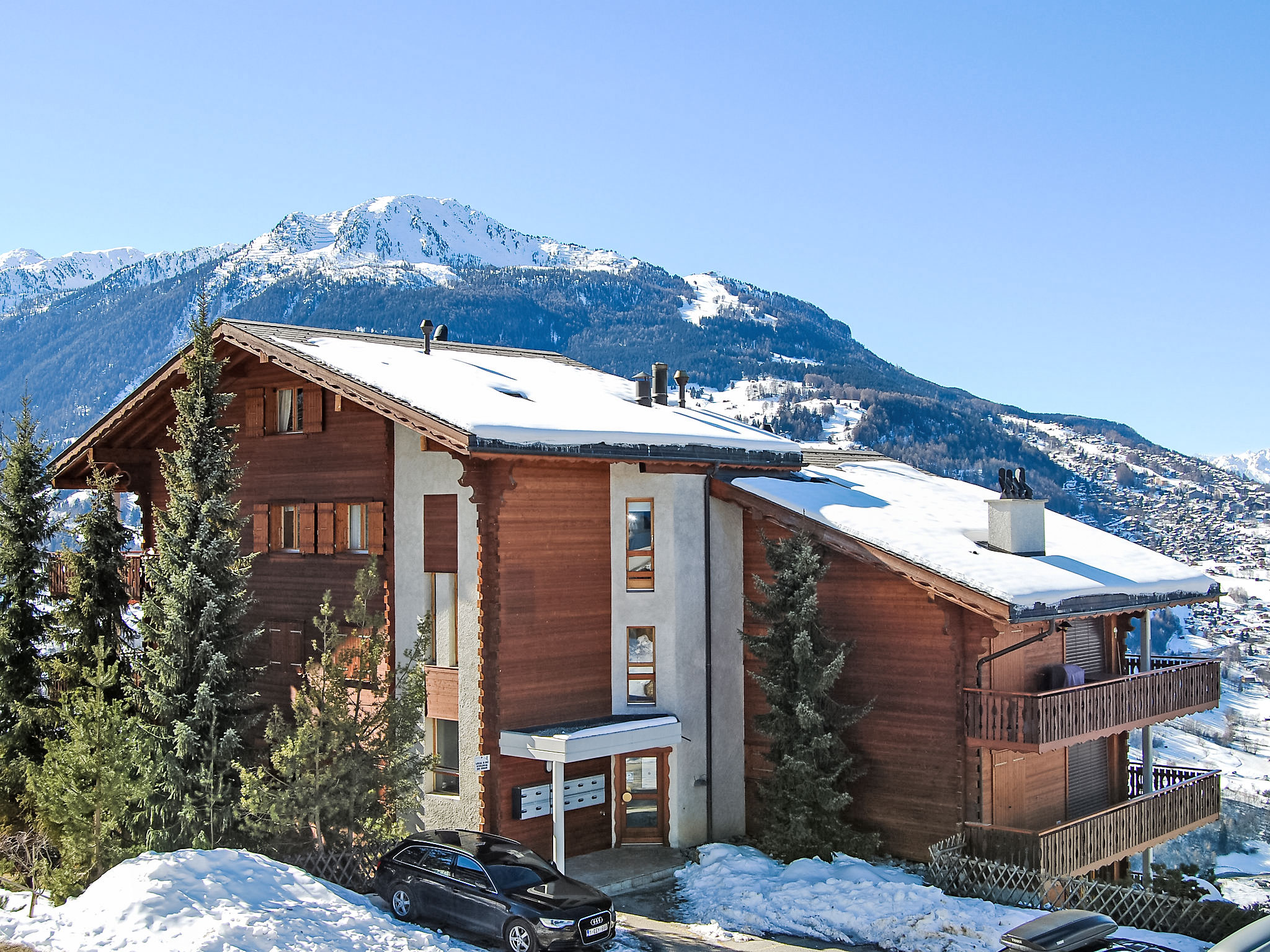 Veysonnaz: Appartementhaus "Les Cretes II", 1'350 m.ü.M.. 200 m vom Zentrum, ruhige Lage. Im Hause: Fahrstuhl, Zentralheizung, Waschmaschine, Wäschetrockner (zur Mitbenutzung, extra). Öffentliches Parkhaus in 800 m, extra. Einkaufsgeschäft, Restaurant 200 m, Bushaltestelle"Principal Veysonnaz" 500 m, Hallenbad 200 m. Skisportanlagen 800 m, Skibushaltestelle 100 m. Bekannte Skigebiete sind gut erreichbar: "4 Vallées" (Télécabine de Veysonnaz) 800 m. Bitte beachten: Gratis Skibus. Weitere Unterkünfte sind buchbar.