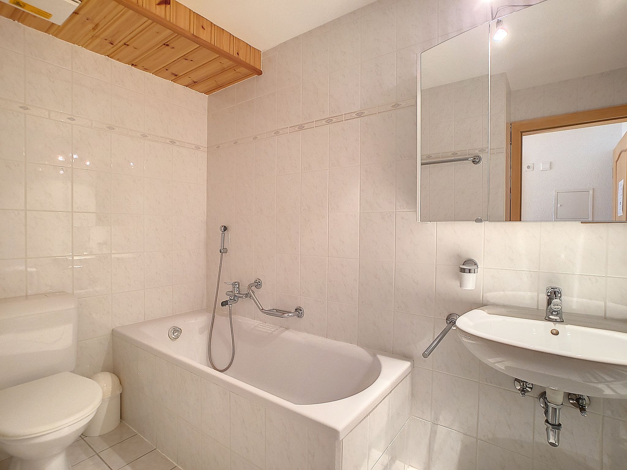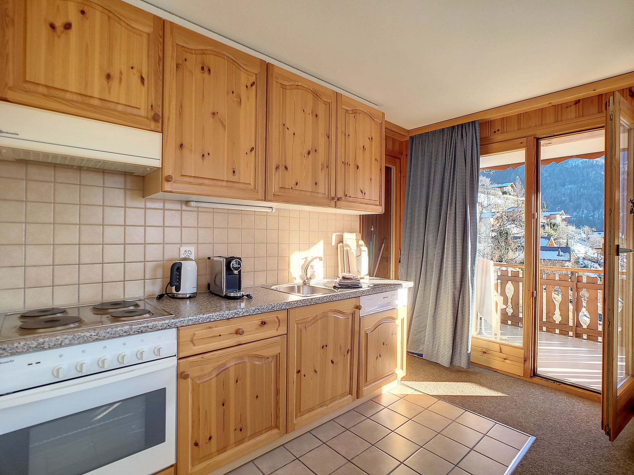 3-Zimmer-Wohnung 58 m2 im 2. Stock. Komfortabel eingerichtet: Wohn-/Esszimmer mit offenem Kamin und Kabel-TV. Ausgang zum Balkon. 1 Zimmer mit 2 Betten (90 cm, Länge 190 cm). 1 Zimmer mit 1 Bett (90 cm, Länge 190 cm), 1 x 2 Etagenbetten (90 cm, Länge 190 cm). Offene Küche (Backofen, Geschirrspüler, 4 Glaskeramikplatten, elektrische Kaffeemaschine, Kapseln für die Kaffeemaschine (Nespresso) extra). Bad/WC, Dusche/WC. Grosser Balkon, Südlage und Westlage. Balkonmöbel. Schöne Sicht auf die Berge. Zur Verfügung: Internet (WLAN, gratis). Bitte beachten: Nichtraucher-Unterkunft, kein Parkplatz.