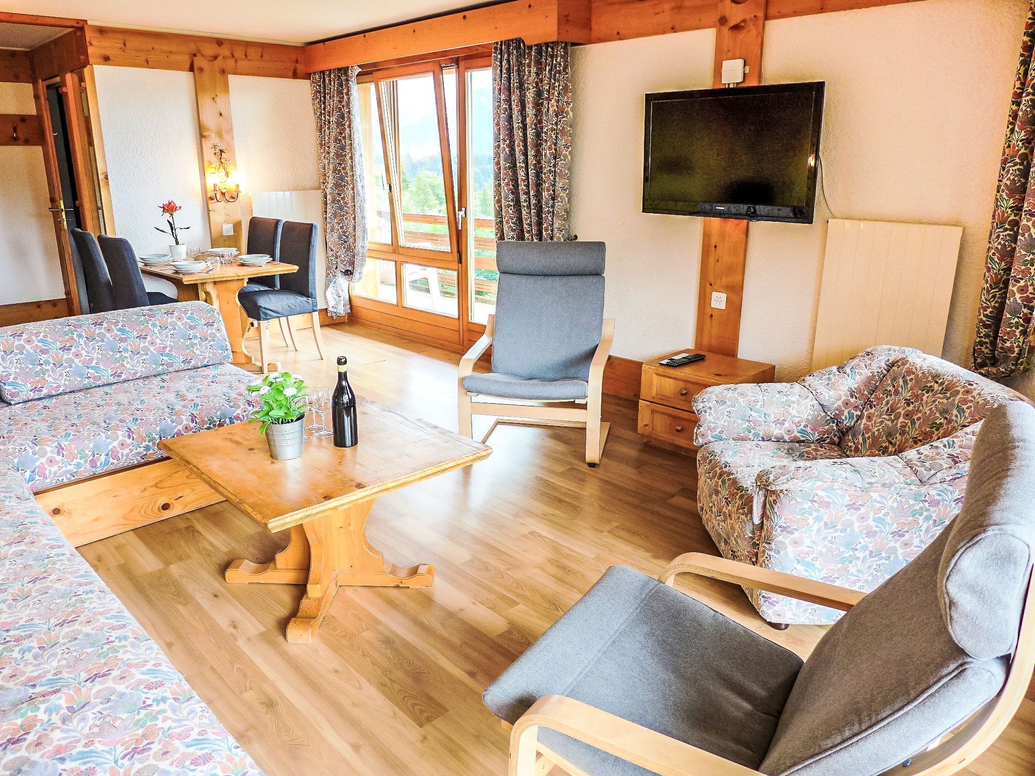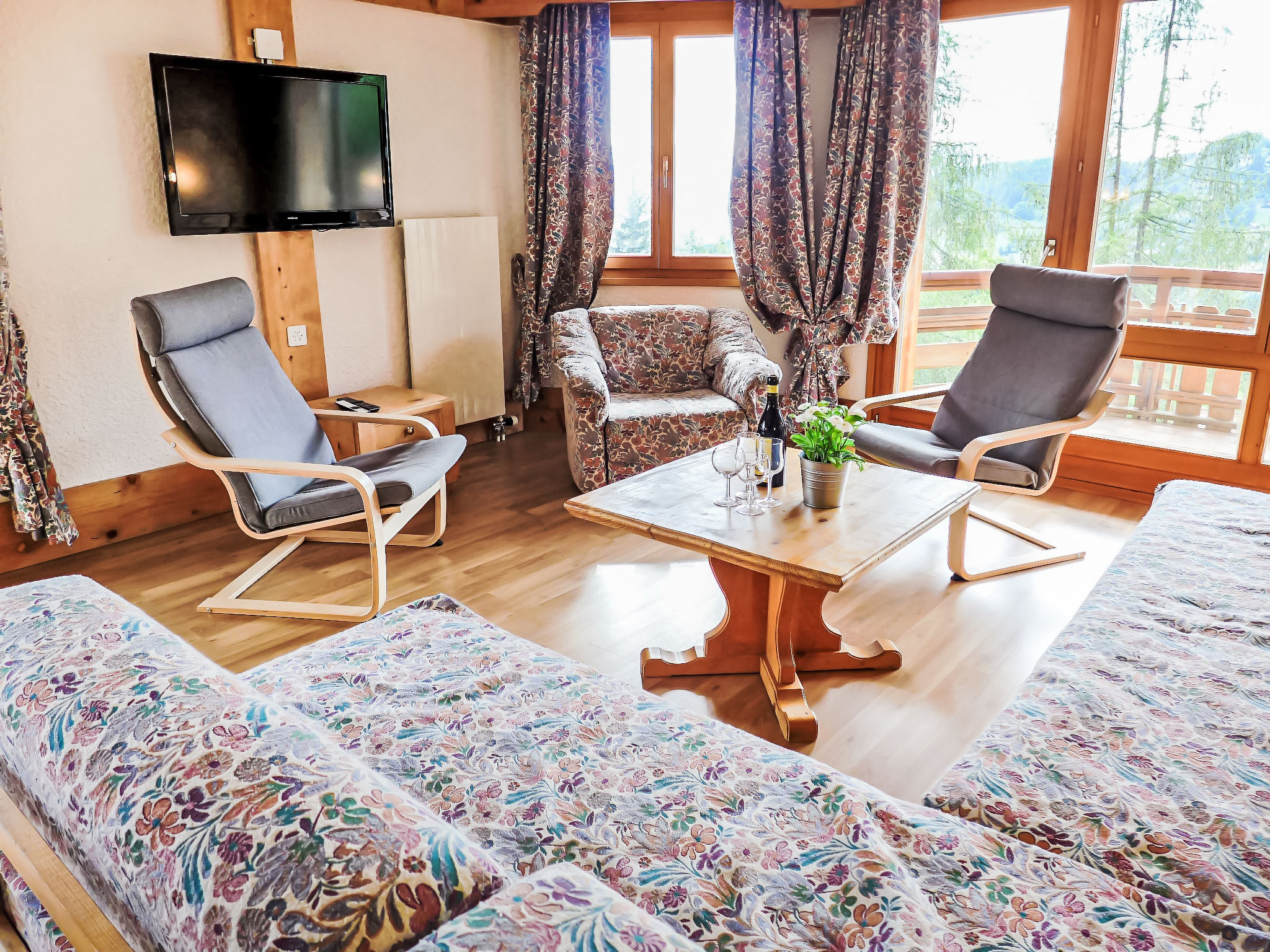 "Le Bristol A20", 3-Zimmer-Wohnung 77 m2 im 2. Stock. Geräumig, komfortabel und schön eingerichtet: Wohn-/Esszimmer mit 2 Diwanbetten (90 cm), Esstisch, Bad/WC und TV (Flachbildschirm). Ausgang zum Balkon, Richtung Süden und Richtung Westen. 1 Doppelzimmer mit 1 Doppelbett (140 cm), Dusche/WC. Ausgang zum Balkon, Richtung Süden. 1 Zimmer mit 2 Betten (90 cm), Bad/WC. Ausgang zum Balkon, Richtung Westen. Kochnische im Eingang (2 Kochplatten, Backofen, Geschirrspüler, Toaster, Wasserkocher, Mikrowelle, elektrische Kaffeemaschine, Racletteofen, Fondue Set (Käse)). Parkettboden. Grosser Balkon 20 m2, Südlage und Westlage. Balkonmöbel. Sehr schöne Panoramasicht auf die Berge und das Tal. Zur Verfügung: Haartrockner. Internet (WLAN, gratis). Bitte beachten: Nichtraucher-Unterkunft.