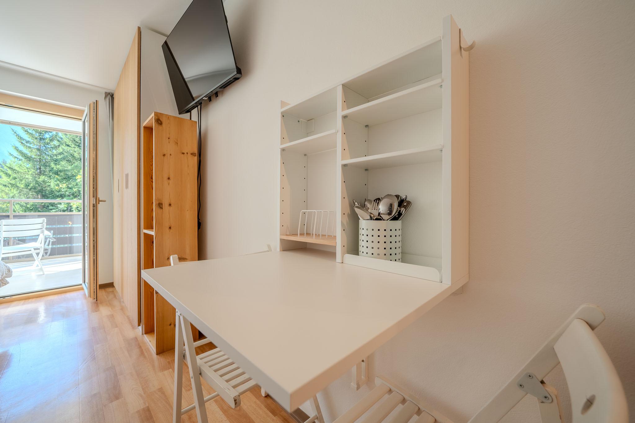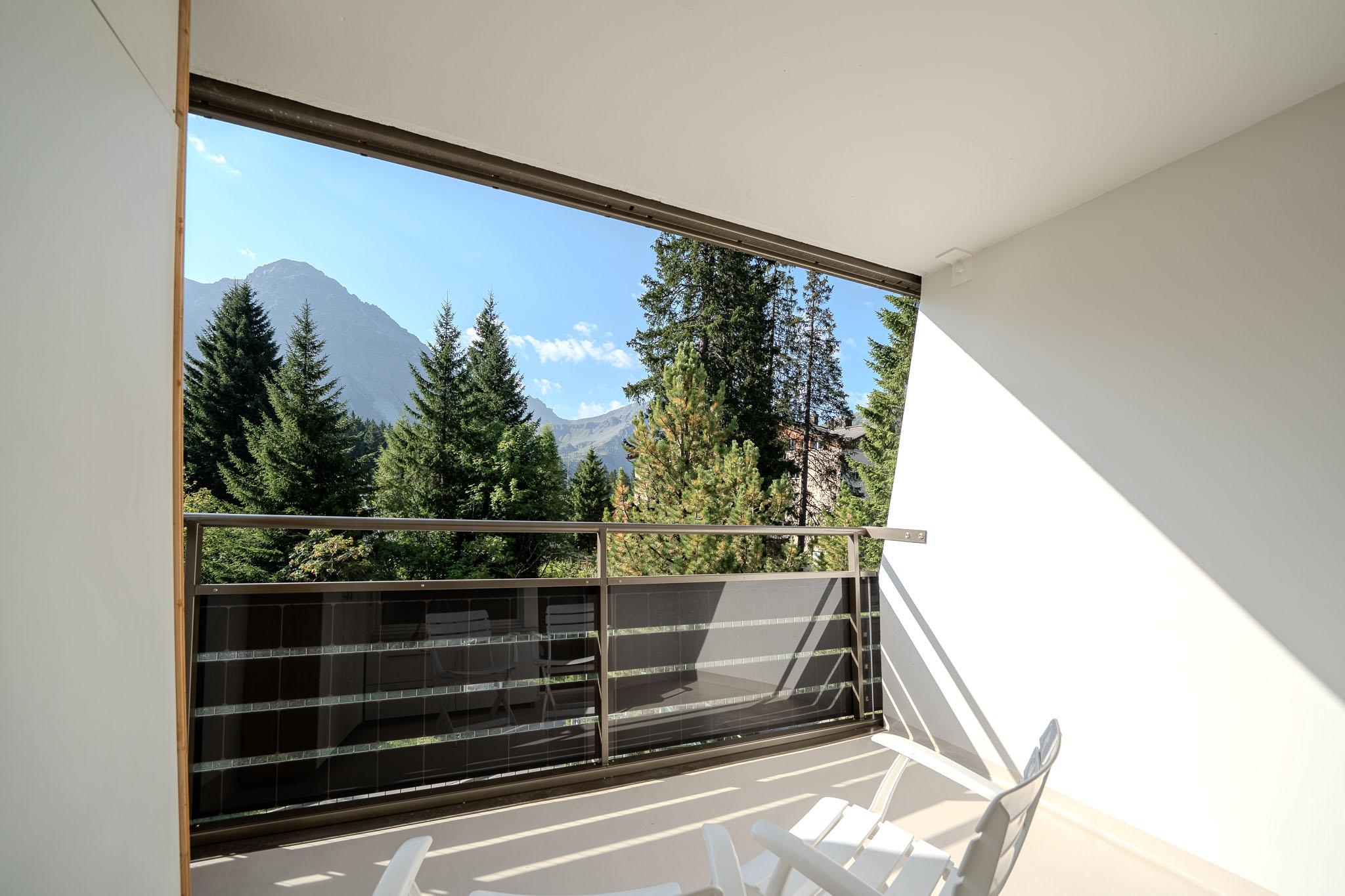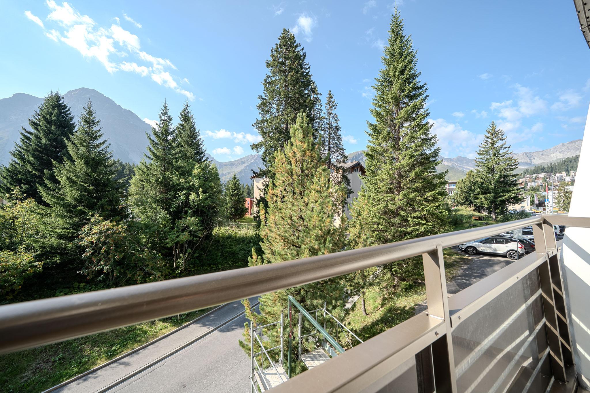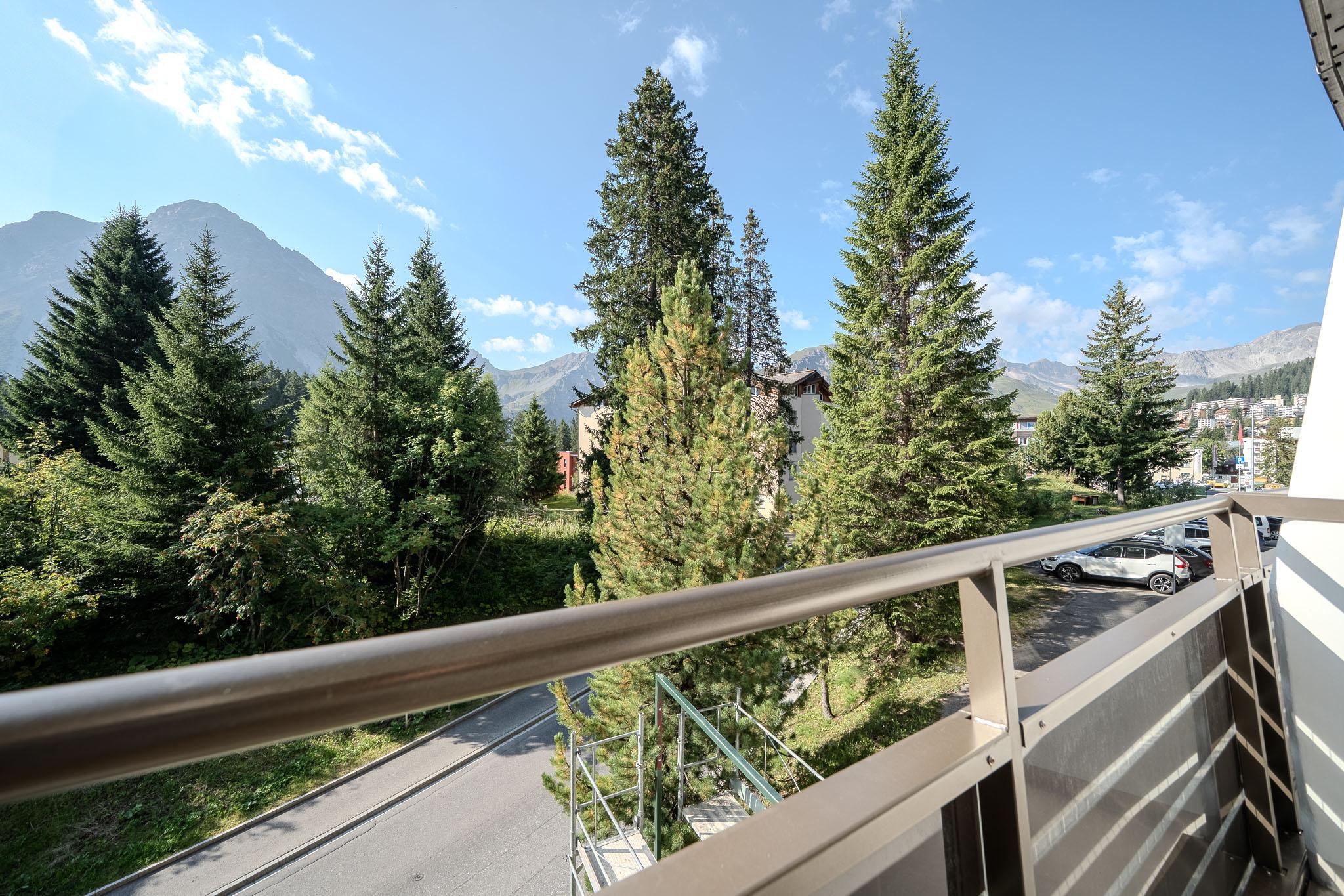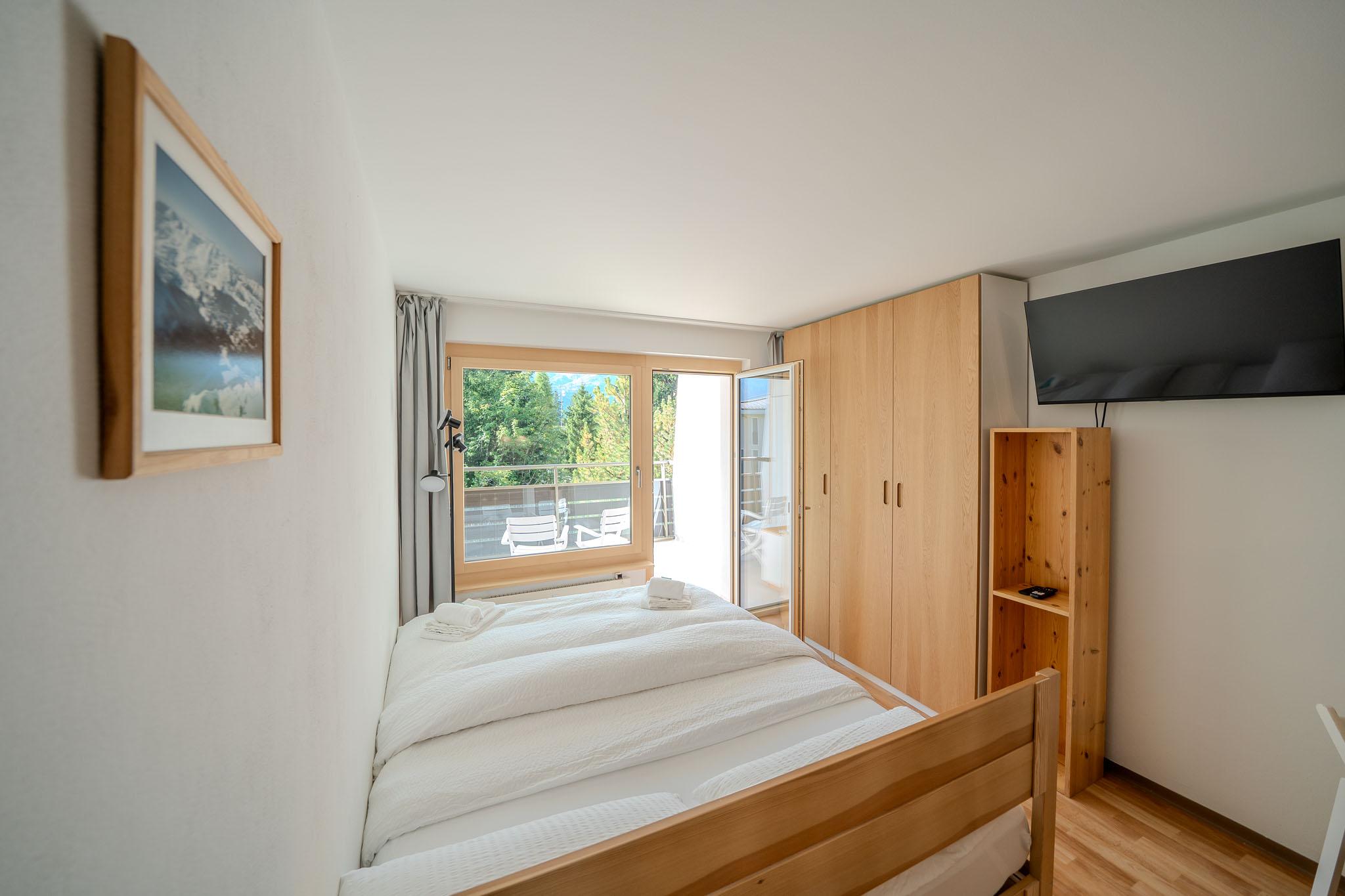 Unsere Wohnung im Haus Alexandra ist ein gemütliches Studio mit Doppelbett und Balkon mit Bergblick im Zentrum von Arosa.