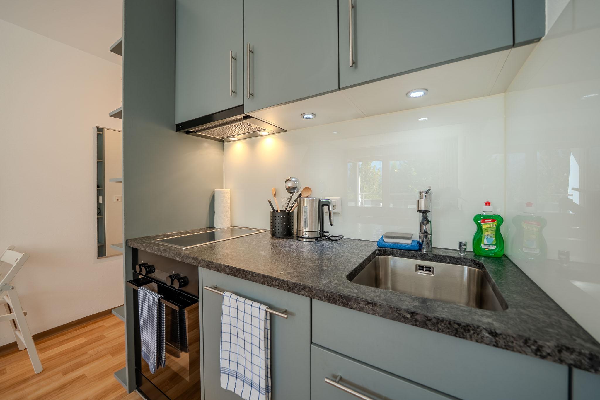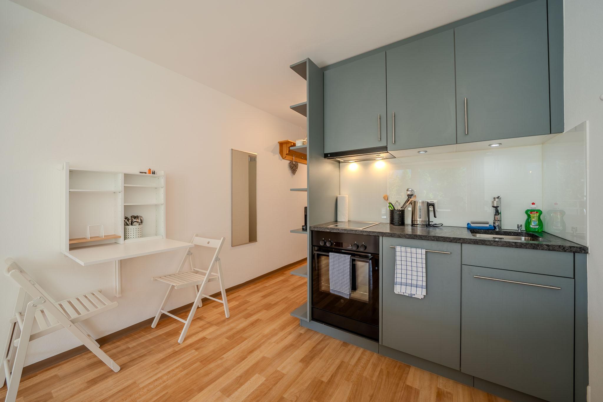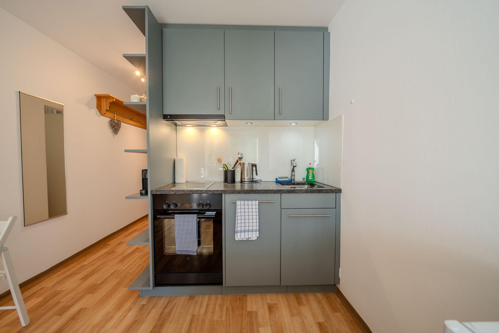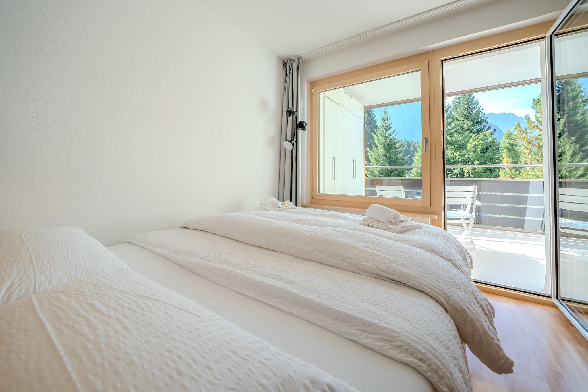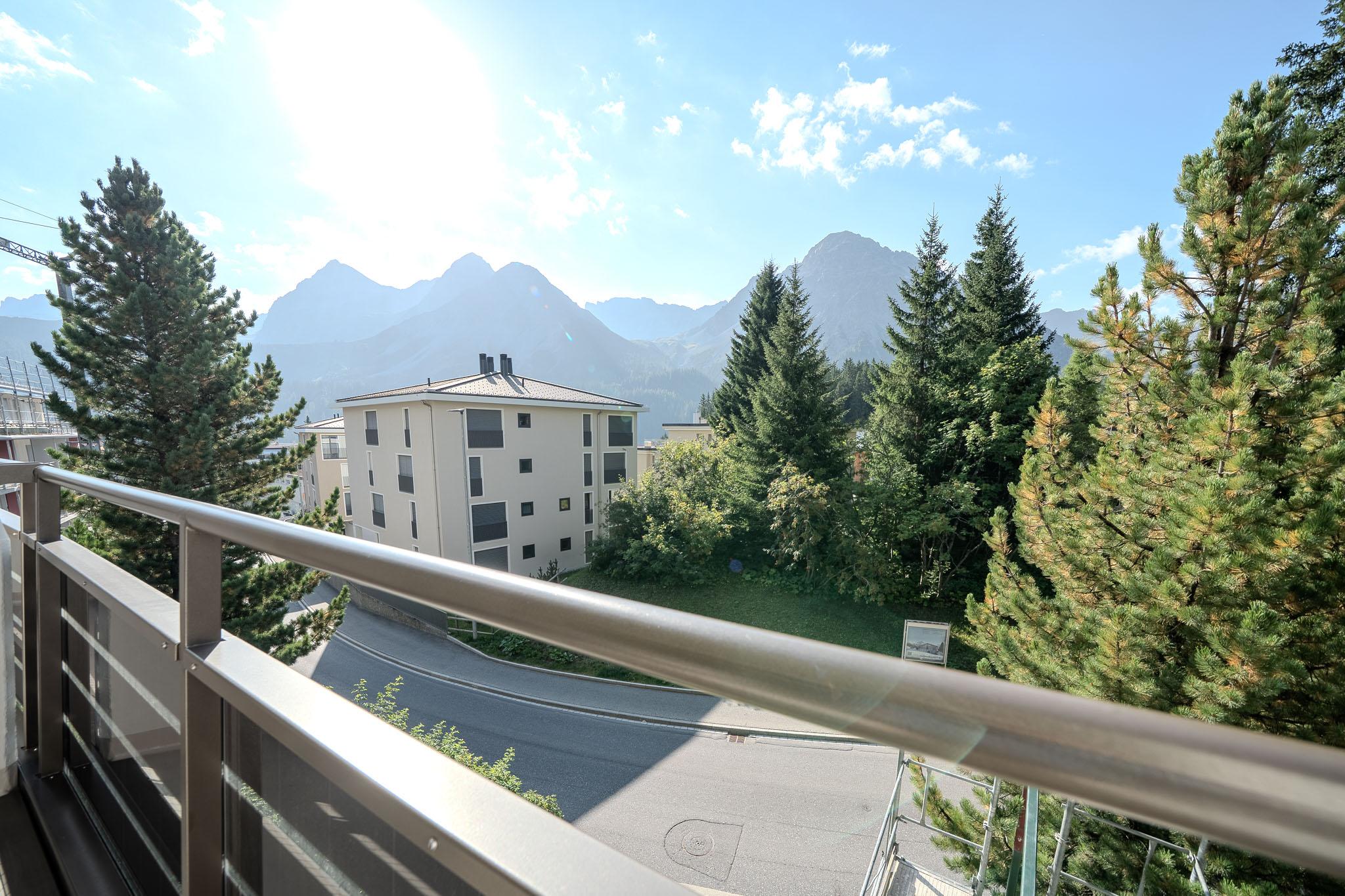 Unsere Wohnung im Haus Alexandra ist ein gemütliches Studio mit Doppelbett und Balkon mit Bergblick im Zentrum von Arosa.