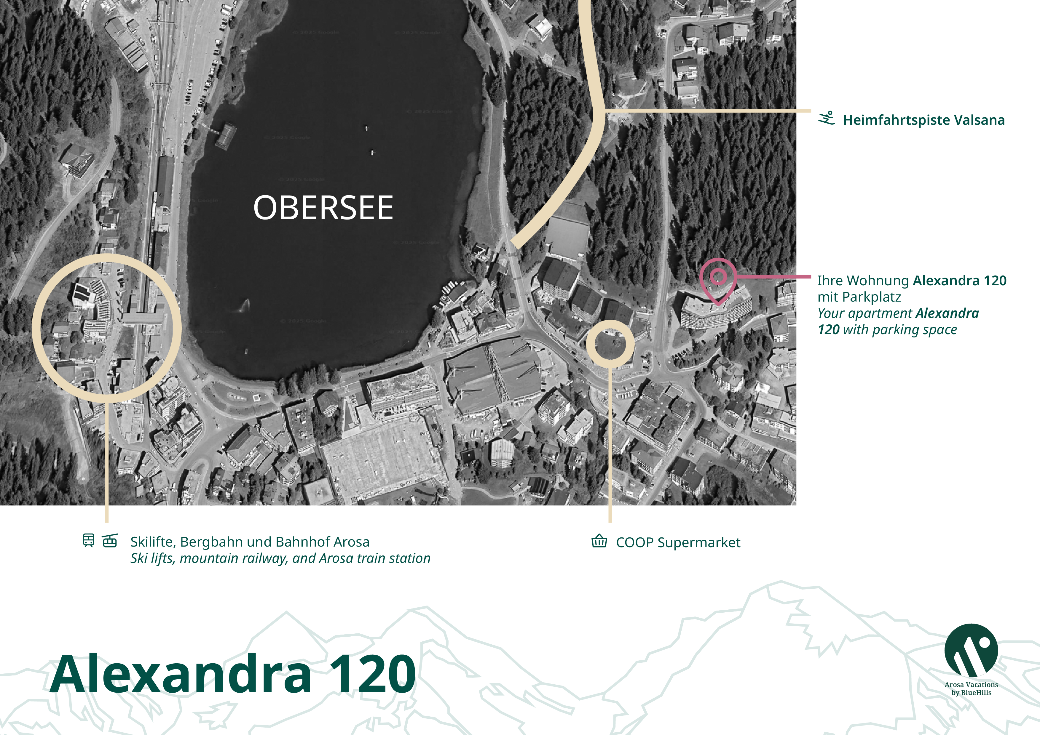 Direkt am Ortseingang von Arosa und im Zentrum, mit dem Coop gleich nebenan, Bushaltestelle und nur wenige Gehminuten vom Bahnhof, dem Obersee sowie allen Geschäften und Restaurants im Zentrum.