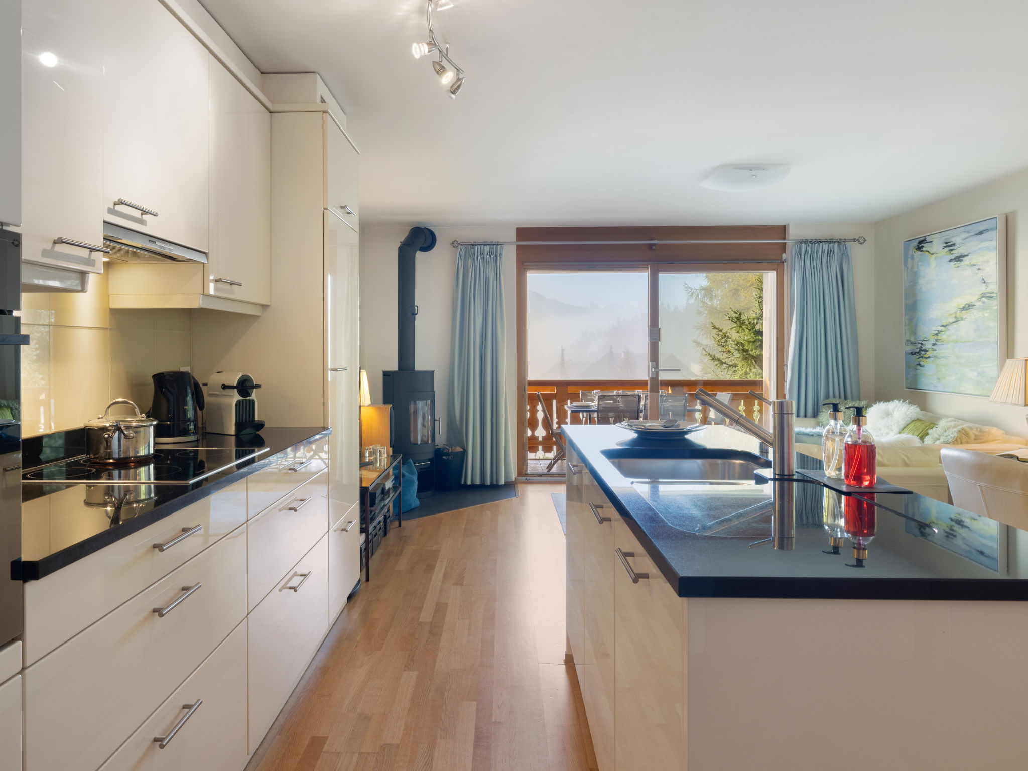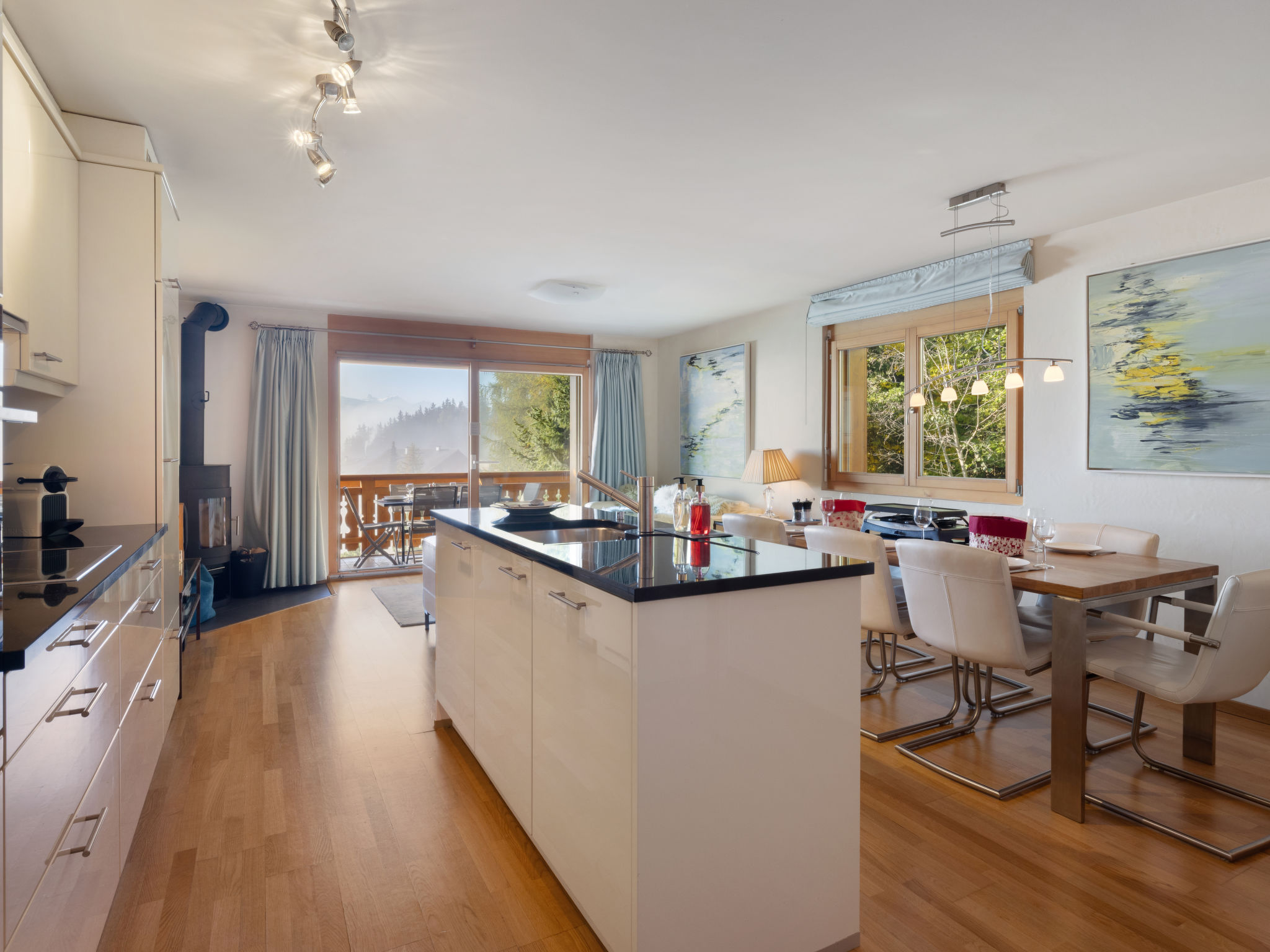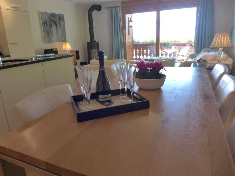 "Résidence Orana 3", 3-Zimmer-Wohnung 82 m2 im 1. Stock. Objekt geeignet für 4 Erwachsene + 2 Kinder. Komfortabel und schön eingerichtet: Wohn-/Esszimmer mit 1 Diwanbett (135 cm, Länge 190 cm), Kabel-TV, Flachbildschirm, CD, Stereoanlage, DVD, DVD Sammlung vorhanden, Heimkino und Holzofen. Ausgang zum Balkon, Richtung Süden. 1 Zimmer, Richtung Norden mit 2 Betten (90 cm, Länge 200 cm), Bad/WC. Ausgang zur Terrasse. 1 Zimmer, Richtung Norden mit 1 Doppelbett (150 cm, Länge 190 cm), Dusche/WC. Ausgang zur Terrasse. Offene Küche (Backofen, Geschirrspüler, 4 Glaskeramikplatten, Toaster, Wasserkocher, Mikrowelle, elektrische Kaffeemaschine, Kapseln für die Kaffeemaschine (Nespresso) extra, Racletteofen, Fondue Set (Chinoise, Käse)) mit Esstisch. Fussbodenheizung. Grosser Balkon, Südlage und Westlage, grosse Terrasse, Nordlage. Balkonmöbel, Gartengrill (mobil), Liegestühle (2). Sehr schöne Sicht auf die Berge. Zur Verfügung: Bügeleisen, Haartrockner. Internet (WLAN, gratis). Garage Nr. 3J & 3K (2 Autos), Höhe 210 cm, Breite 250 cm. Bitte beachten: Nichtraucher-Unterkunft. Terrasse mit Kieselsteinen im Rohzustand.