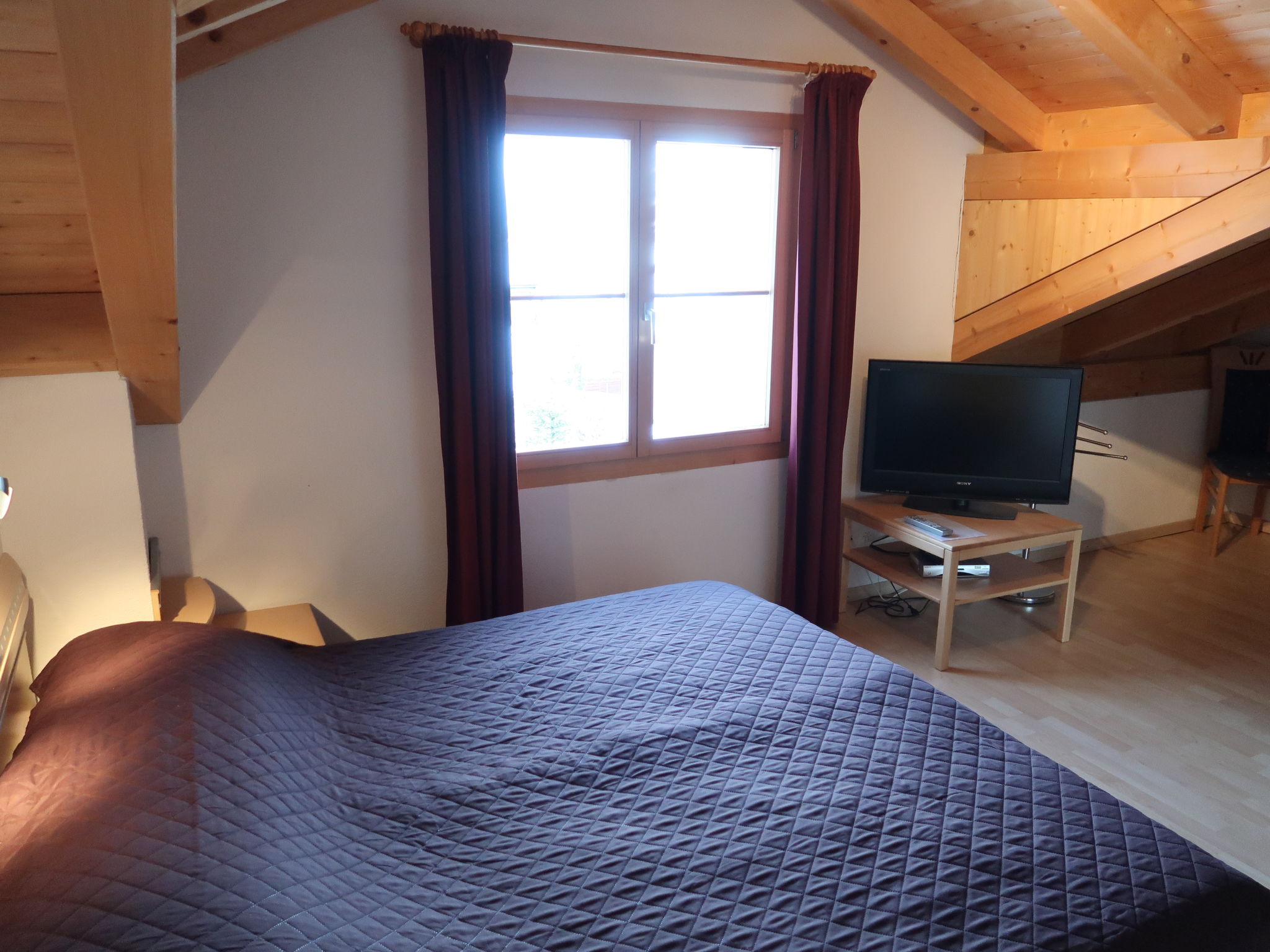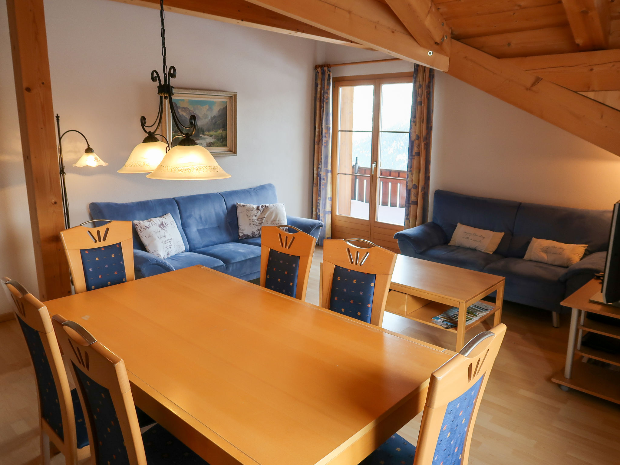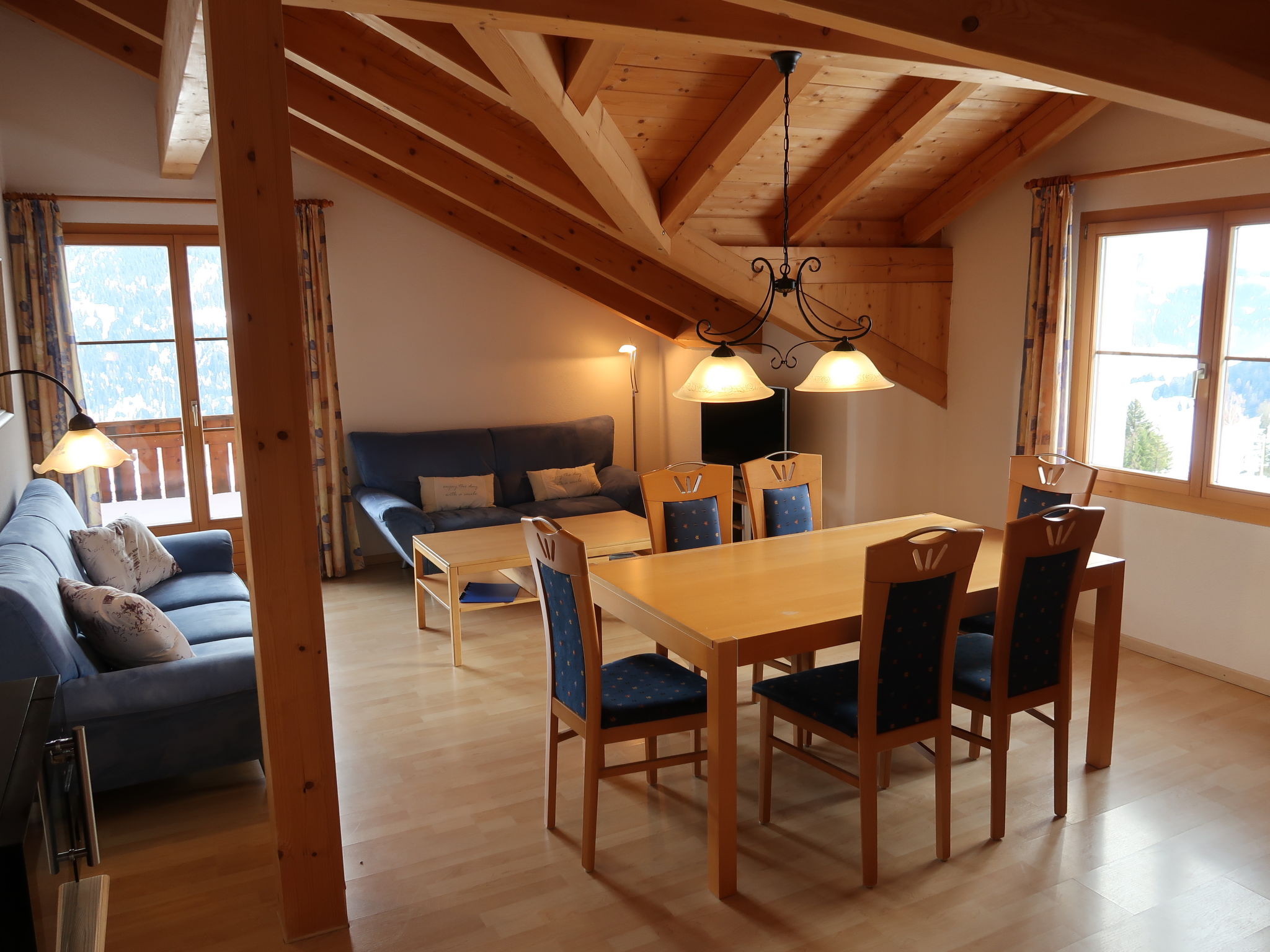 "Tga Stgirat Dachgeschoss", 3-Zimmer-Wohnung 82 m2 im 2. Stock. Komfortabel und geschmackvoll eingerichtet: Wohn-/Esszimmer mit 1 Diwanbett und Sat-TV (Flachbildschirm), DVD. Ausgang zum Balkon. 1 Zimmer mit 1 Bett und 1 Doppelbett. 1 Doppelzimmer. Offene Küche (Backofen, Geschirrspüler, 4 Glaskeramikplatten, Toaster, Wasserkocher, Mikrowelle, elektrische Kaffeemaschine, Racletteofen, Fondue Set (Käse)). Dusche/WC, sep. WC. Balkon 10 m2. Balkonmöbel. Schöne Sicht auf die Berge, das Tal und die Landschaft. Zur Verfügung: Haartrockner. Internet (WLAN, gratis). Parkplatz (1 Auto), Garage (extra). Bitte beachten: Nichtraucher-Unterkunft. Maximal 1 Haustier/Hund erlaubt.