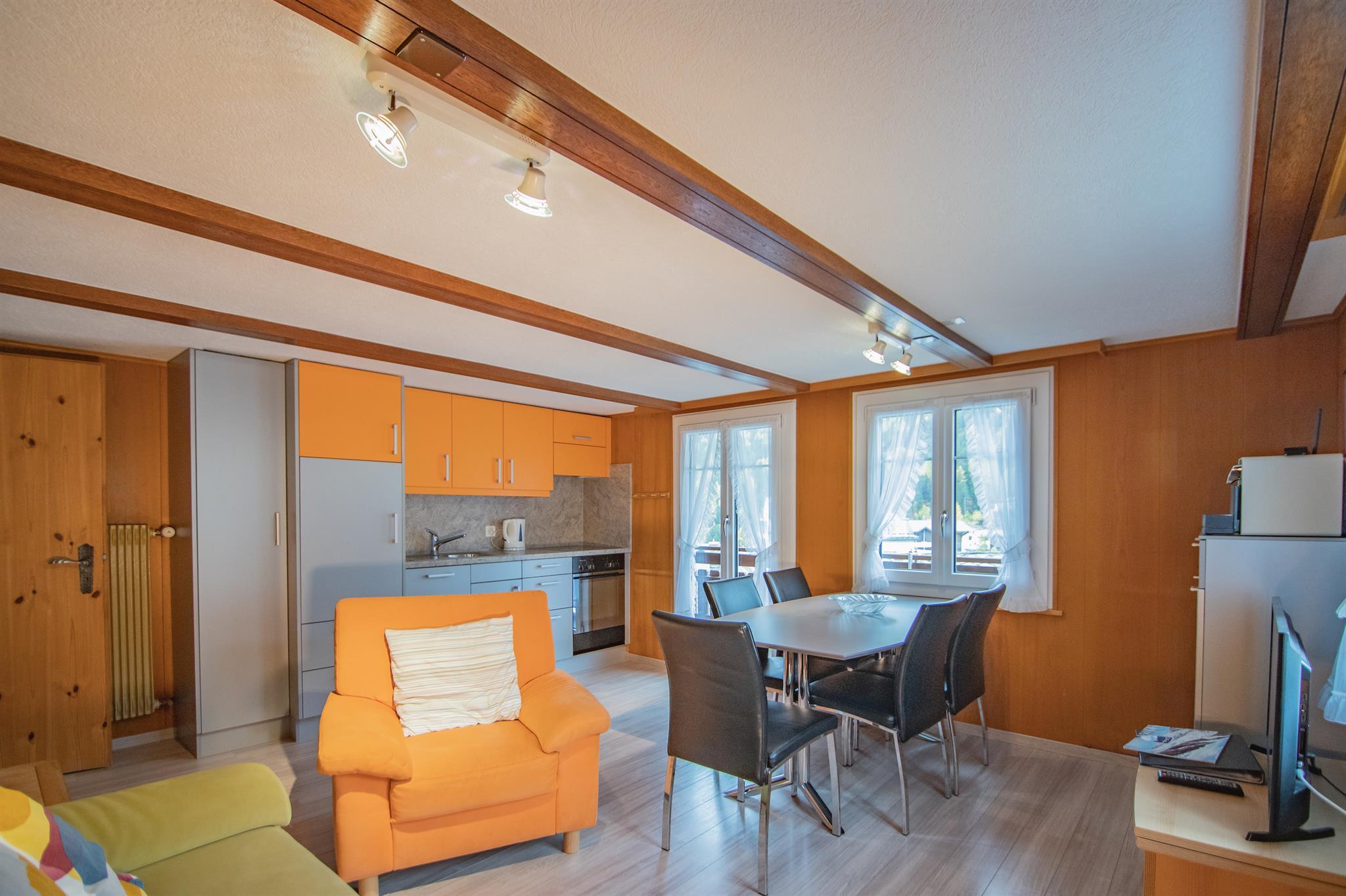 Unsere Ferienwohnungen sind gemütlich und komfortabel eingerichtet und bieten einen Balkon mit herrlichem Blick auf die beeindruckenden Saaser Berge. Jede Wohnung ist mit modernen Annehmlichkeiten ausgestattet, darunter ein Geschirrspüler, Wasserkocher, eine Kapselkaffeemaschine (Delizio), ein Flachbild-Kabelfernseher mit Saas-Infokanal, Radio, W-LAN, Haartrockner sowie Handtücher, Badetücher, Küchentücher und Bettwäsche. Auf Wunsch stellen wir Ihnen zusätzlich einen Toaster, eine Mikrowelle oder sogar ein Raclette-Öfchen zur Verfügung. Eine Waschmaschine kann auf Anfrage ebenfalls genutzt werden.