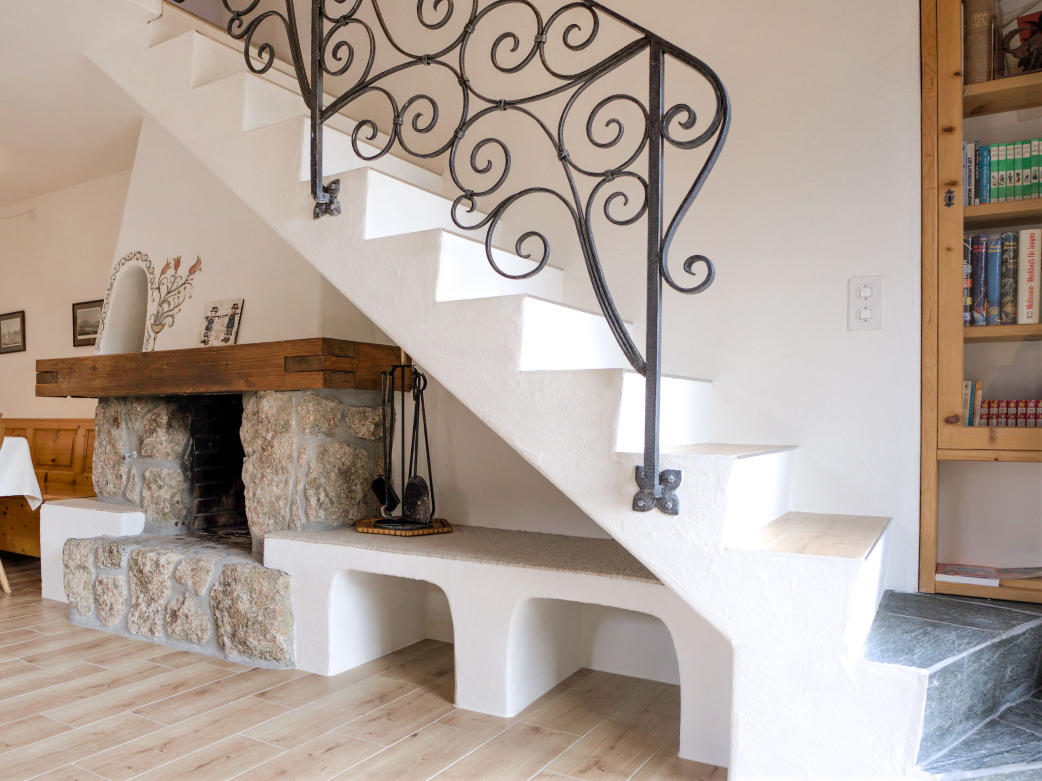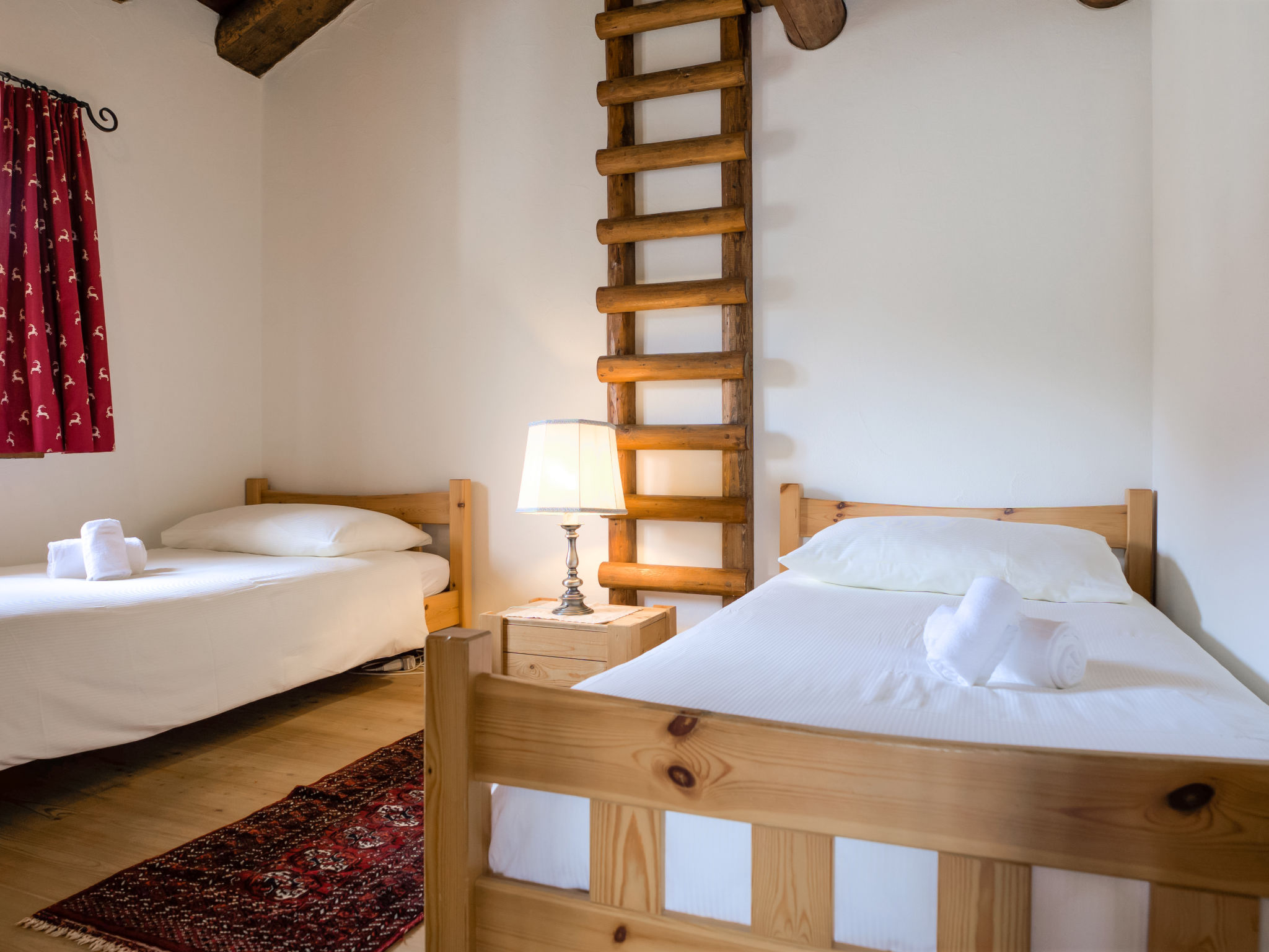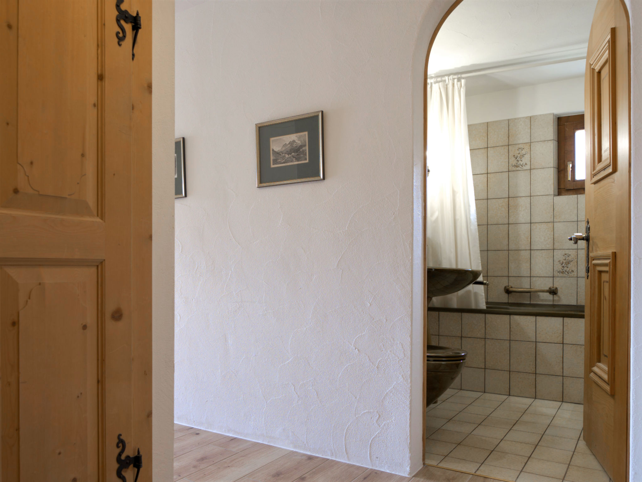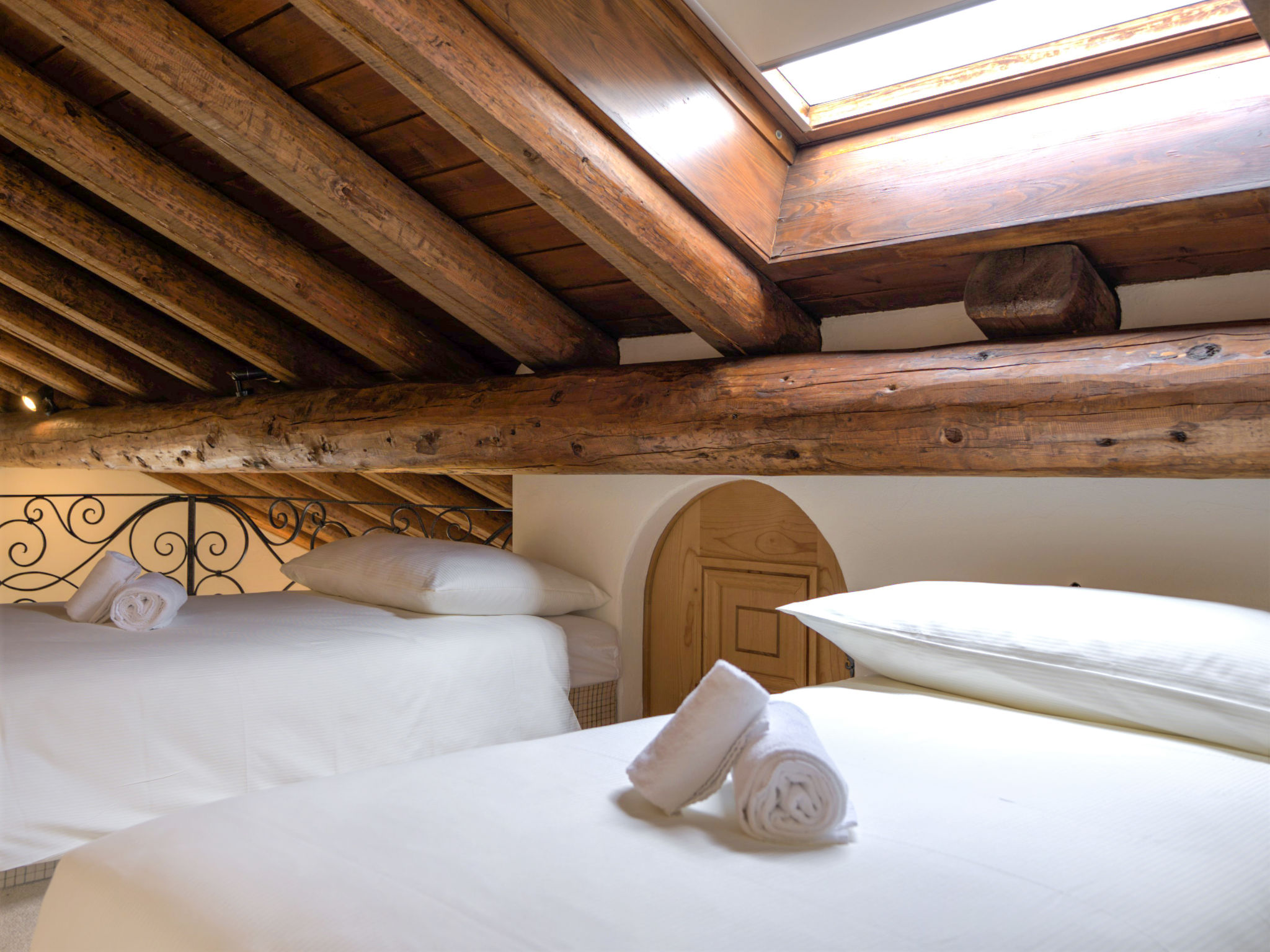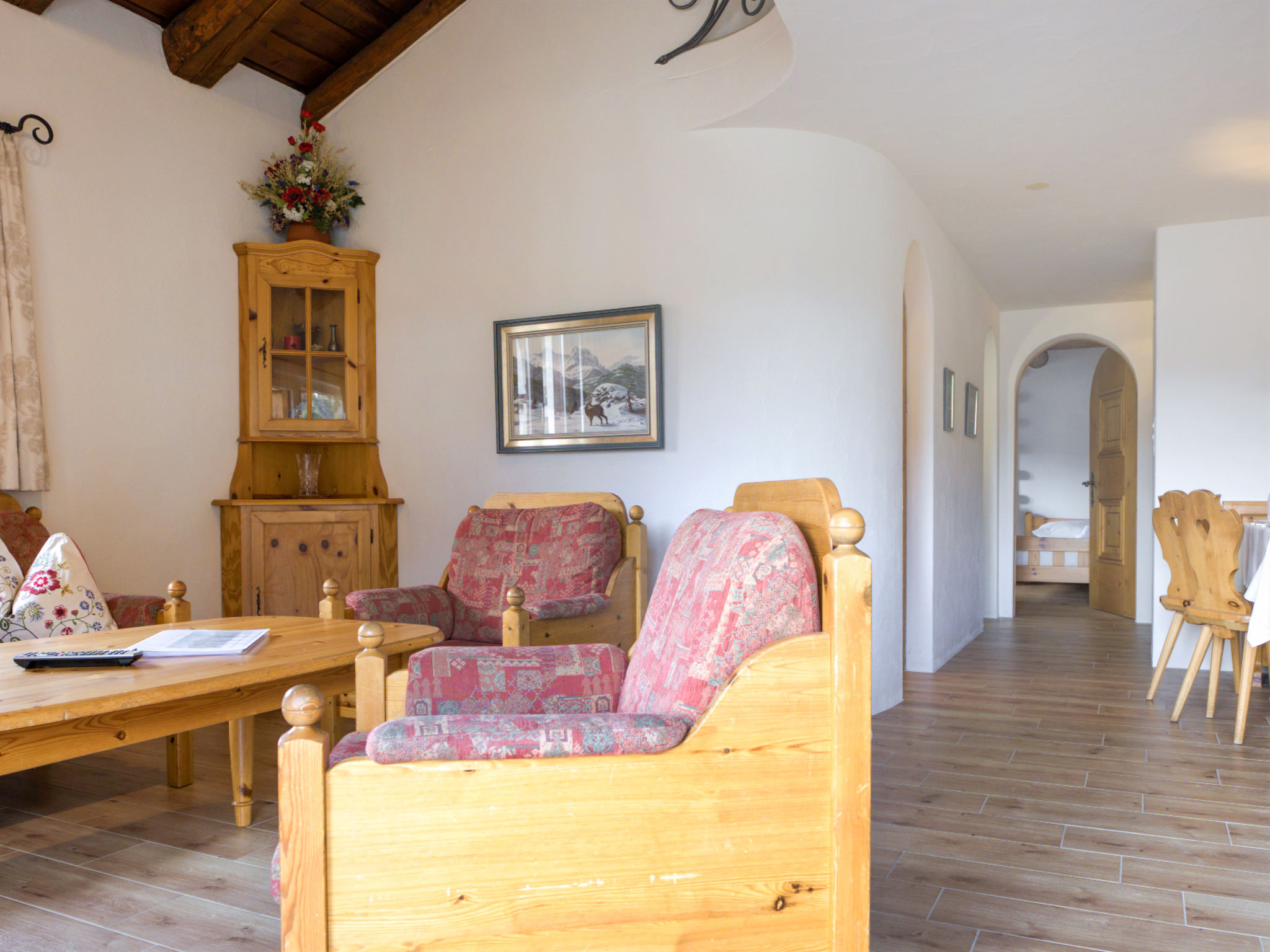 "Chesa Chanella 5", 3-Zimmer-Wohnung 85 m2 auf 2 Stockwerken, im Dachgeschoss. Gemütlich eingerichtet: Wohn-/Esszimmer mit offenem Kamin, TV und Radio. Ausgang zum Balkon, Richtung Südwesten. 1 Zimmer mit 2 Betten (90 cm, Länge 190 cm). Küche (Backofen, Geschirrspüler, 4 Induktionskochplatten, Toaster, Wasserkocher, Tiefkühler, elektrische Kaffeemaschine, Kapseln für die Kaffeemaschine (Nespresso) extra, Fondue Set (Käse)). Bad/WC. Obergeschoss: abgeschrägte, offene Galerie mit 2 Betten (90 cm, Länge 195 cm). 1 Zimmer mit 1 franz. Bett (1 x 155 cm, Länge 200 cm), Waschbecken. Sep. WC. Sicht auf die Berge. Zur Verfügung: Haartrockner. Internet (Wireless LAN, gratis). Garage Nr. 5, Höhe 225 cm, Breite 210 cm. Anstelle eines abgeschlossenen Schlafzimmers befinden sich manche Schlafplätze in einem offenen Bereich (Galerie, Nische etc.).