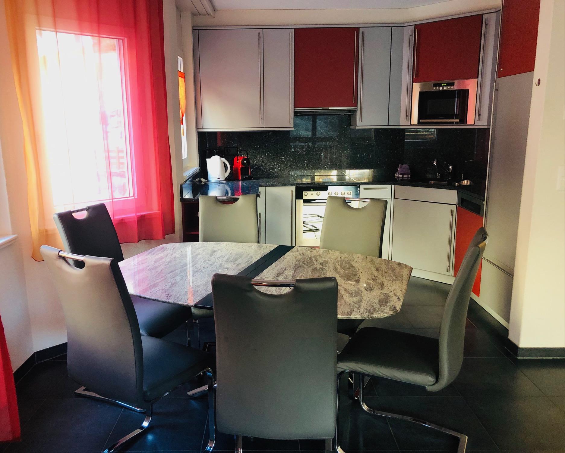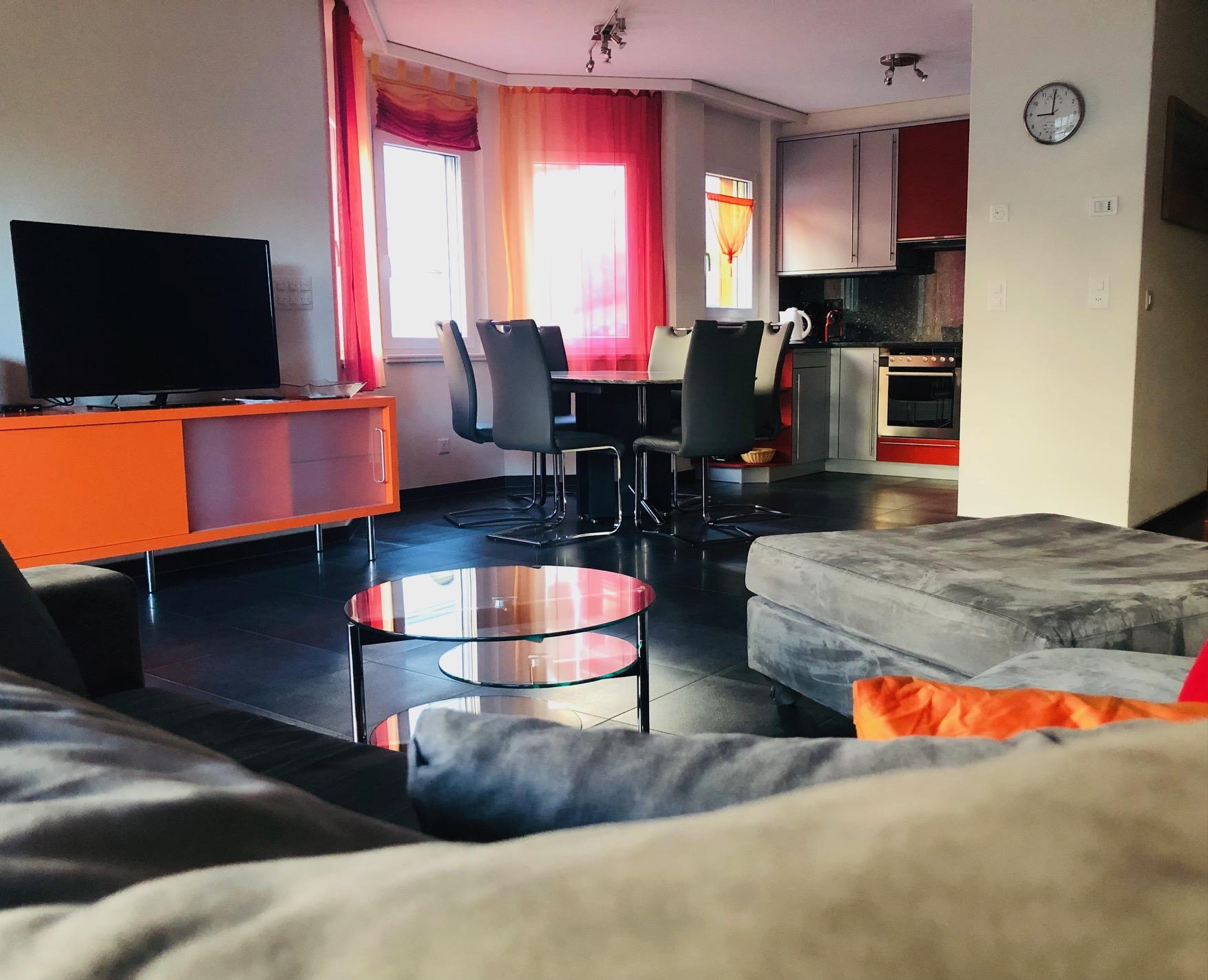 3-Zimmerwohnung 90m2: Wohnzimmer, TV, DVD, Radio/CD, gratis WiFi. Offene Küche, Geschirrspüler, Mikrowelle, Kaffeemaschine. 2 Doppelschlafzimmer, 2 Dusche/WC. Balkon 12m2, Panoramasicht, ruhige Lage, Garage, Lift, Ski- & Veloraum, Nähe: Torrentbahnen,Thermalbäder, Bushaltestelle, Dorfzentrum. Nichtraucherwohnung! Haustiere nicht erlaubt!