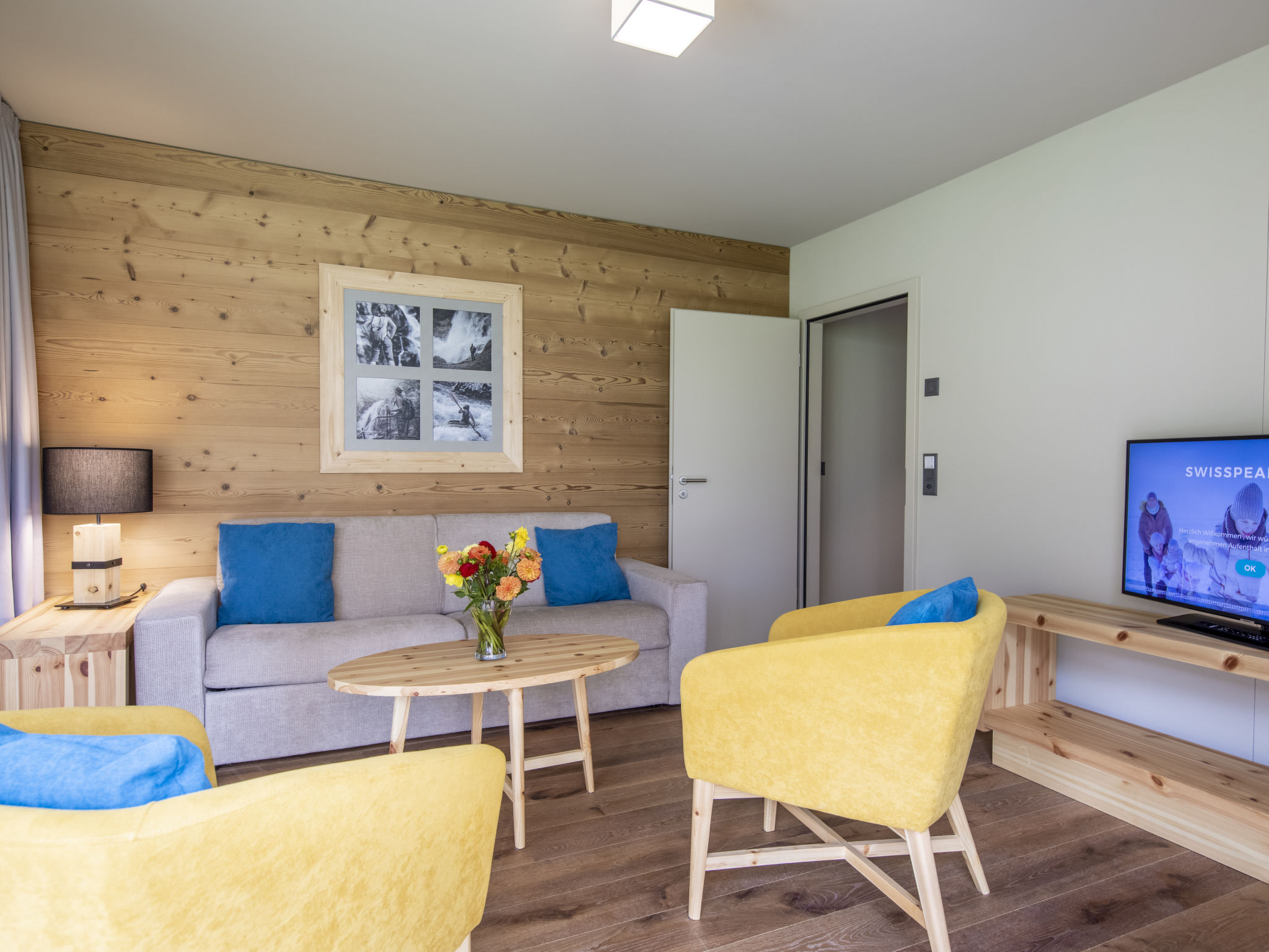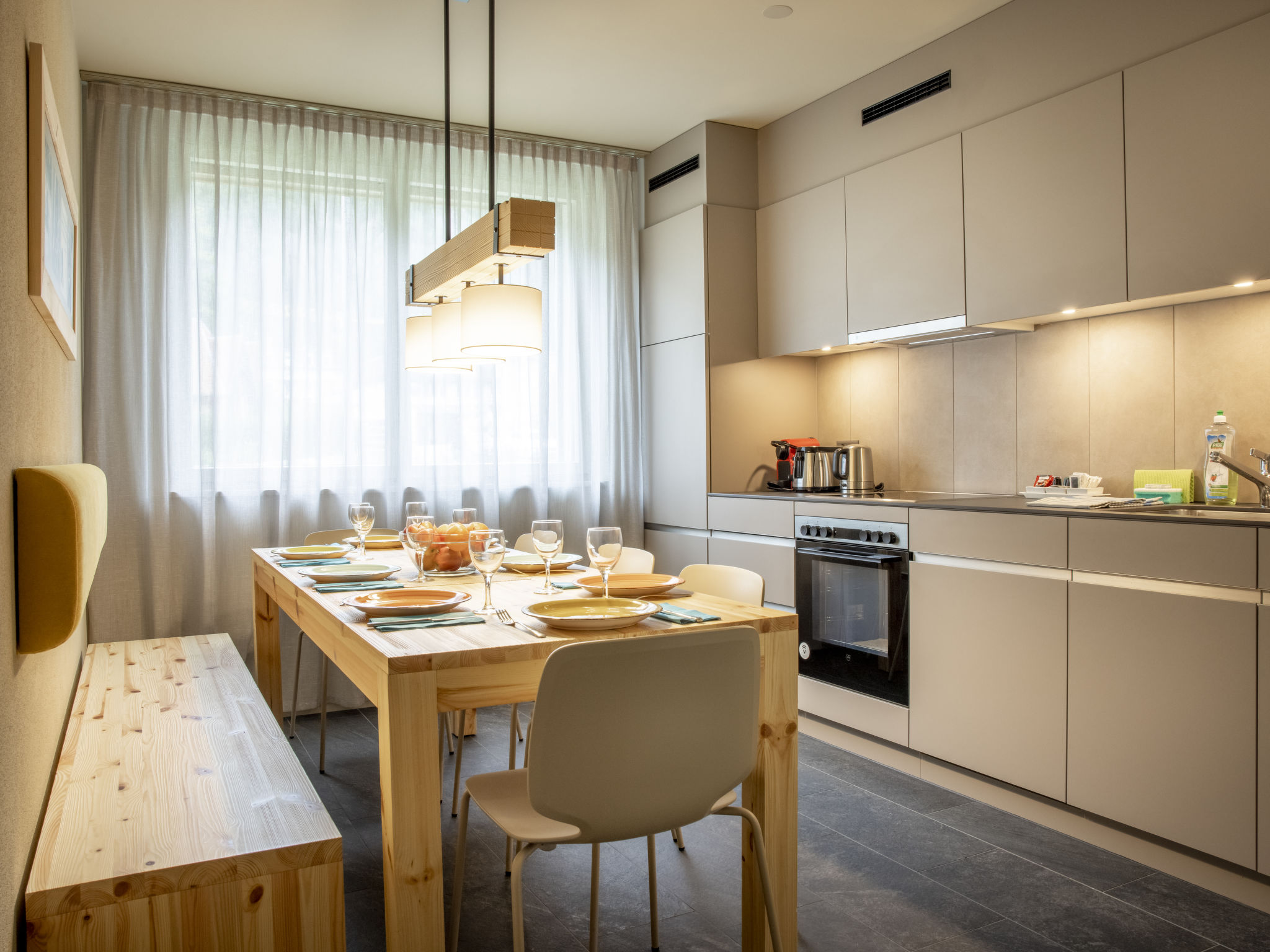 "4 room apartment - Rosenlaui", 4-Zimmer-Wohnung 90 m2. Geräumig, modern eingerichtet: Wohnzimmer mit 1 Doppeldiwanbett (160 cm, Länge 200 cm), Internationale TV-Sender und Flachbildschirm. Ausgang zum Balkon, zur Terrasse. 1 Zimmer mit 1 Doppelbett (2 x 90 cm, Länge 200 cm), Bad/WC. 1 Zimmer mit 2 Betten (90 cm, Länge 200 cm). 1 Zimmer mit 1 Doppelbett (2 x 90 cm, Länge 200 cm). Küche (Backofen, Geschirrspüler, 4 Glaskeramikplatten, elektrische Kaffeemaschine, Kapseln für die Kaffeemaschine (Nespresso) extra) mit Esstisch. Dusche, sep. WC. Fussbodenheizung. Parkettboden. Balkon 12 m2, Südwestlage oder Terrasse 14 m2, Südwestlage. Terrassenmöbel, Balkonmöbel. Eingeschränkte Sicht auf die Berge. Zur Verfügung: Haartrockner. Internet (WLAN, gratis). Bitte beachten: geeignet für Familien. Nichtraucher-Haus. Maximal 1 Haustier/Hund erlaubt. Beim Mietobjekt handelt es sich um ein Typenhaus bzw. Um eine Typenwohnung. Ein Fondue Set (Fleisch oder Käse) sowie ein Raclette Ofen kann an der Rezeption gegen ein Depot ausgeliehen werden.