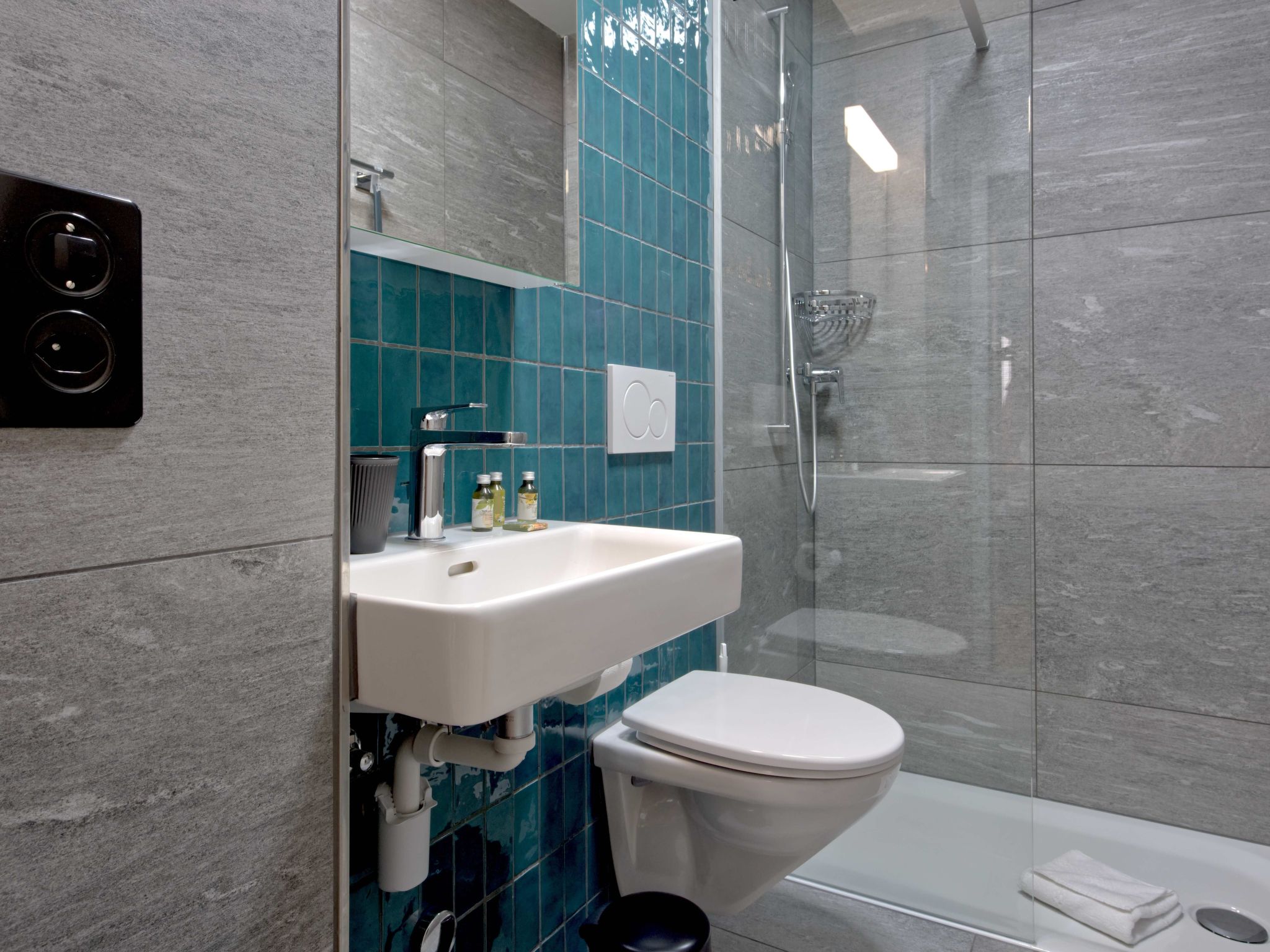 Das Badezimmer ist mit einer eleganten Dusche und einem WC ausgestattet. Die modernen Fliesen und die hochwertige Ausstattung verleihen dem Raum eine angenehme Atmosphäre.