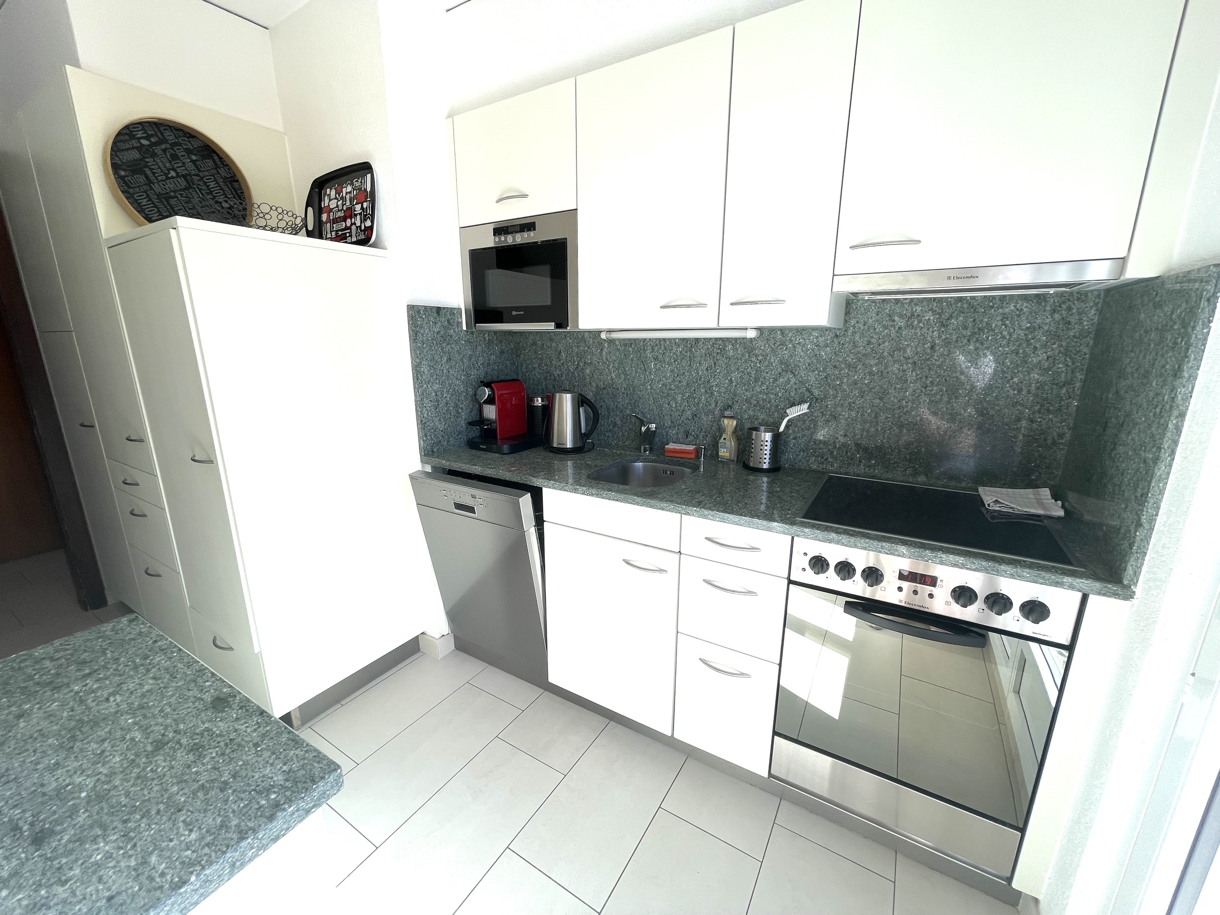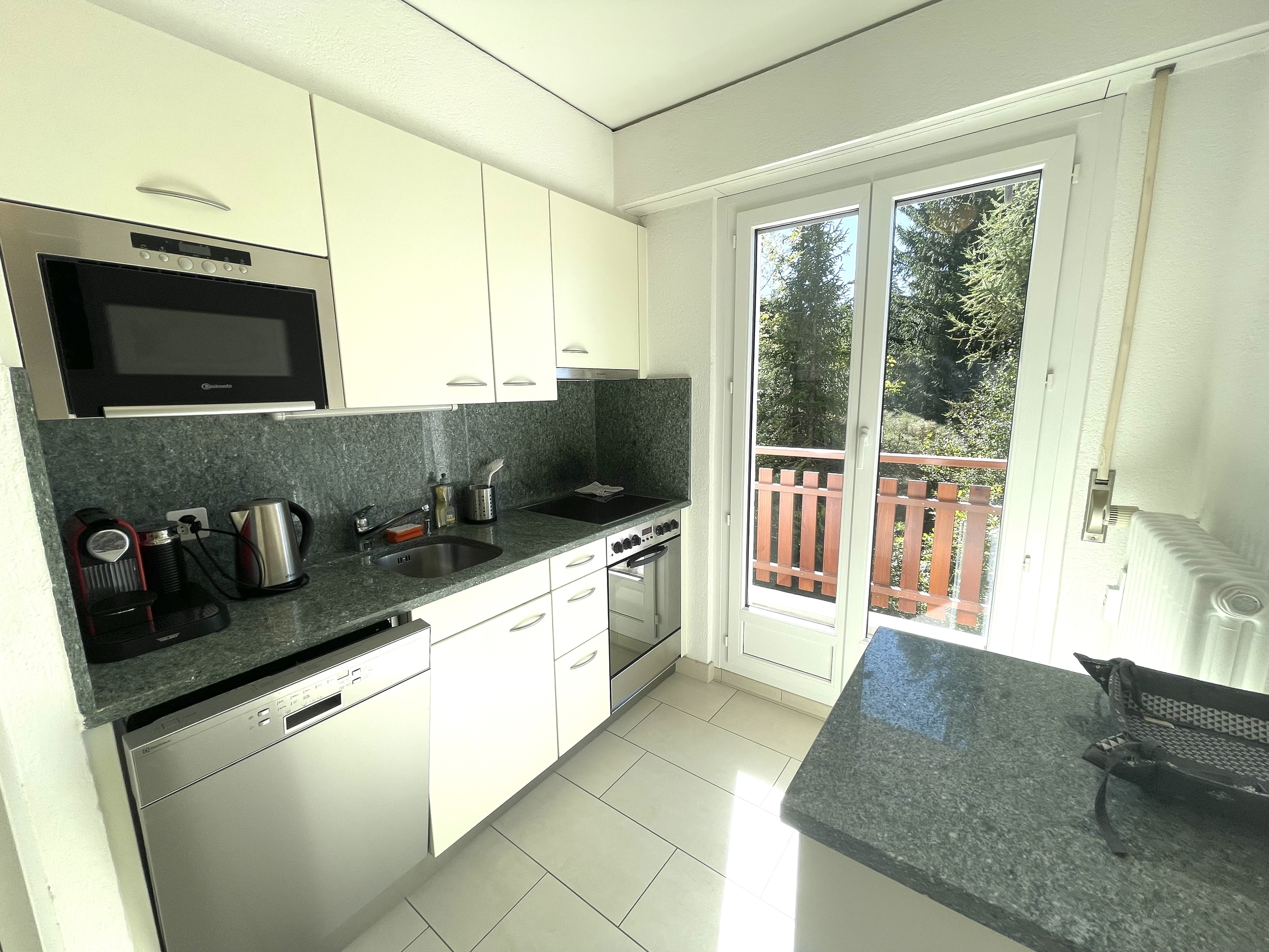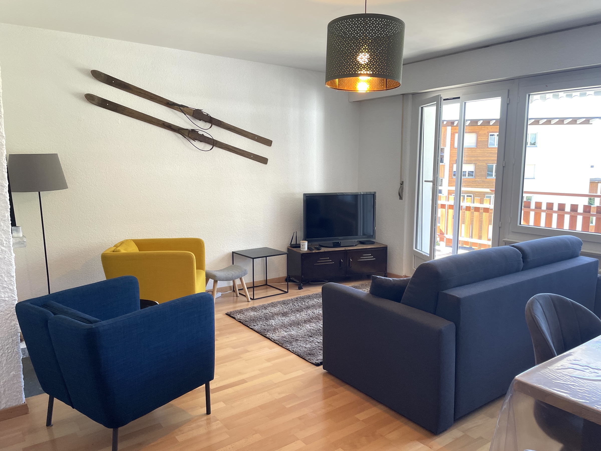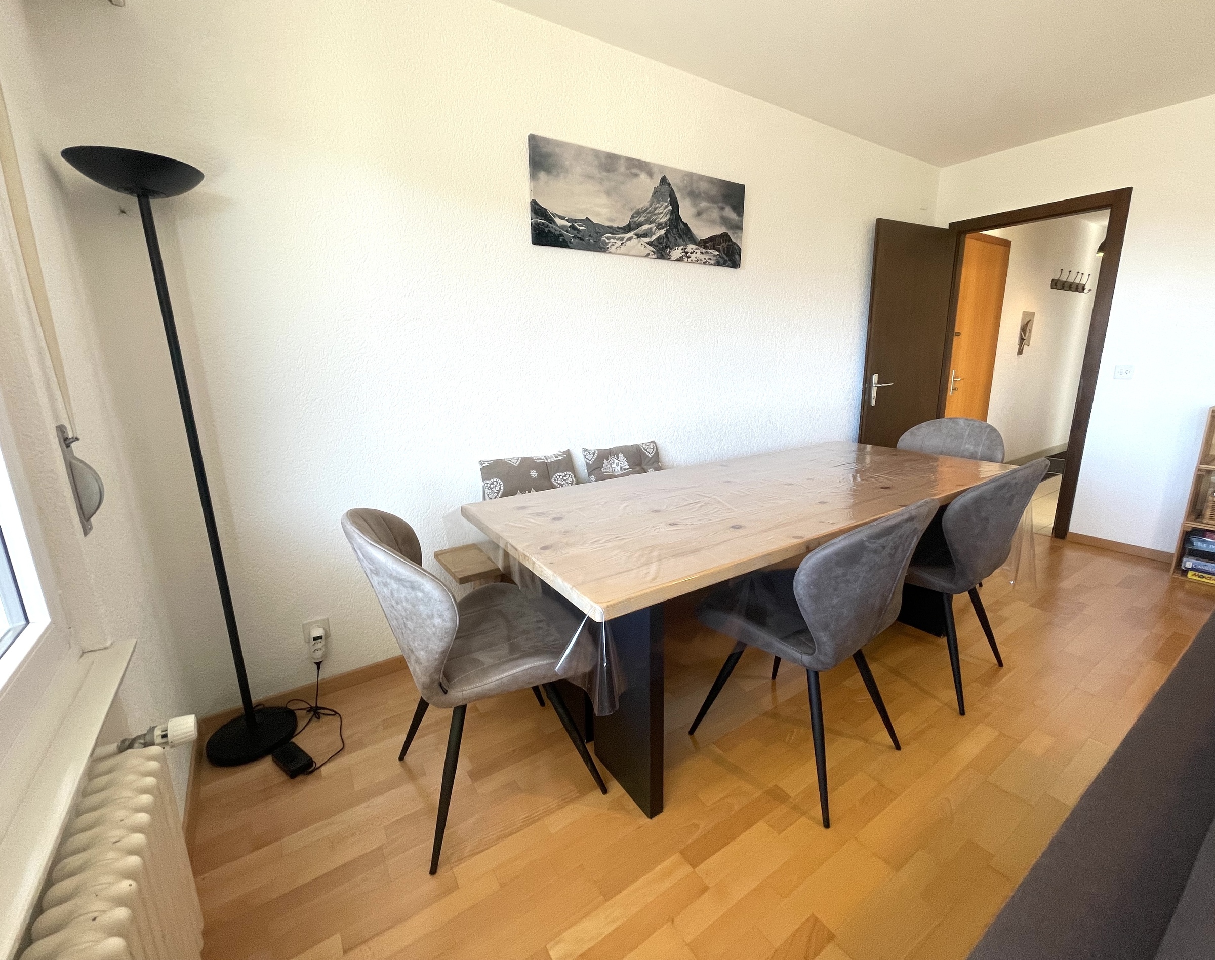 Diese wunderschöne 3,5-Zimmer-Wohnung im 3. Stock bietet Platz für maximal 5 bis 6 Personen. Eingangshalle, geräumiges Wohnzimmer mit Doppelschlafsofa (140 x 190), Esszimmer mit Zugang zum großen Südostbalkon, voll ausgestattete Küche, Geschirrspüler, Nespresso-Kaffeemaschine, Raclettegerät, Fondue-Set, DVD-Player, 1 Schlafzimmer mit Doppelbett (160 x 200), 1 Schlafzimmer mit Etagenbett (140 x 200 und 90 x 200), 1 Duschbad mit WC und Waschbecken, 1 Badezimmer mit WC und Waschbecken.
