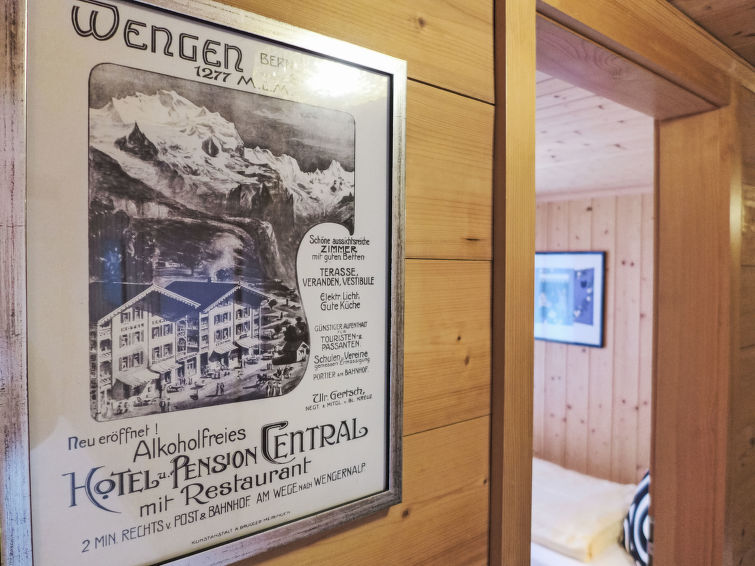 "Central Apt W", 4-Zimmer-Wohnung 63 m2, im Dachgeschoss. Geräumig und hell, komfortabel und gemütlich eingerichtet: Wohn-/Esszimmer mit offenem Kamin und Esstisch. Ausgang zum Balkon. 1 Zimmer mit 1 Doppelbett (2 x 90 cm, Länge 200 cm). 1 Zimmer mit 1 Bett (90 cm, Länge 200 cm). 1 Zimmer mit 1 x 2 Etagenbetten (90 cm, Länge 200 cm). Offene Küche (3 Kochplatten, Backofen, Geschirrspüler, Toaster, Wasserkocher, elektrische Kaffeemaschine, Kapseln für die Kaffeemaschine (Nespresso) extra, Racletteofen, Fondue Set (Käse)). Dusche/WC. Kleiner Balkon 8 m2. Herrliche Panoramasicht auf die Berge, die Landschaft und Jungfrau. Zur Verfügung: Waschmaschine, Bügeleisen, Haartrockner, Holz (extra). Internet (Wireless LAN, gratis). Bitte beachten: geeignet für Familien. Nichtraucher-Unterkunft.