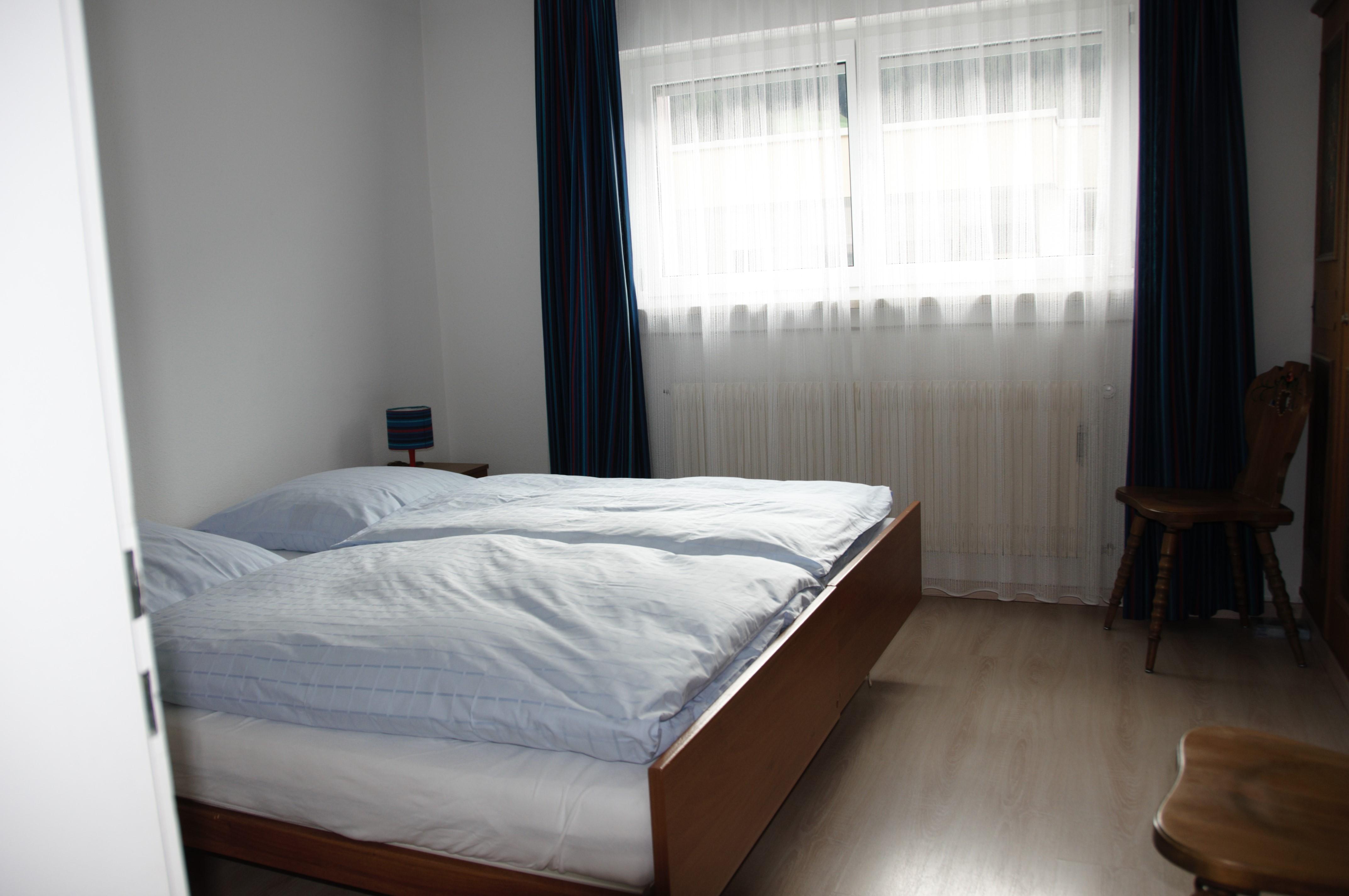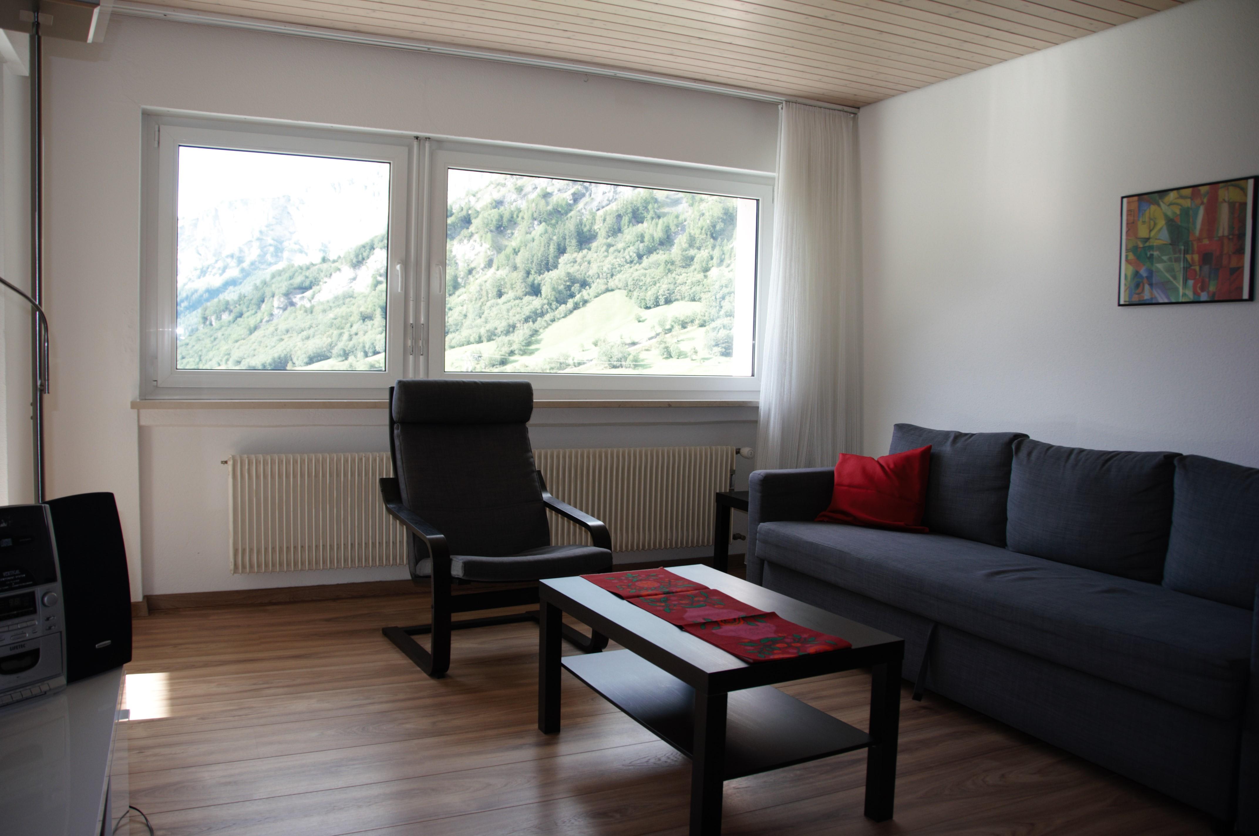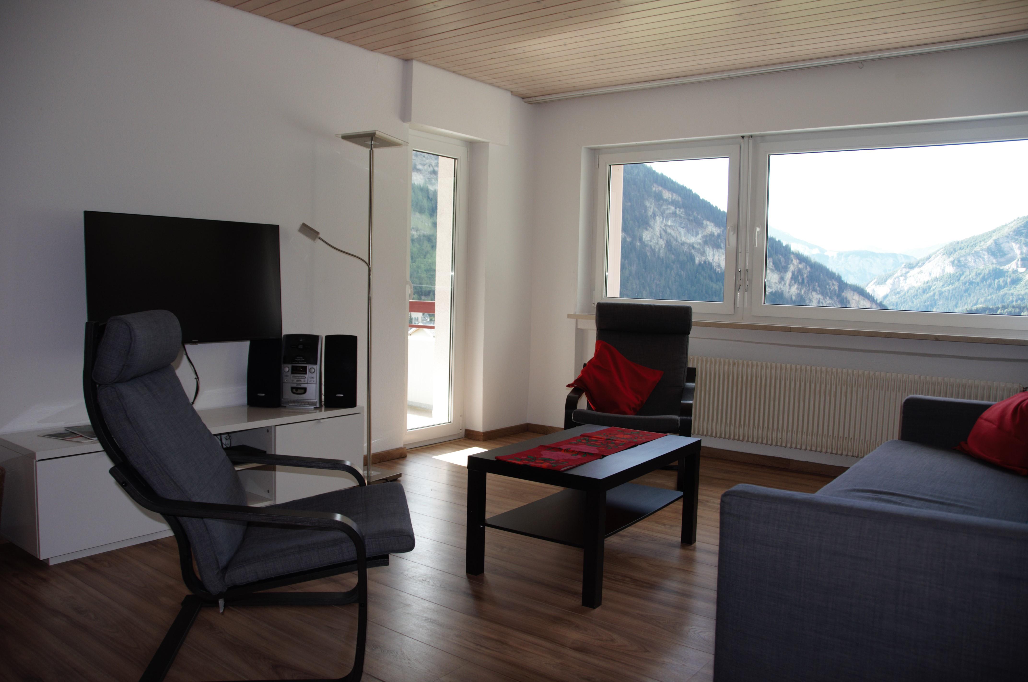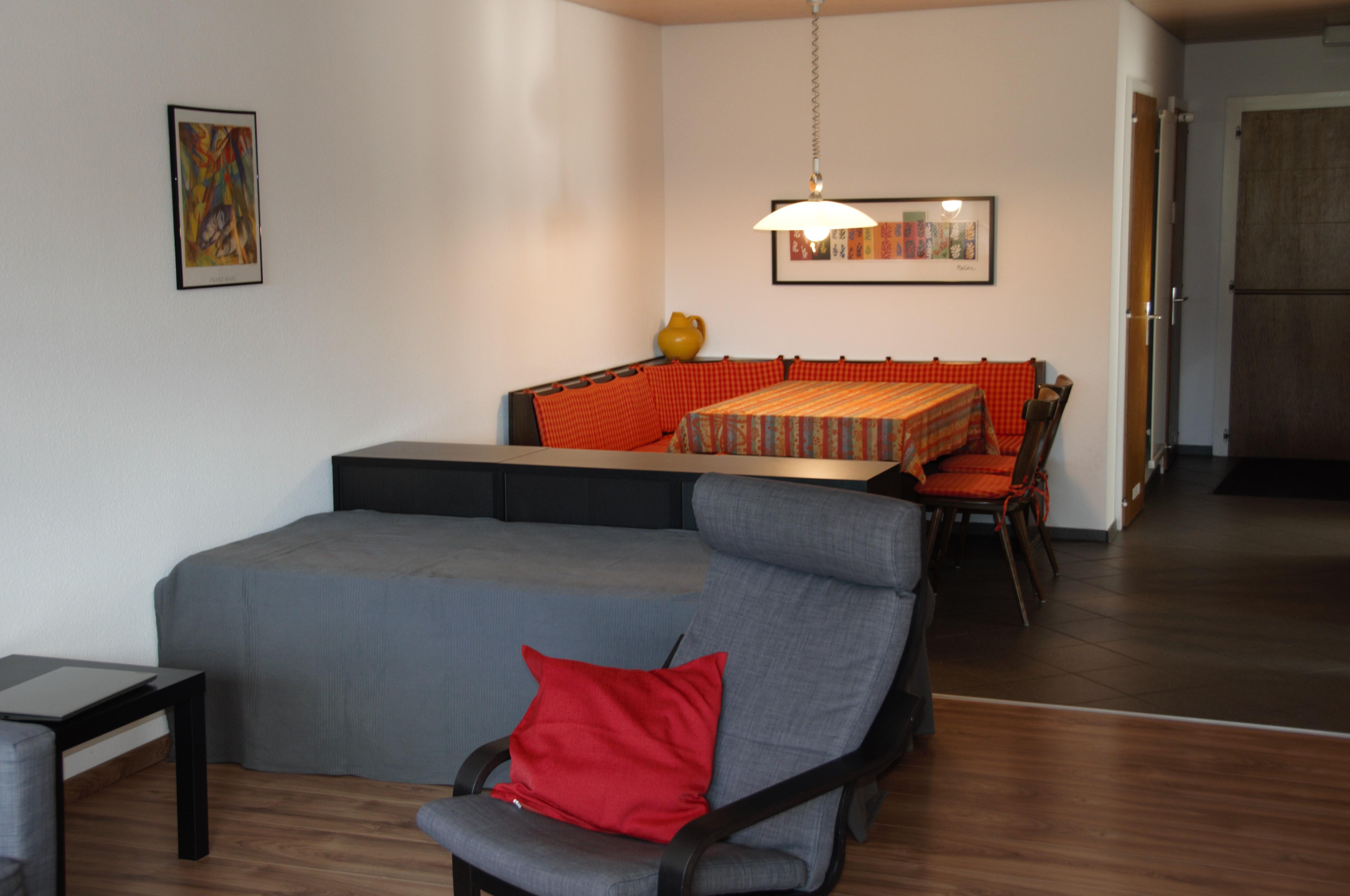 3-Zimmerwohnung: Wohn-/Esszimmer mit 2 Betten, 2 Zweibettzimmer, Dusche/WC und separates WC, moderne Küche mit Geschirrspüler und Mikrowelle, Südbalkon, gratis WiFi, Radio/CD-Player, TV. Nichtraucherwohnunung. Aussenparkplatz inklusive.