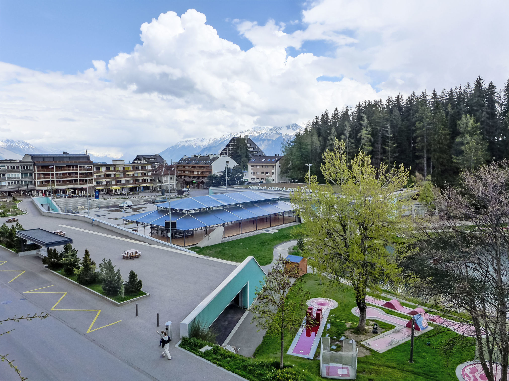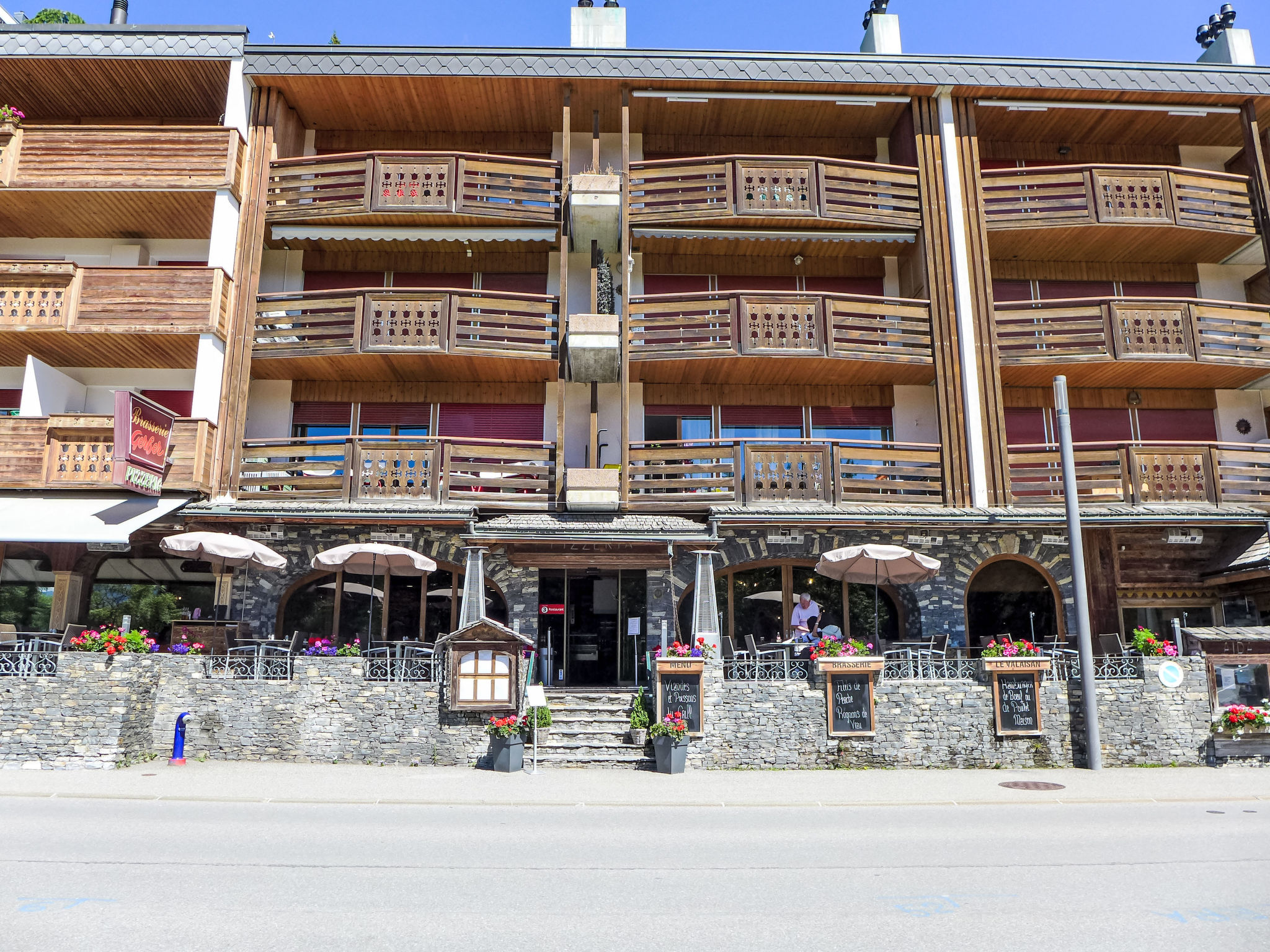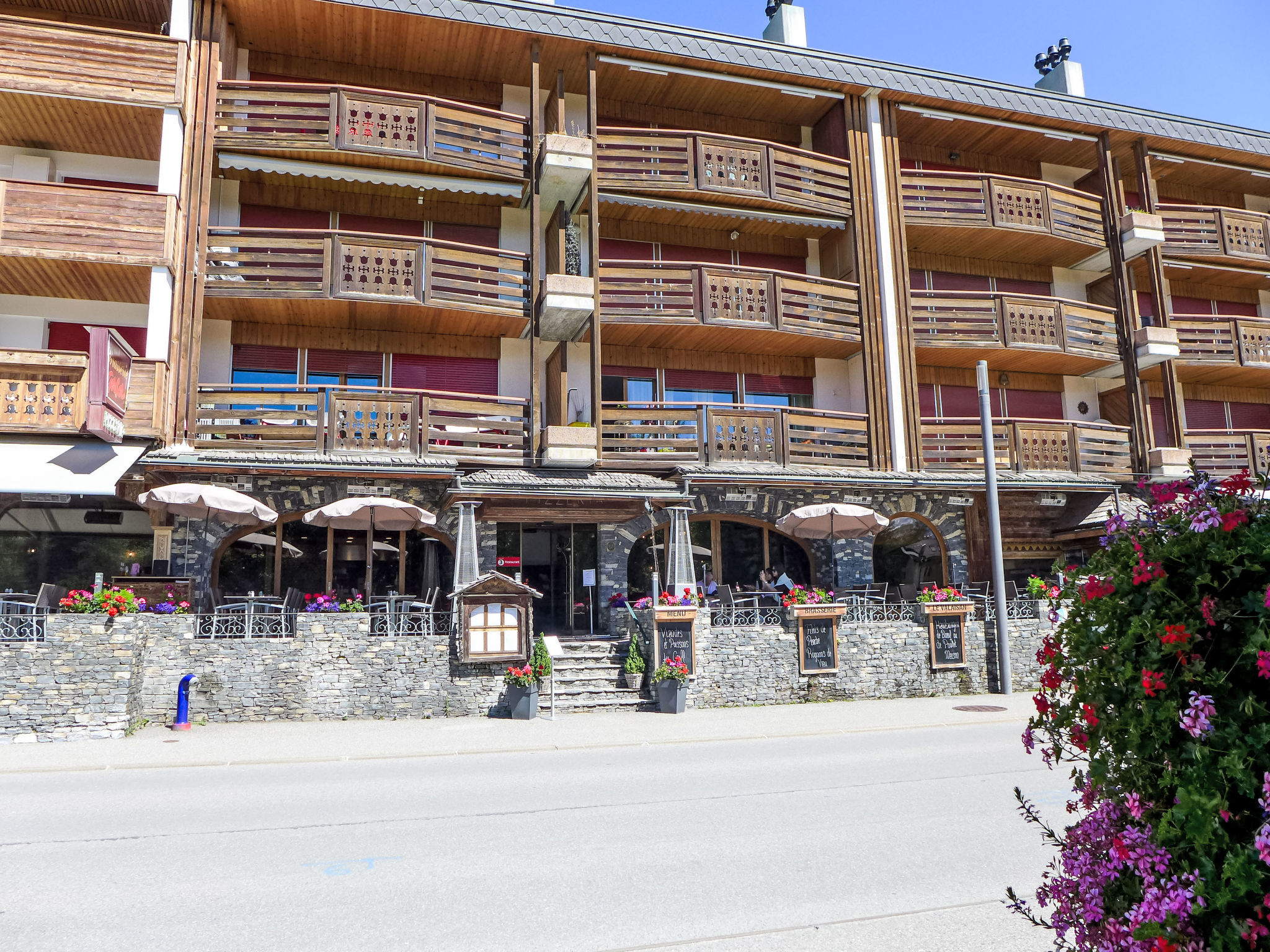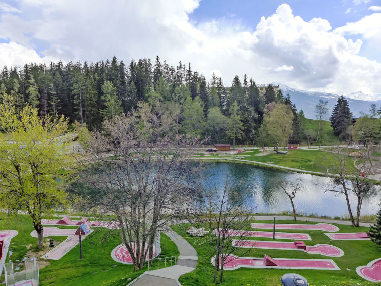Gemütliche Residenz "Corfou A", auf 3 Stockwerken. Im Ortszentrum von Montana, zentrale, belebte, sonnige Lage. In der Anlage: Fahrstuhl, Zentralheizung, Waschmaschine (zur Mitbenutzung, extra), Trockenraum. Bushaltestelle "Ycoor" 100 m. Golfplatz (18 Loch) 2 km, Minigolf 30 m, Skisportanlagen 300 m.