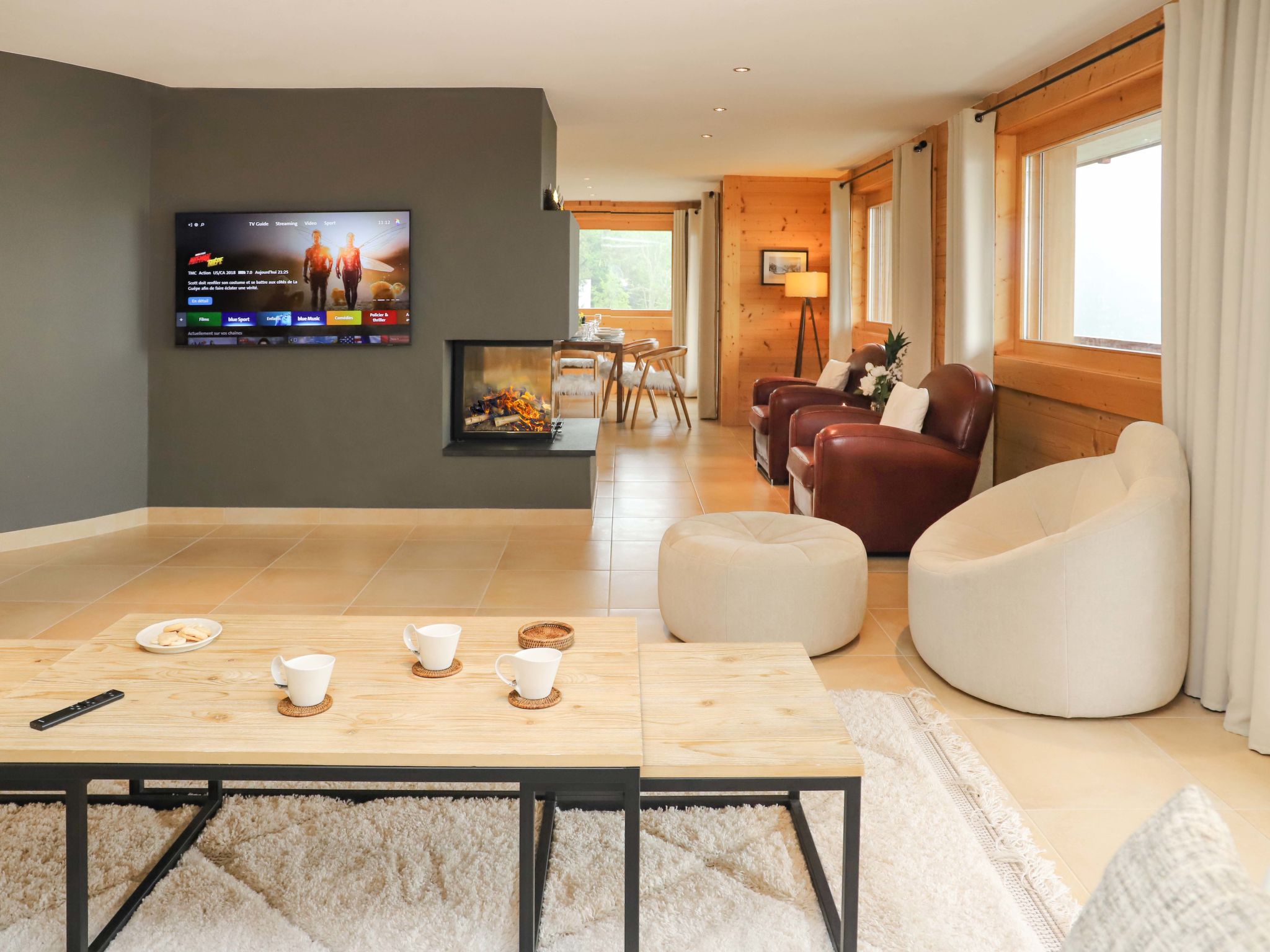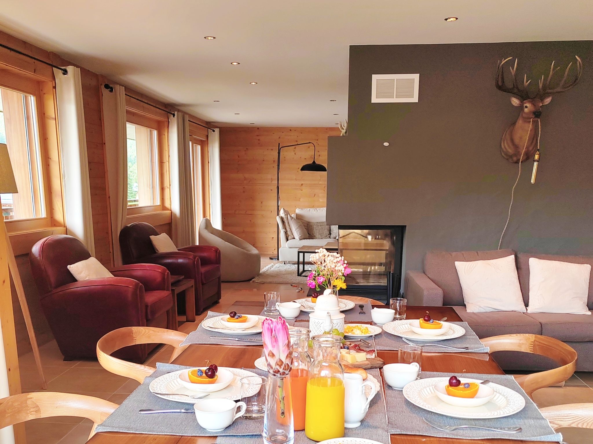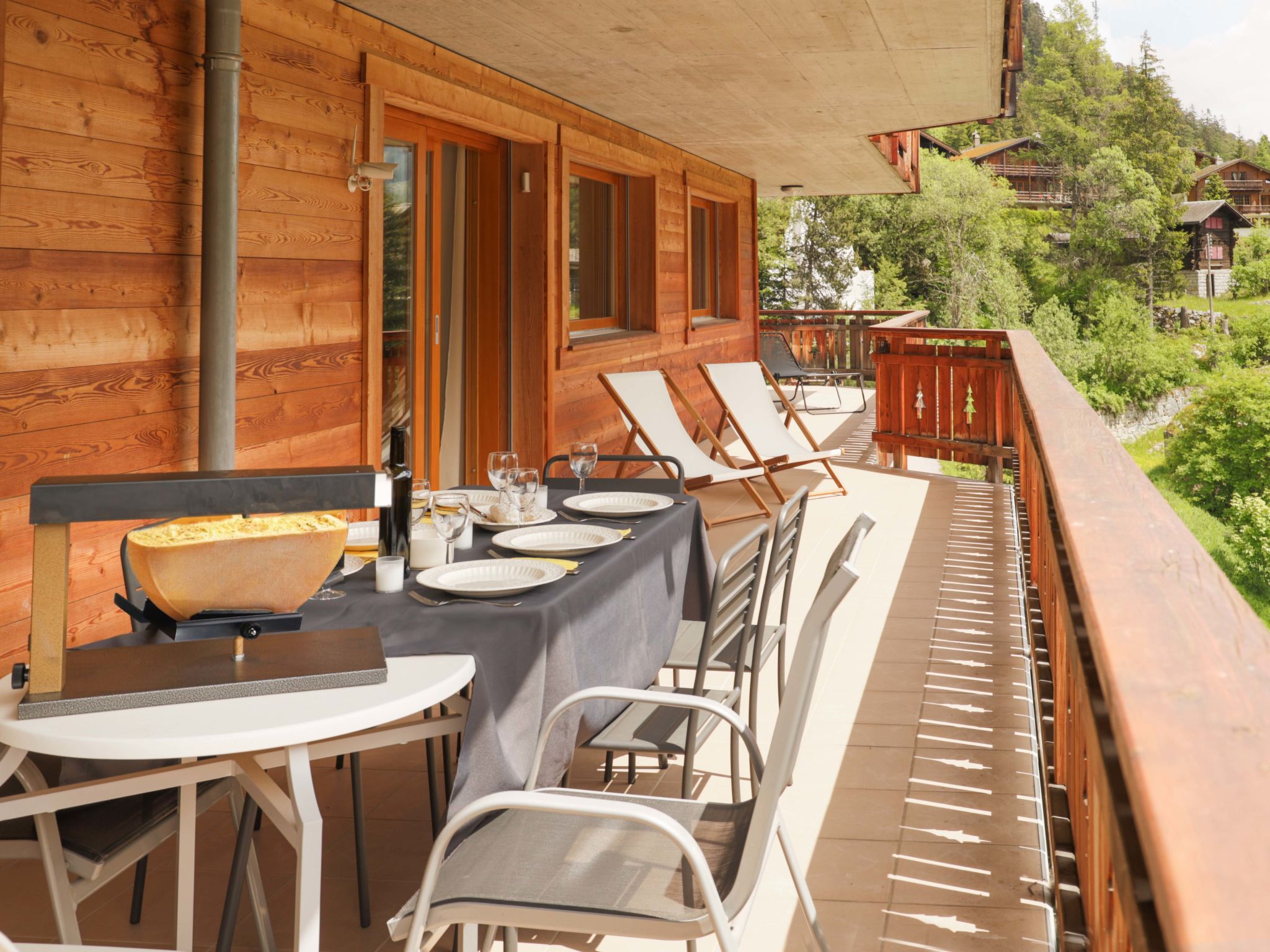 "Les Mayens 3.2", 5-Zimmer-Wohnung 240 m2 im 3. Stock. Geräumig und hell, sehr schön und modern eingerichtet: grosses Wohn-/Esszimmer mit Panoramafenster mit offenem Kamin und Kabel-TV. Ausgang zur Terrasse. 1 grosses Zimmer mit Panoramafenster mit 1 franz. Bett (180 cm, Länge 200 cm), Bad/Dusche/WC. Ausgang zur Terrasse. 1 grosses Zimmer mit 1 franz. Bett (1 x 180 cm, Länge 200 cm), Bad/WC, Sprudelbad und Kabel-TV. 1 grosses Zimmer mit 2 Betten (90 cm, Länge 200 cm). 1 grosses Zimmer mit 1 franz. Bett (1 x 180 cm, Länge 200 cm), Dusche/WC und Kabel-TV. Offene Küche (4 Kochplatten, Backofen, Geschirrspüler, Toaster, Wasserkocher, Mikrowelle, Tiefkühler, elektrische Kaffeemaschine, Kapseln für die Kaffeemaschine (Nespresso) extra, Racletteofen, Fondue Set (Chinoise, Käse)). Dusche/WC, sep. WC. Grosser Balkon 41 m2. Terrassenmöbel, Liegestühle. Herrliche Sicht auf den See und die Berge. Zur Verfügung: Waschmaschine, Wäschetrockner, Kinderhochstuhl, Babybett bis 3 Jahre, Haartrockner. Internet (WLAN, gratis). Garage Nr. 3.2, Höhe 220 cm. Bitte beachten: geeignet für Familien. Nichtraucher-Unterkunft.