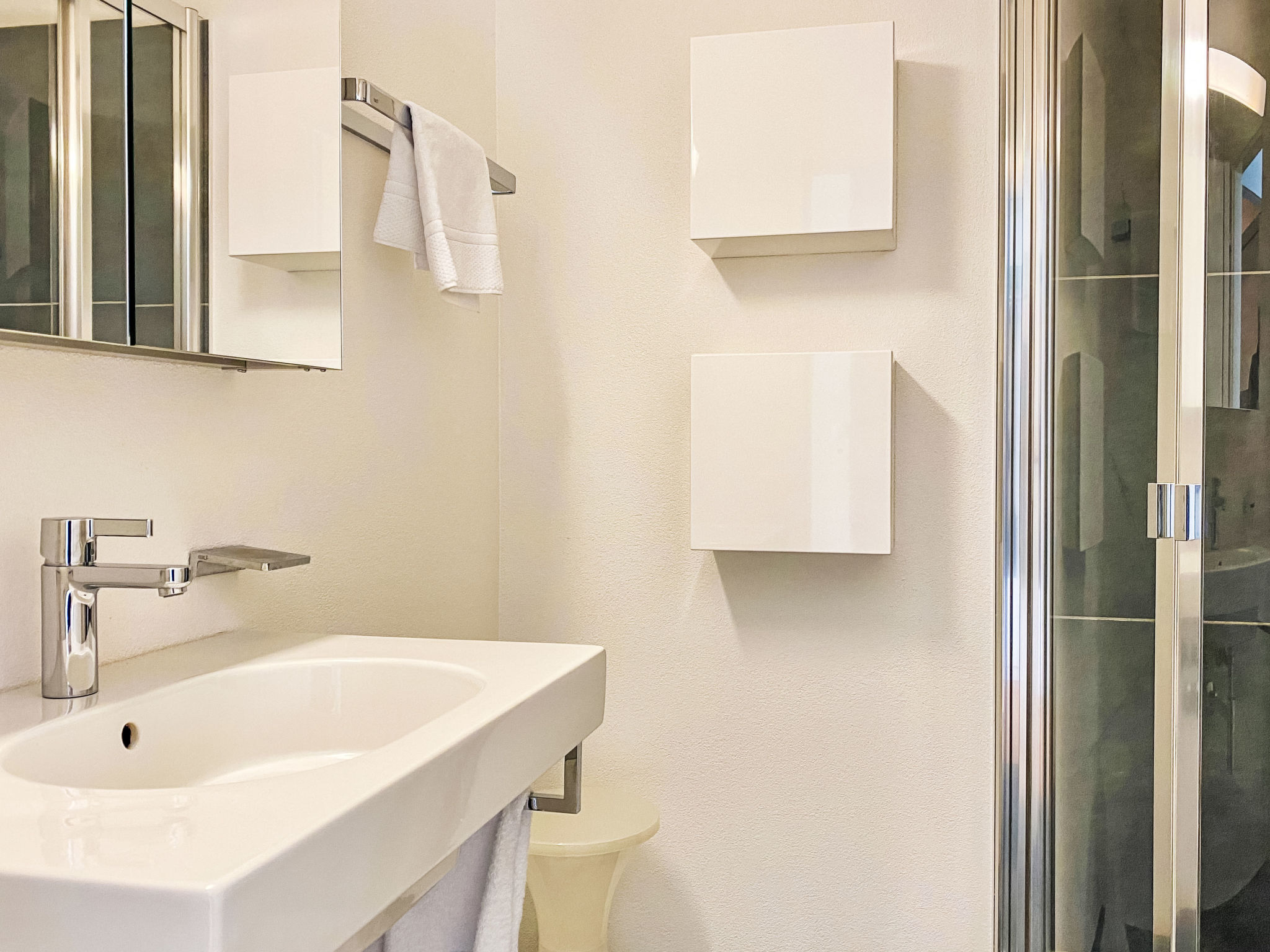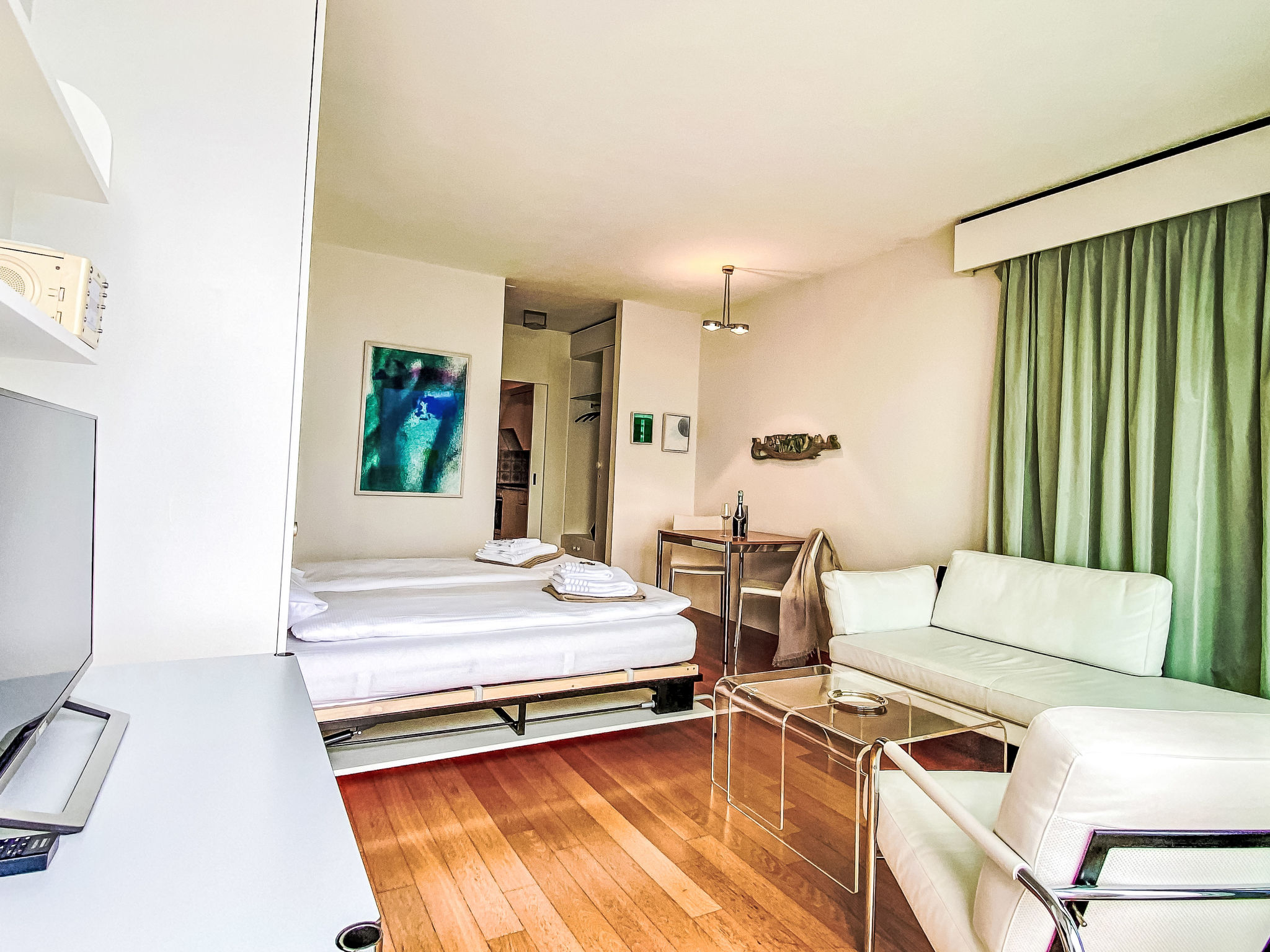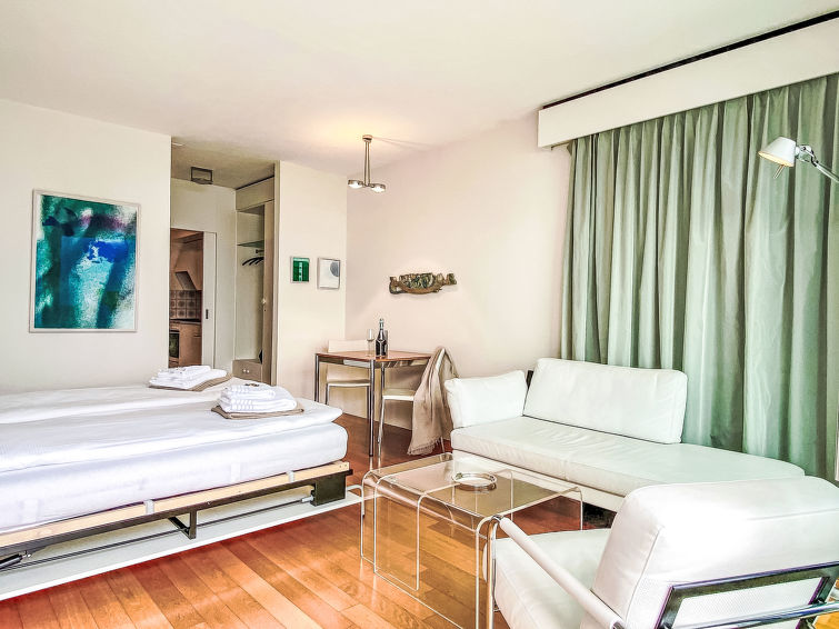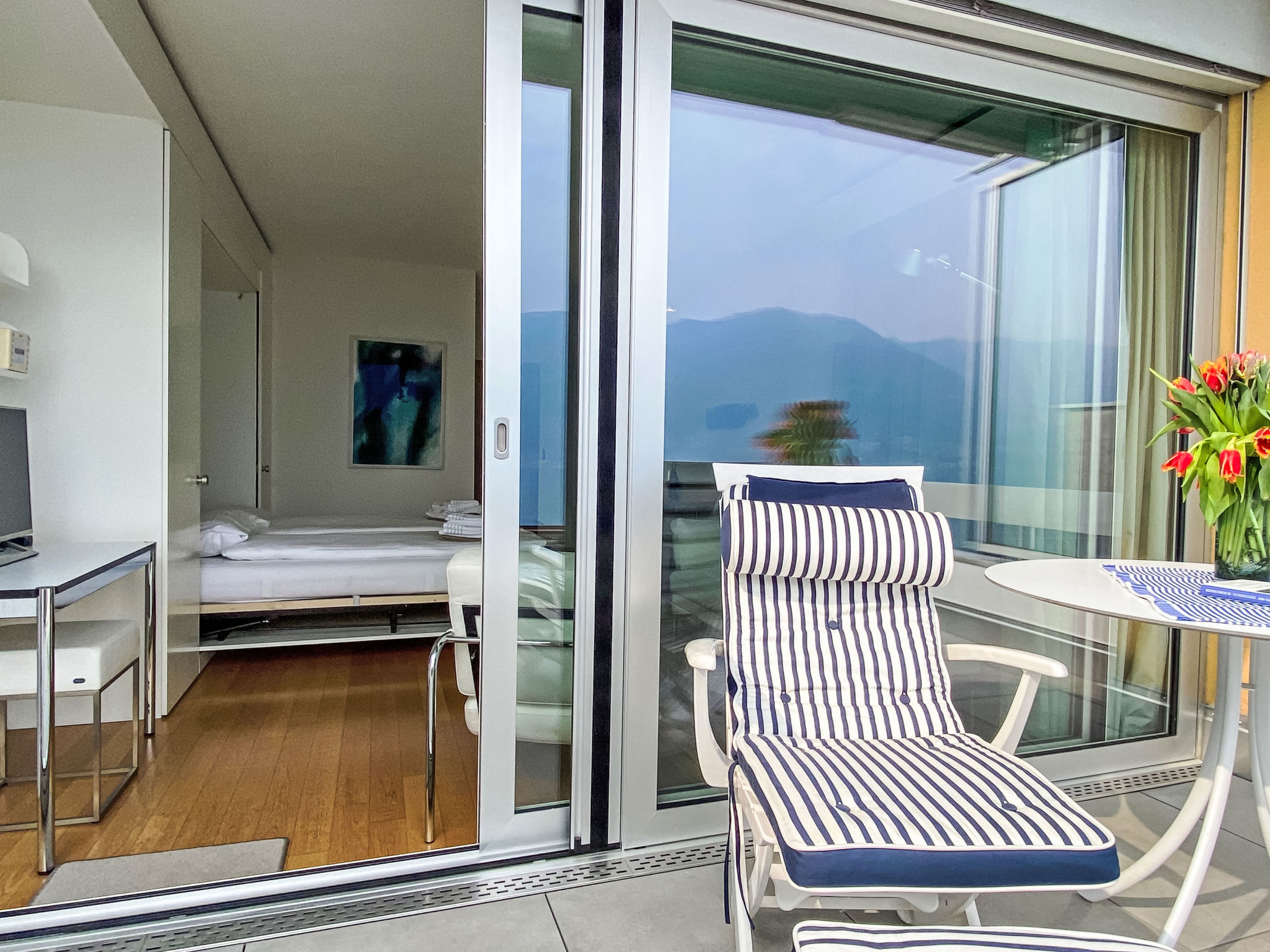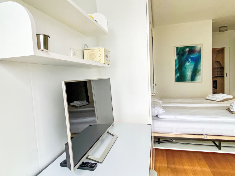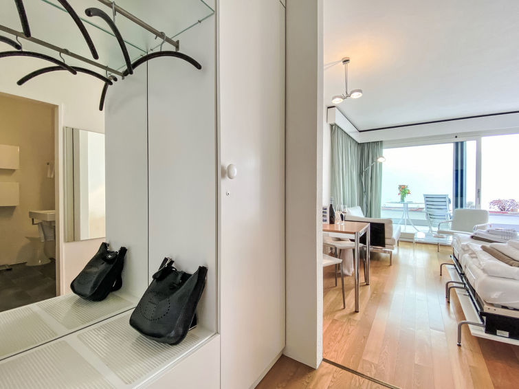 "Lakeview App. 603", 1-Zimmer-Wohnung 36 m2 im 6. Stock, Südostlage. Hell, komfortabel und geschmackvoll eingerichtet: offenes Wohn-/Esszimmer mit Panoramafenster mit 1 Doppelwandschrankbett (2 x 90 cm, Länge 200 cm), Esstisch, Sat-TV, Flachbildschirm, Radio und CD. Ausgang zur Terrasse. Kochnische im Eingang (Backofen, 4 Glaskeramikplatten). Dusche/WC. Heizung. Terrasse teilweise überdacht, Südlage und Ostlage. Terrassenmöbel. Herrliche Panoramasicht auf den See, die Berge und die Landschaft. Zur Verfügung: Haartrockner. Parkplatz Nr. 25. Bitte beachten: Nichtraucher-Unterkunft. neu renoviertes Bad. NL-00011471
