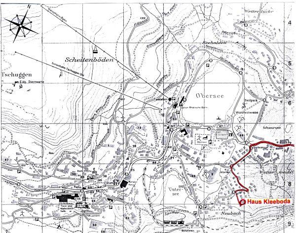 Das Mehrfamilienhaus "Kleeboda" mit 10 Wohnungen (Baujahr 1990) liegt sonnig und ruhig am Wetterweidweg im Gebiet "Neubach / Untersee" mit Blick gegen den Schafrügg und Hörnli Planquadrat P-8 gem. offiziellem Ortsplan Arosa Tourismus).