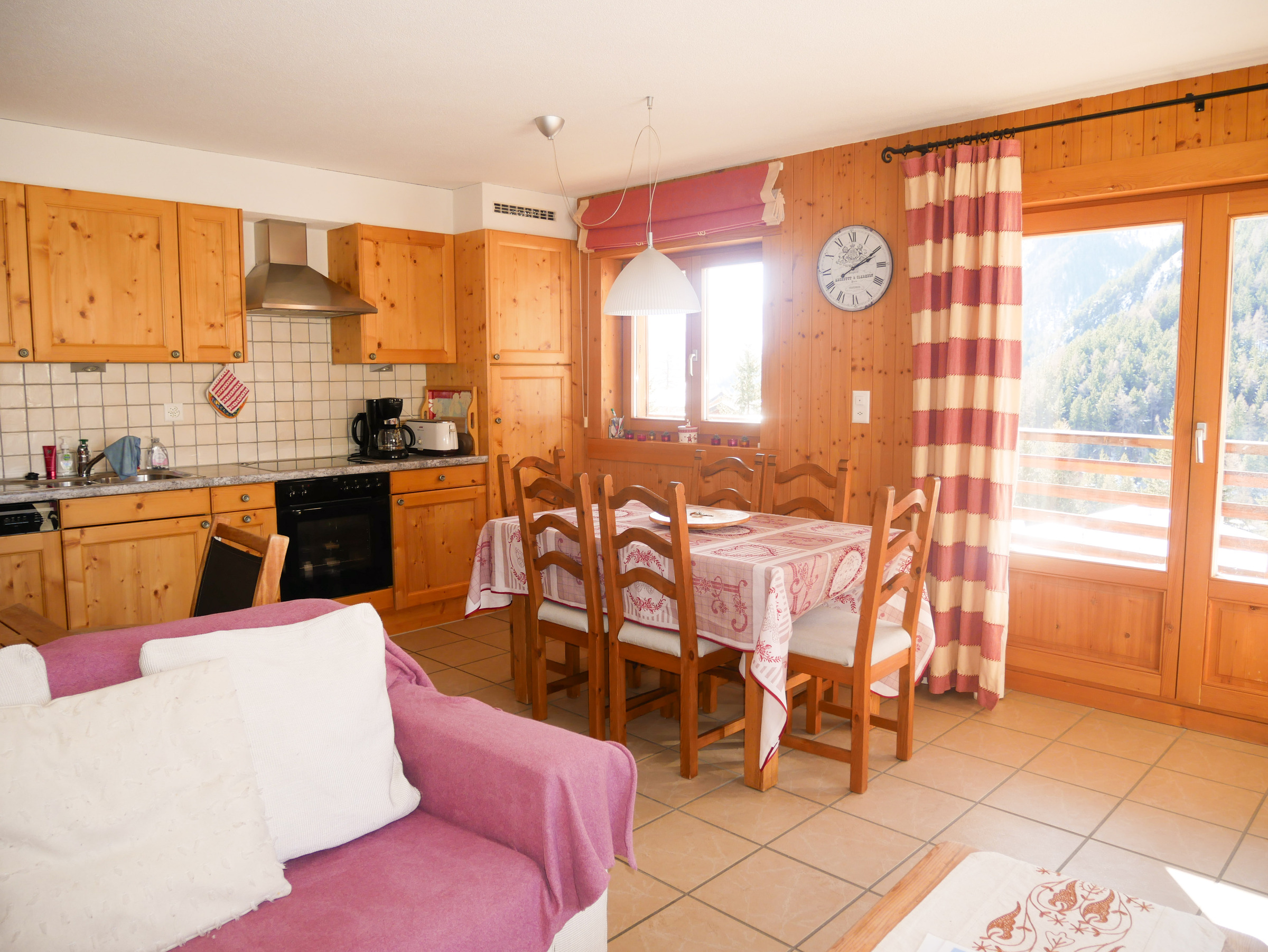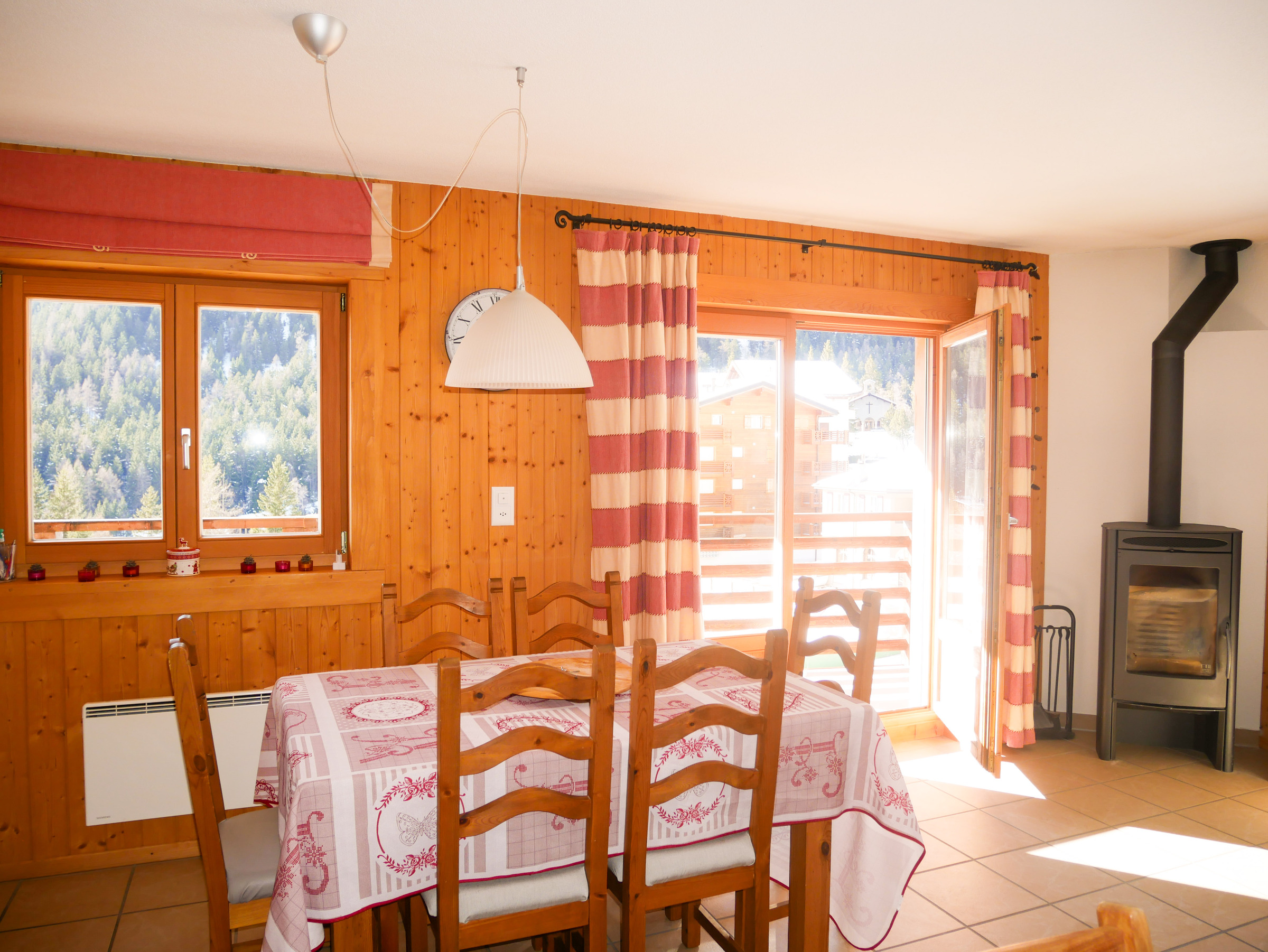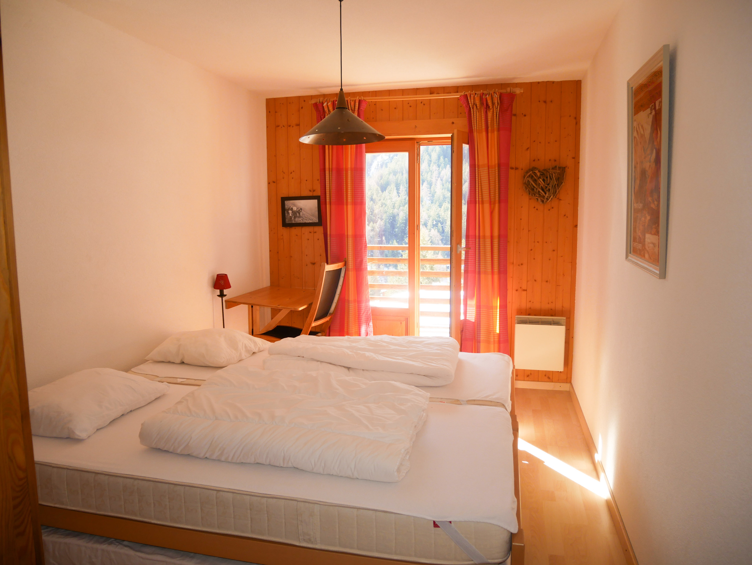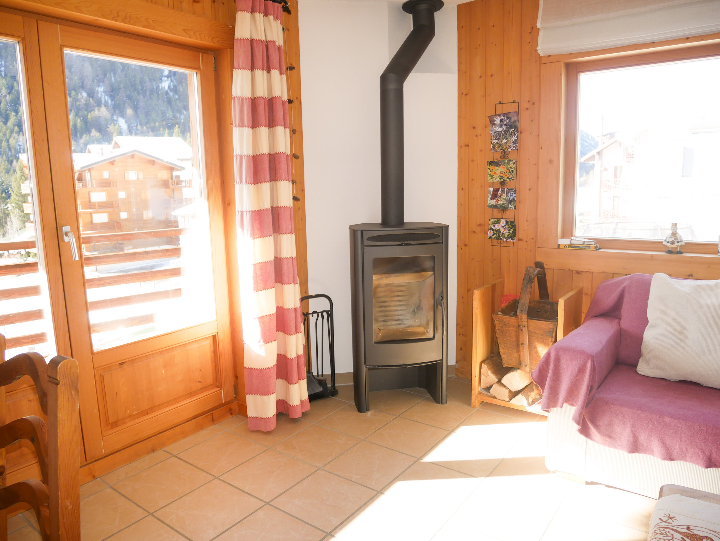 Angenehme, sehr helle 3,5-Zimmer-Wohnung im ersten Stock eines Chalets mit 6 Wohnungen. Eingang, ein großes Wohnzimmer mit offenem Wohnzimmer/Küche, Zugang zum Balkon, Fernseher, WLAN, Holzofen. 1 Toilette + 1 Badezimmer mit Dusche. Ein Schlafzimmer mit einem Doppelbett und ein Schlafzimmer mit zwei Einzelbetten. Perfekt für 4 Personen; Möglicherweise 5. Rauchen verboten. Unsere Tierfreunde sind auf Anfrage erlaubt. 1 - 2 kostenlose Außenparkplätze.