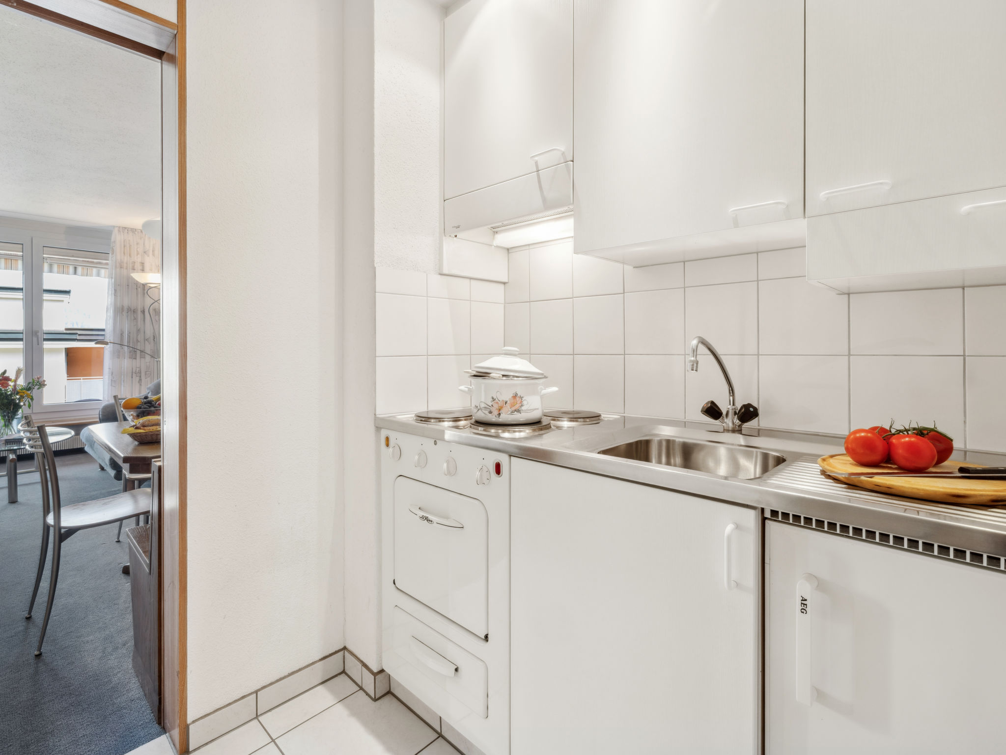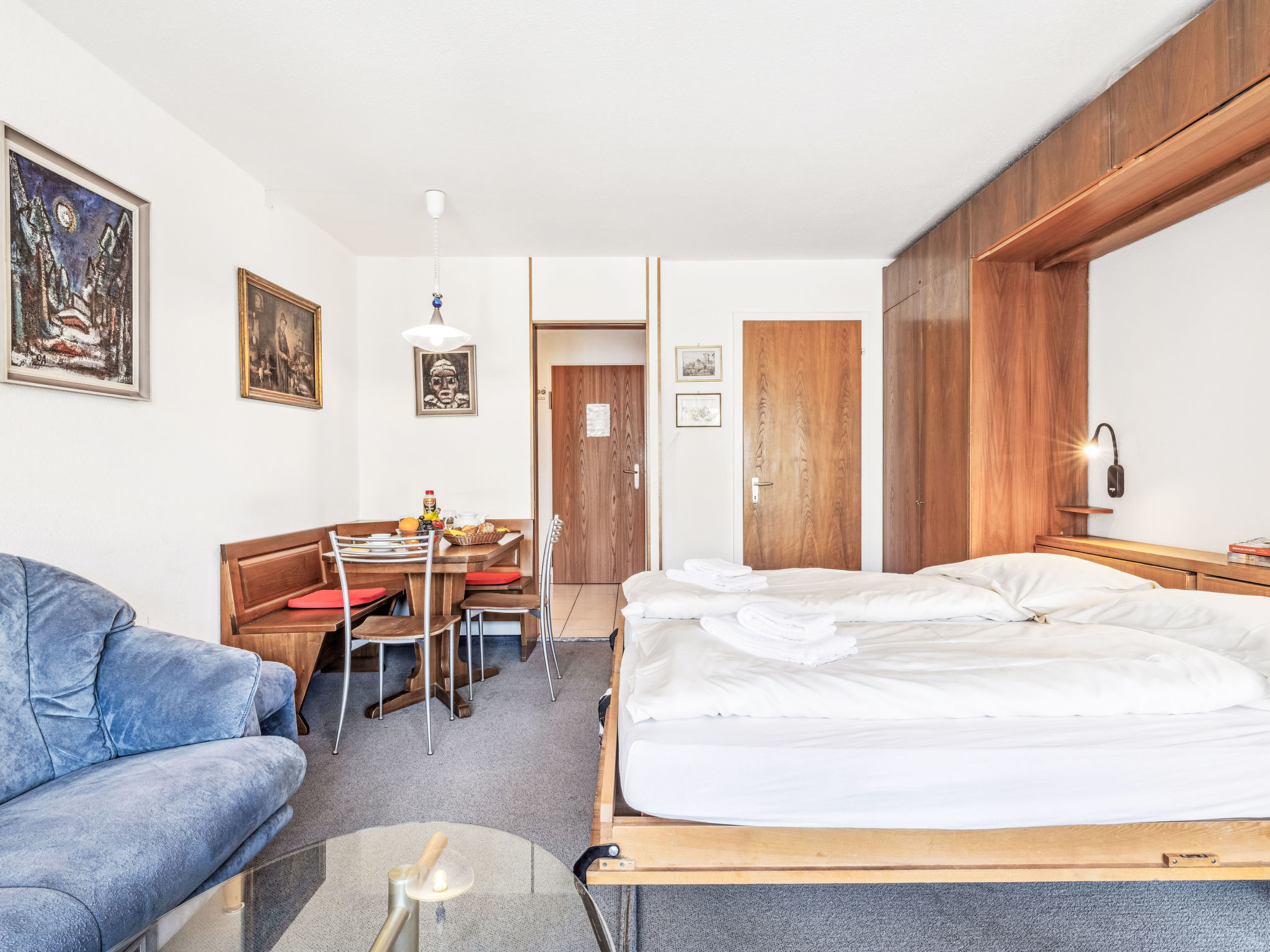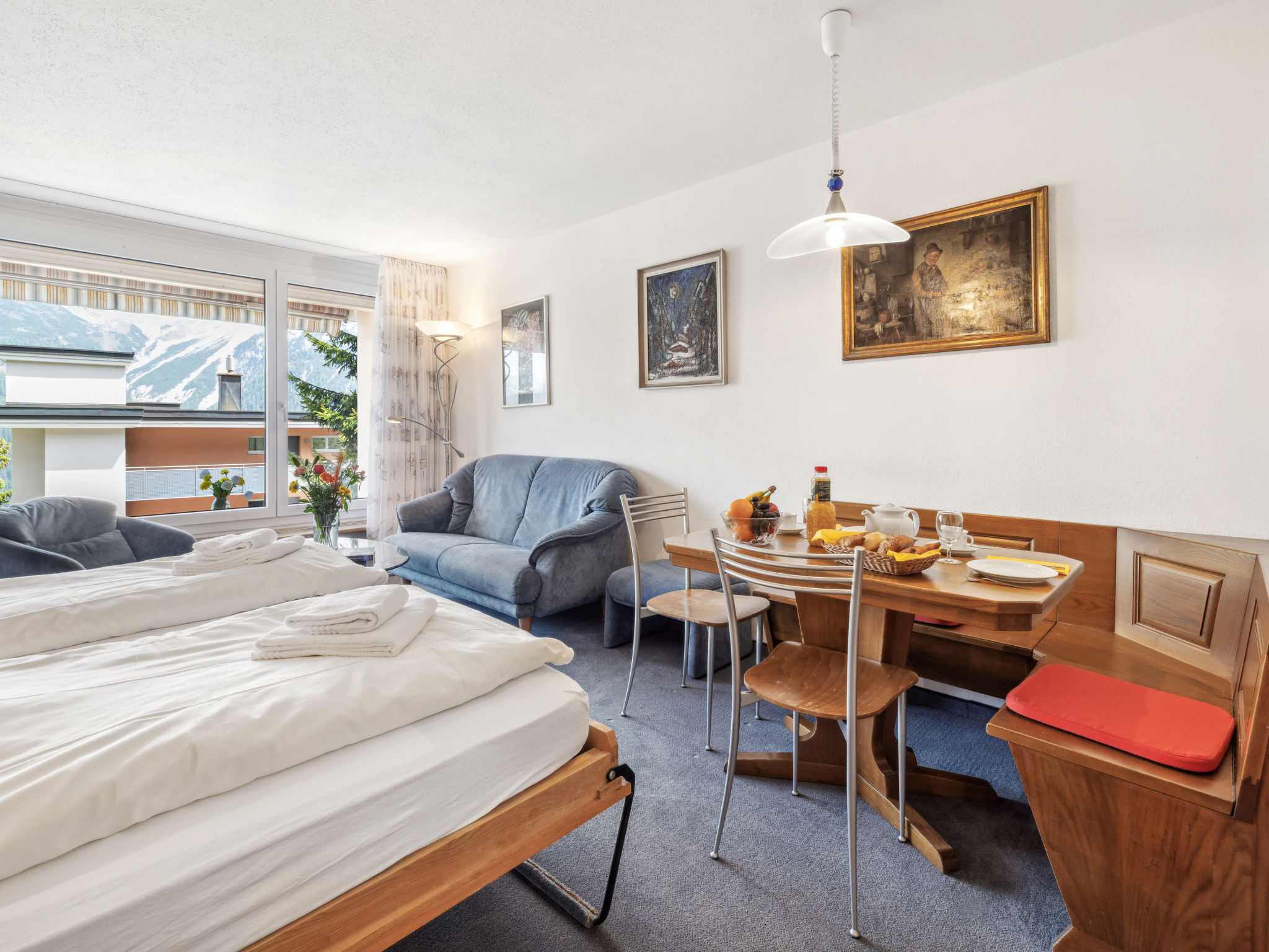 "Promenade Apt 004", 1-Zimmer-Wohnung 28 m2, im Erdgeschoss. Gemütlich eingerichtet: Wohn-/Esszimmer mit 2 Wandschrankbetten und Sat-TV (Flachbildschirm), Radio. Ausgang zum Gartensitzplatz. Kochnische (3 Kochplatten, Backofen). Dusche/WC. Gartensitzplatz, Ostlage. Schöne Sicht auf die Berge, die Landschaft und die Ortschaft. Zur Verfügung: Internet (WLAN, gratis). Bitte beachten: Nichtraucher-Unterkunft.