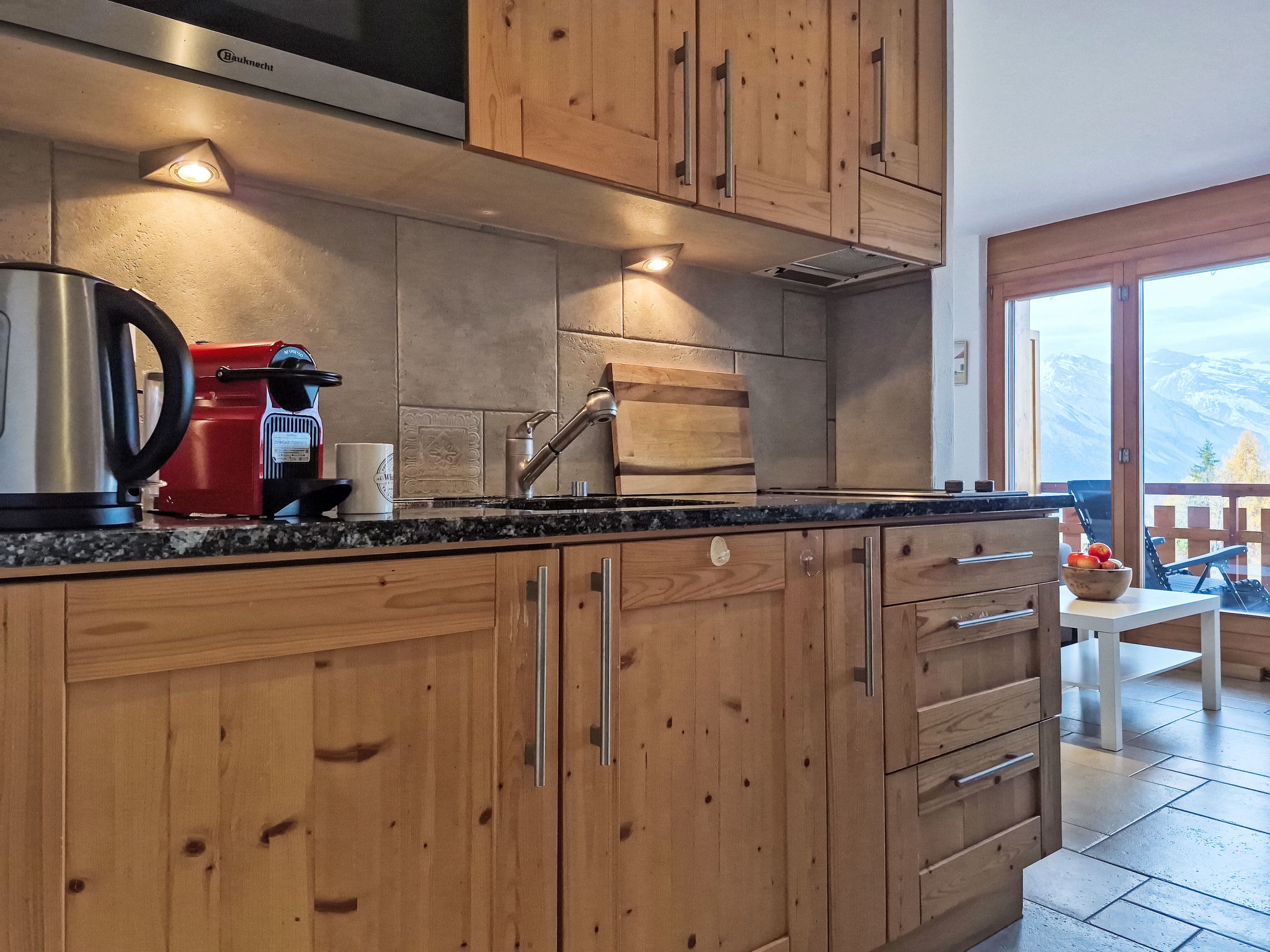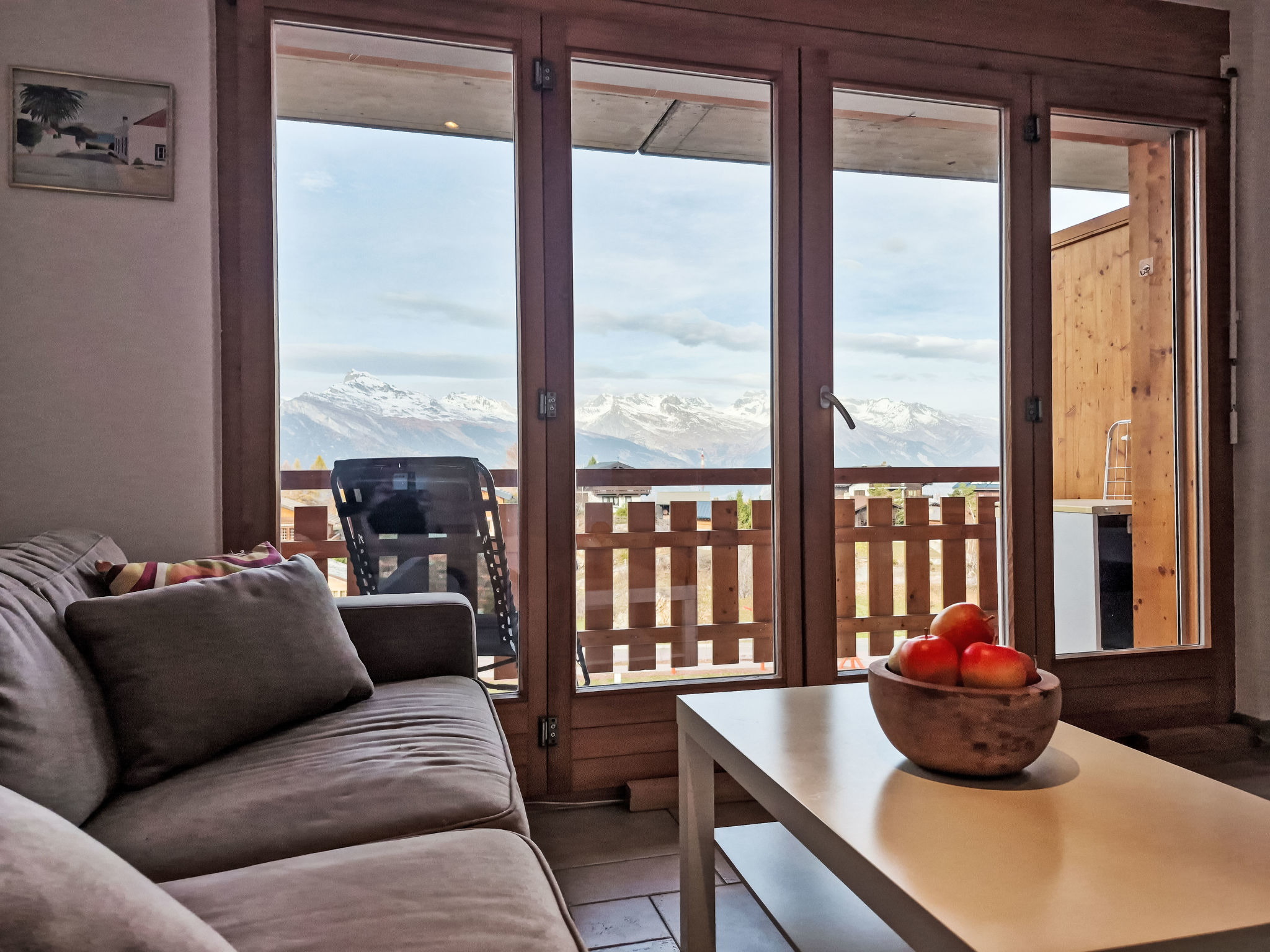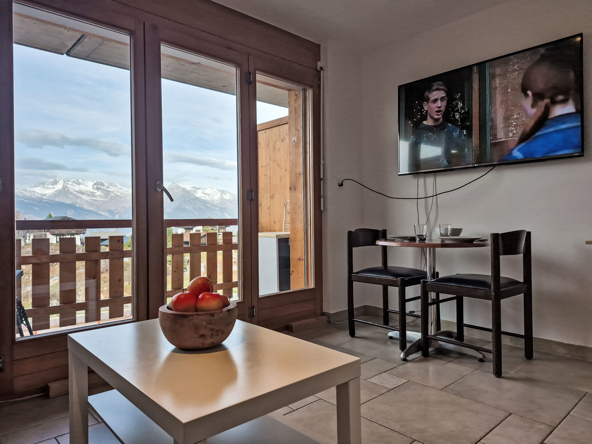 "Domaine des Reines D10", 1-Zimmer-Studio 22 m2 im 4. Stock, Nordlage. Komfortabel und schön eingerichtet: Wohn-/Schlafzimmer mit 1 franz. Bett (160 cm, Länge 200 cm), Kabel-TV. Ausgang zum Balkon. Offene Küche im Eingang (2 Glaskeramikplatten, Toaster, Wasserkocher, Mikrowelle, elektrische Kaffeemaschine, Kapseln für die Kaffeemaschine (Nespresso) extra). Dusche/WC. Balkon 7 m2, Nordlage. Balkonmöbel. Sehr schöne Sicht auf die Berge. Zur Verfügung: Internet (WLAN, gratis). Parkplatz. Bitte beachten: Nichtraucher-Unterkunft.