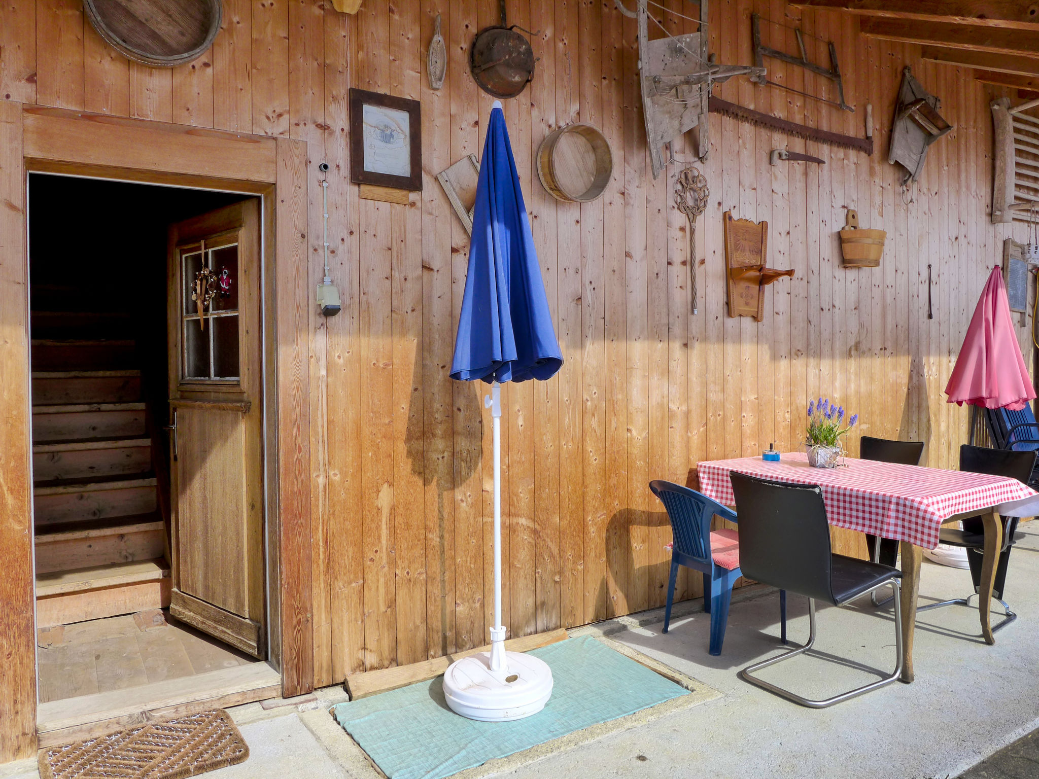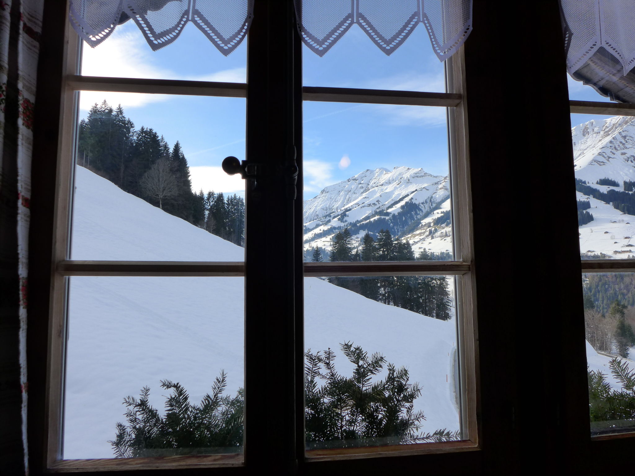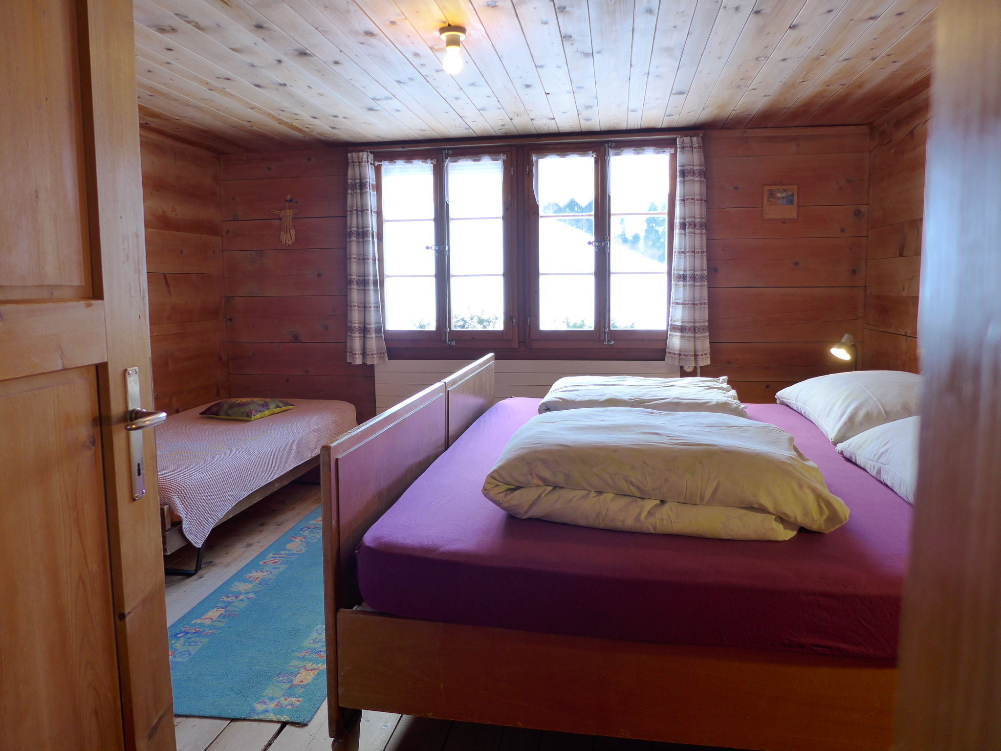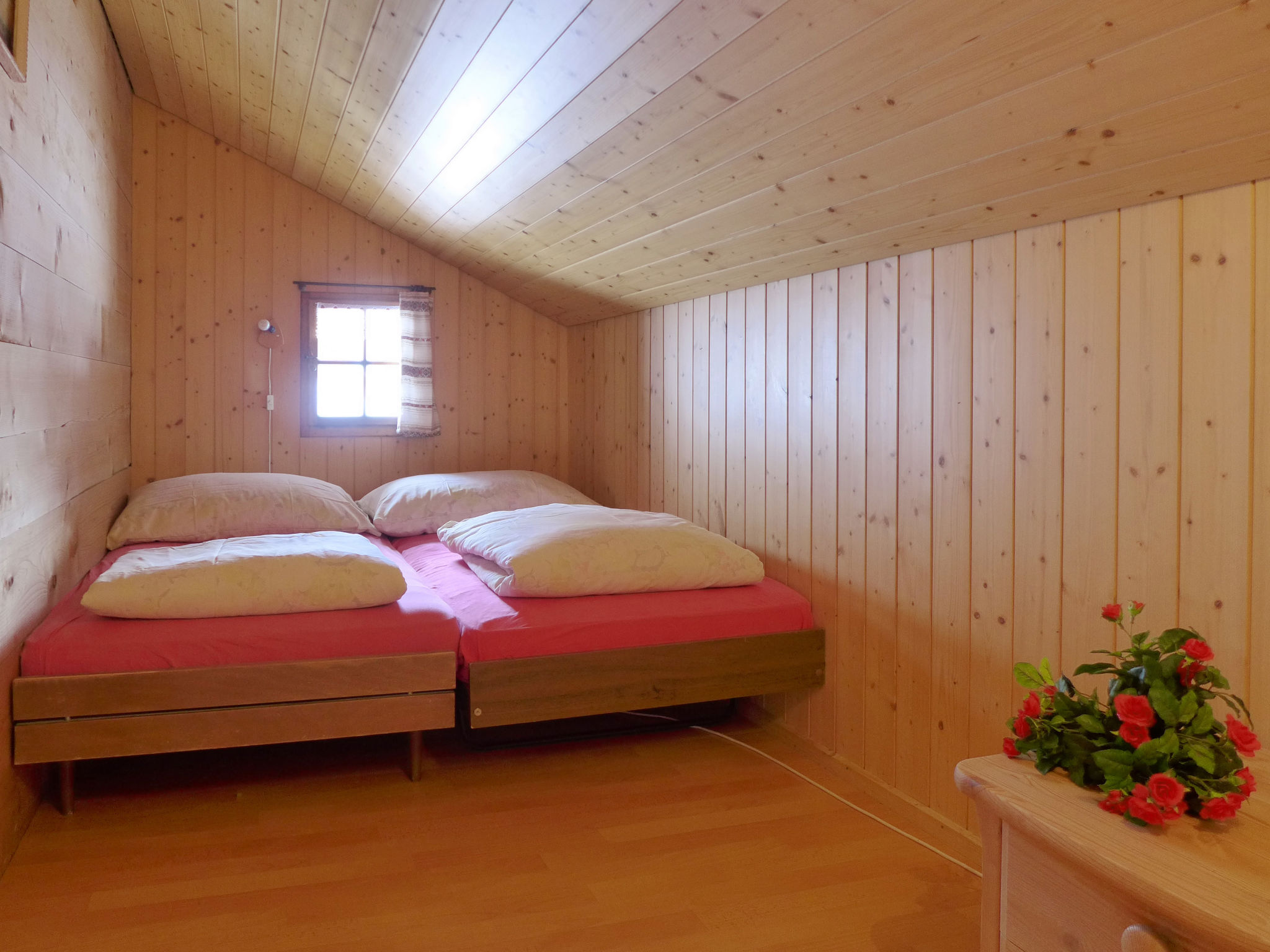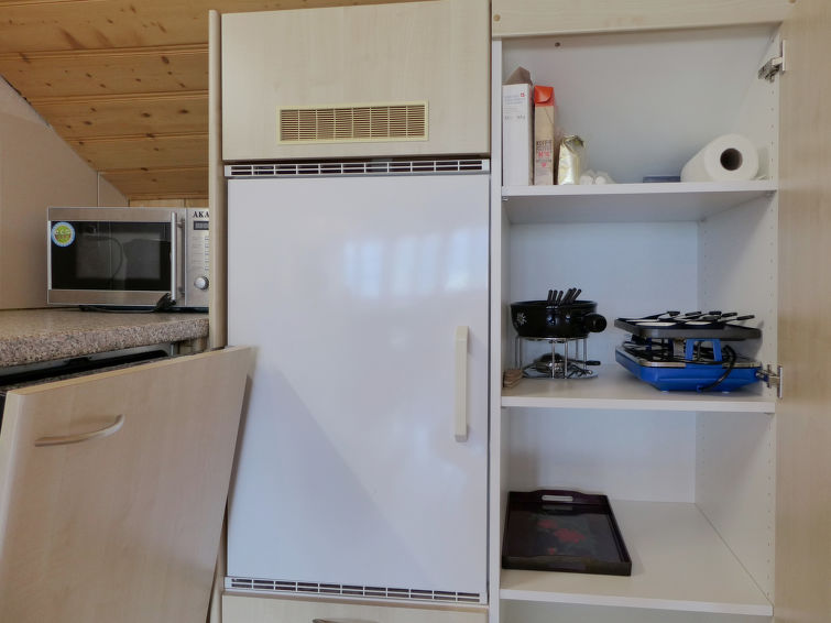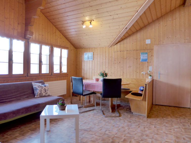 4-Zimmer-Wohnung 50 m2, im Dachgeschoss. Hell, teilweise abgeschrägt, zweckmässig und gemütlich eingerichtet: grosses Wohn-/Esszimmer mit Essecke, Digital-TV, Flachbildschirm, DVD und DVD Sammlung vorhanden. 1 grosses Zimmer mit 1 Doppelbett (2 x 90 cm, Länge 200 cm), 1 Schlafmöglichkeit. 1 abgeschrägtes Zimmer mit 2 Betten (90 cm, Länge 190 cm). 1 abgeschrägtes Zimmer mit 1 franz. Bett (160 cm, Länge 190 cm). Offene Küche (3 Kochplatten, Backofen, Geschirrspüler, Toaster, Wasserkocher, Mikrowelle, elektrische Kaffeemaschine, Racletteofen, Fondue Set (Käse)) mit kleinem Esstisch. Dusche/WC. Gartensitzplatz. Terrassenmöbel, Gartengrill. Schöne Sicht auf die Berge und die Landschaft. Zur Verfügung: Babybett bis 3 Jahre. Internet (WLAN, gratis). Parkplatz (überdacht). Bitte beachten: geeignet für Familien. Nichtraucher-Unterkunft. Maximal 1 Haustier/Hund erlaubt.