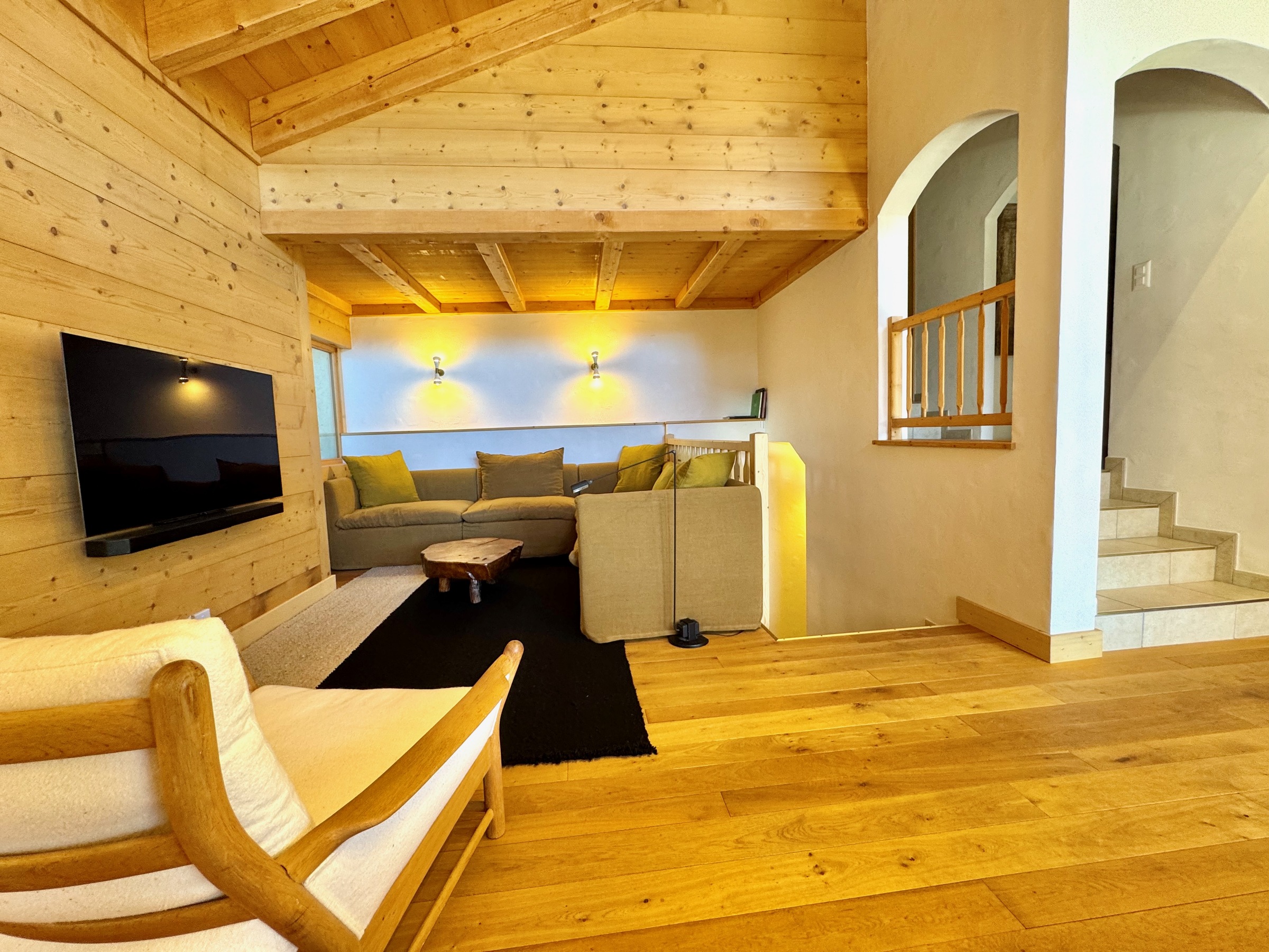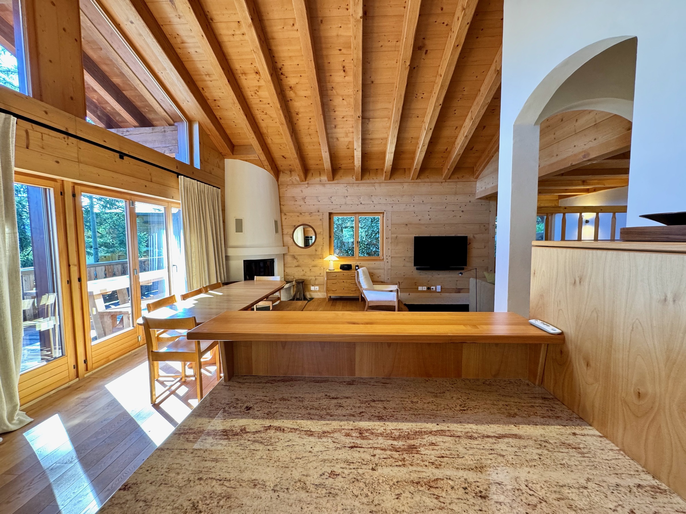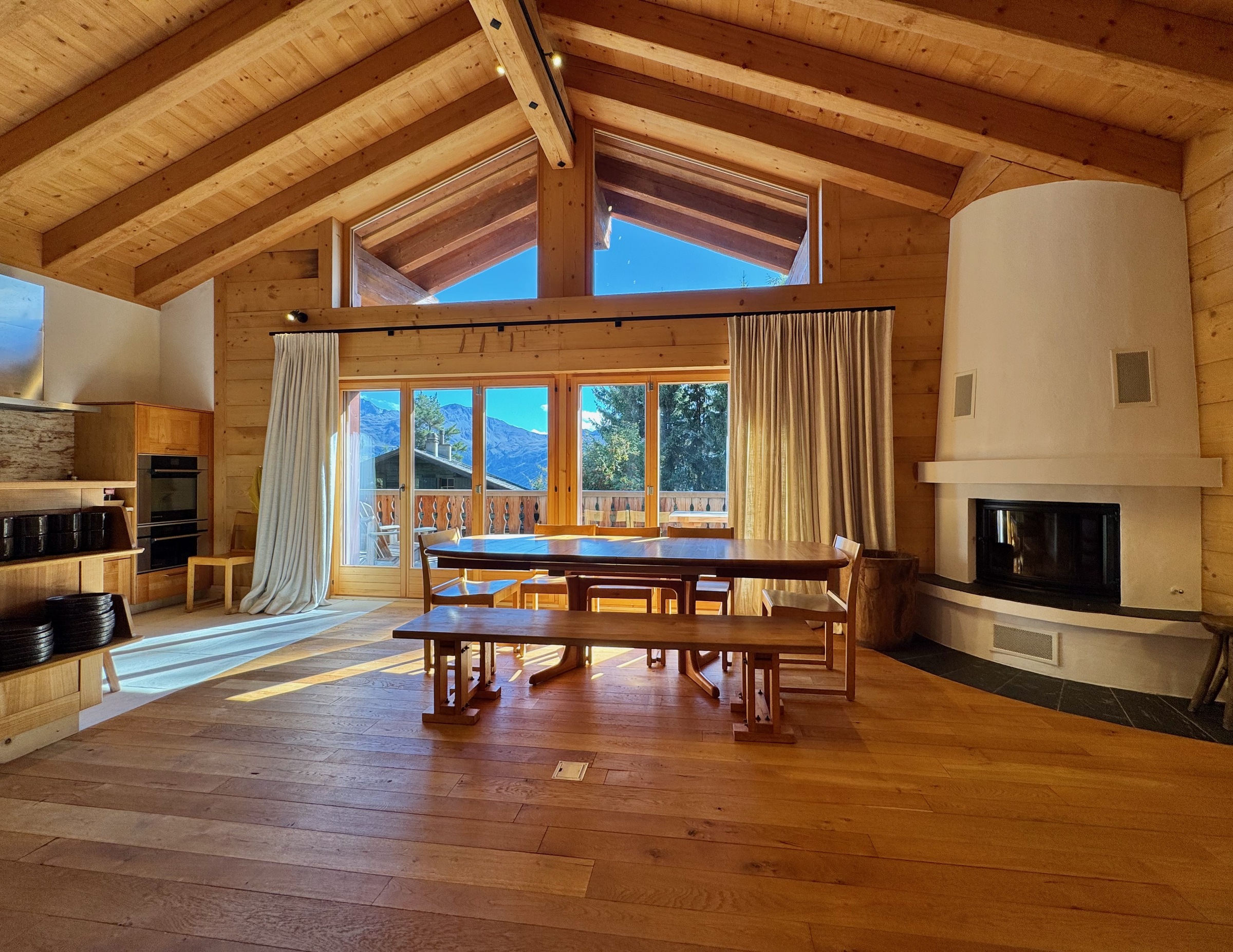 Im Obergeschoss befindet sich der Hauptwohnbereich, offen und luftig, mit einer gut ausgestatteten Küche, einem großen Esstisch, einem Kamin, einem bequemen Sofabereich und Zugang zum Balkon mit Sitzgelegenheiten im Freien, um den Blick auf die Berge zu genießen.