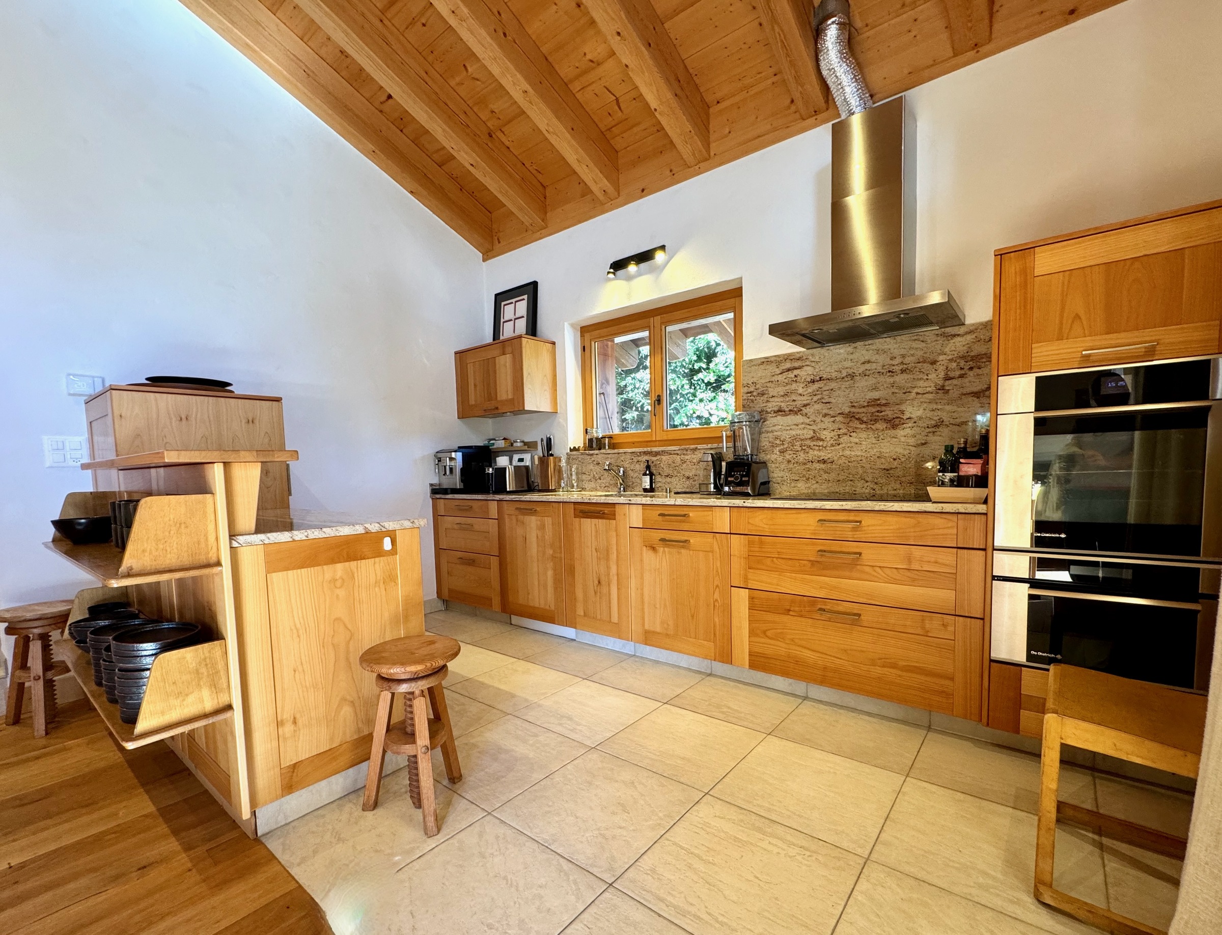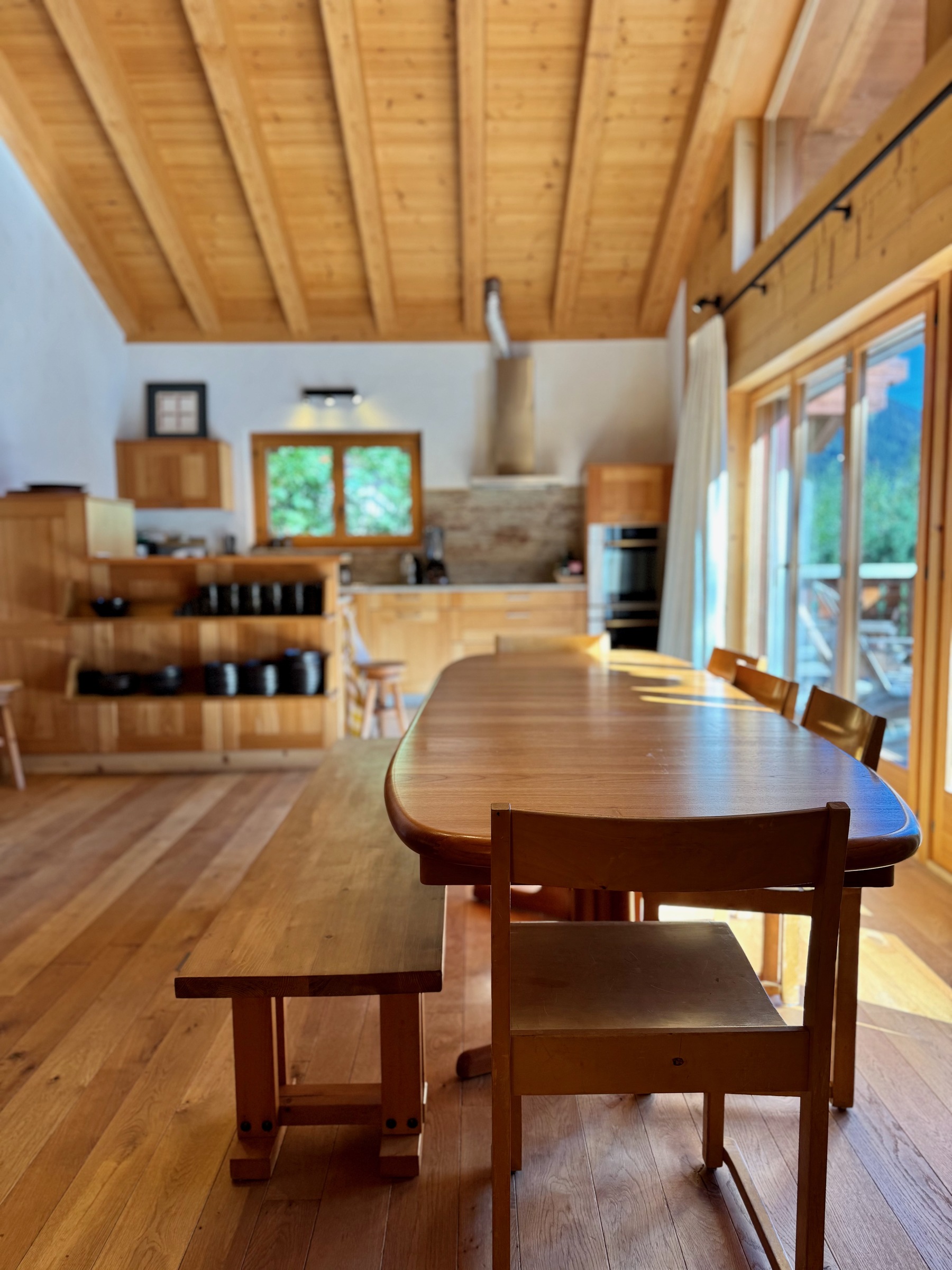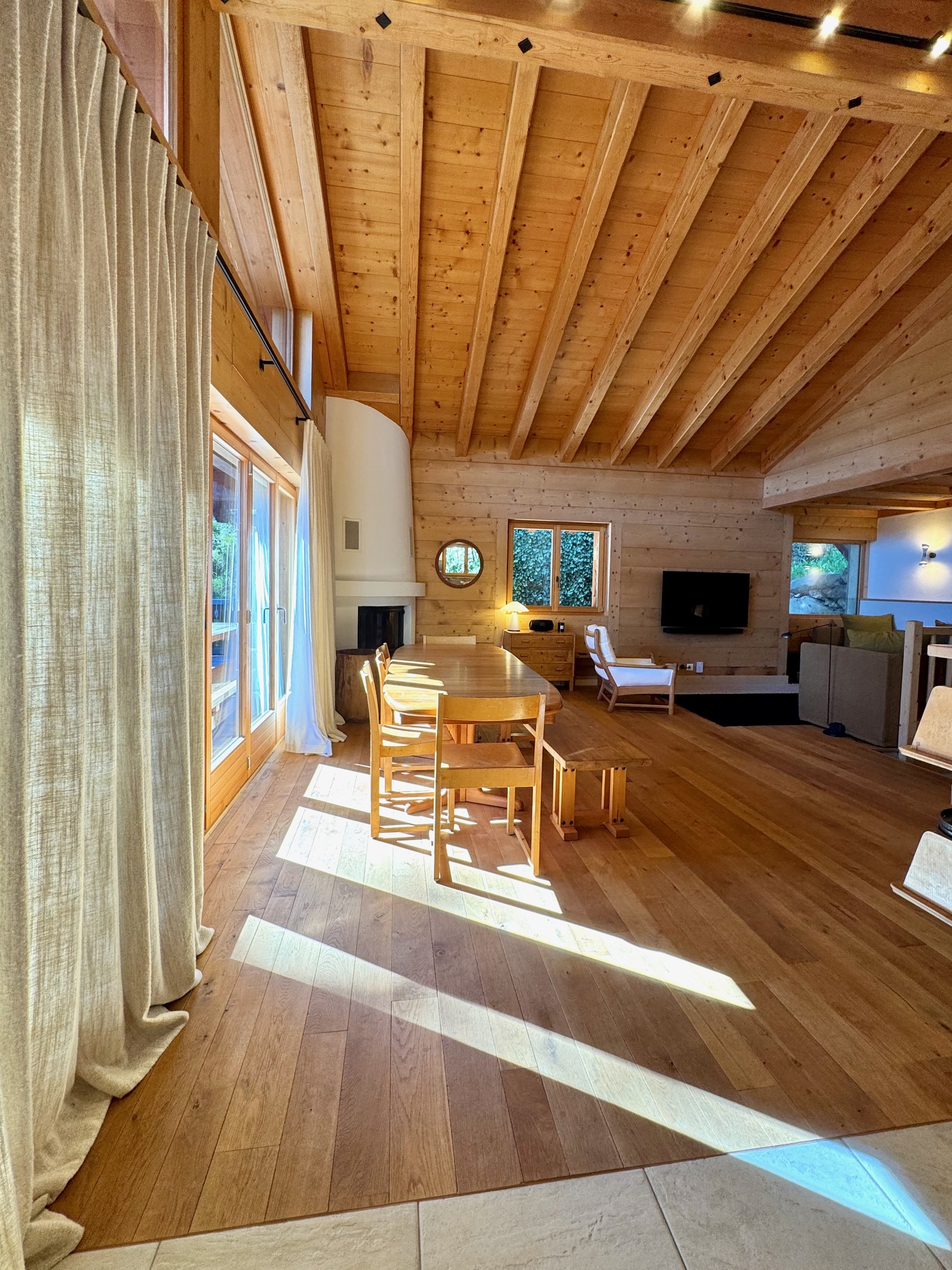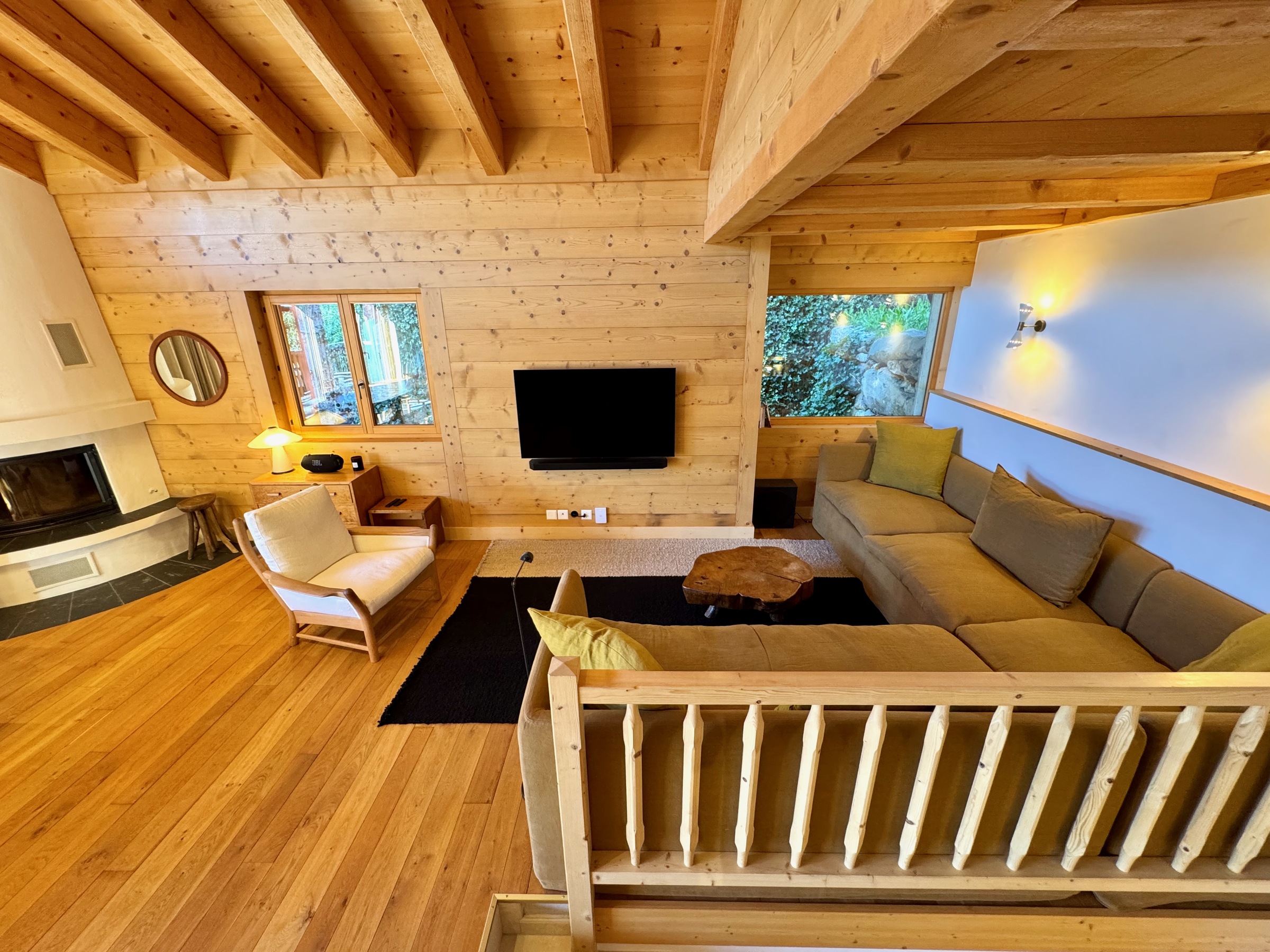 Im Obergeschoss befindet sich der Hauptwohnbereich, offen und luftig, mit einer gut ausgestatteten Küche, einem großen Esstisch, einem Kamin, einem bequemen Sofabereich und Zugang zum Balkon mit Sitzgelegenheiten im Freien, um den Blick auf die Berge zu genießen.