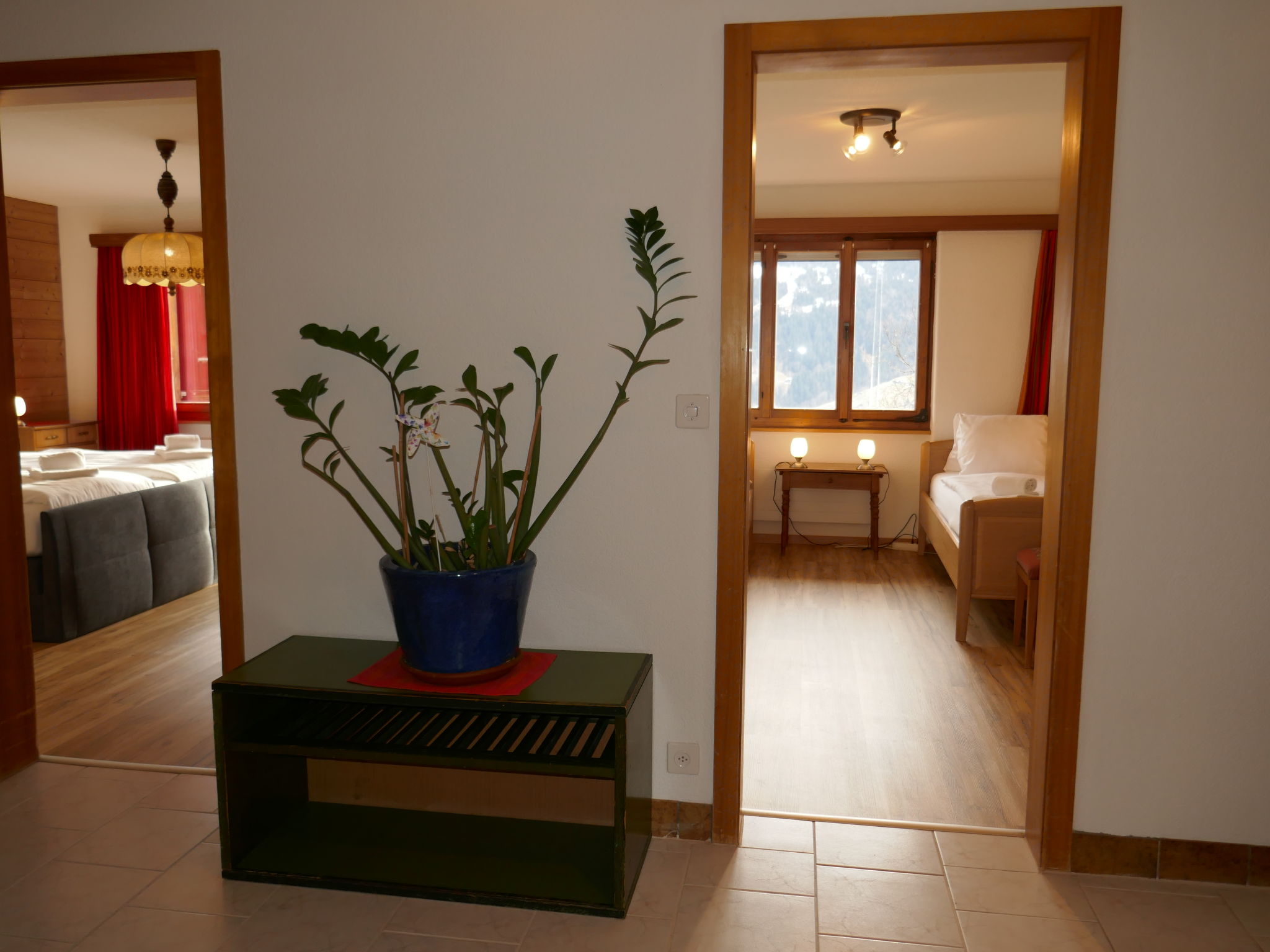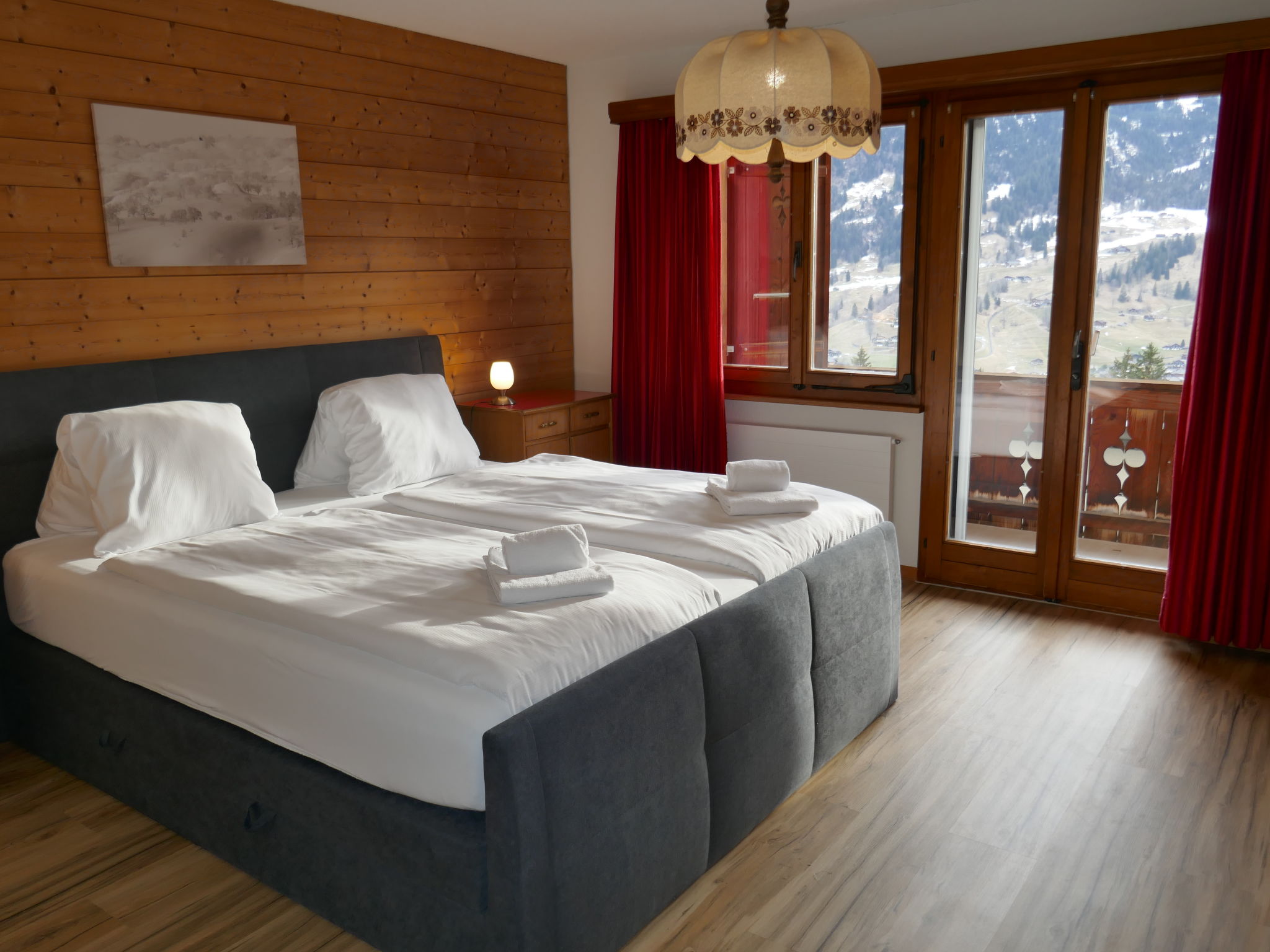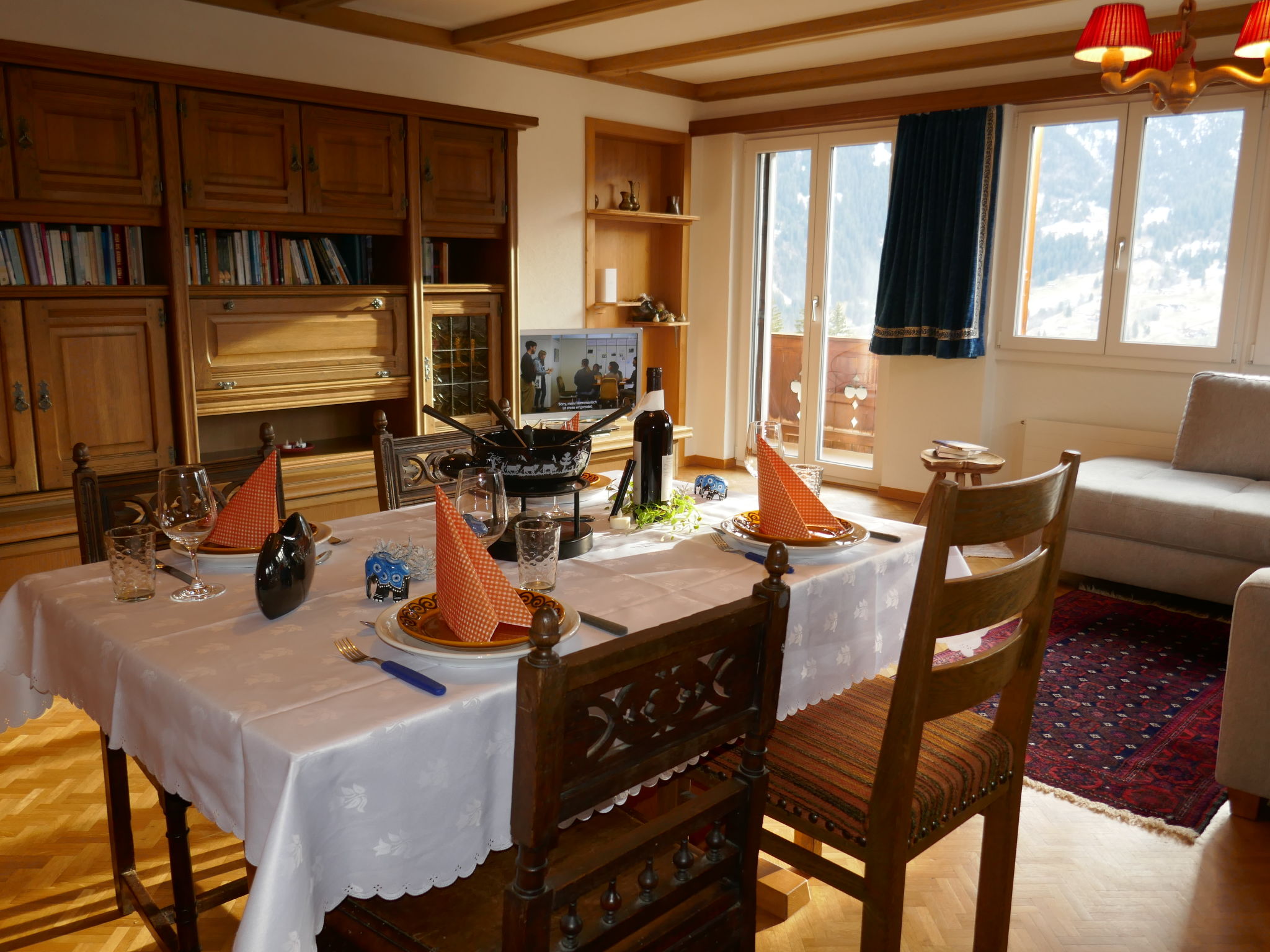 4-Zimmer-Wohnung 110 m2, im erhöhten Erdgeschoss, Südlage. Geräumig, zweckmässig und gemütlich eingerichtet: Wohnzimmer mit Sat-TV. Ausgang zum Balkon, Richtung Süden. 1 Zimmer mit 2 Betten (90 cm, Länge 200 cm). 1 Zimmer mit 1 franz. Bett (160 cm, Länge 200 cm). 1 Zimmer mit 1 Bett (180 cm, Länge 200 cm), Bad/WC. Ausgang zum Balkon, Richtung Süden. Grosse Wohnküche (Backofen, Geschirrspüler, 4 Glaskeramikplatten, Toaster, Wasserkocher, elektrische Kaffeemaschine, Racletteofen, Fondue Set (Käse)). Dusche/WC. Parkettboden, Natursteinboden. Balkon, Südlage und Westlage. Balkonmöbel. Herrliche Sicht auf die Berge und die Landschaft. Zur Verfügung: Internet (Wireless LAN, gratis). Parkplatz beim Haus. Bitte beachten: geeignet für Familien. Nichtraucher-Unterkunft. Eigener Eingang, Feuerlöscher.