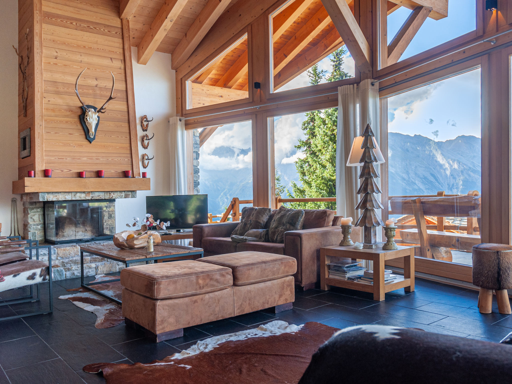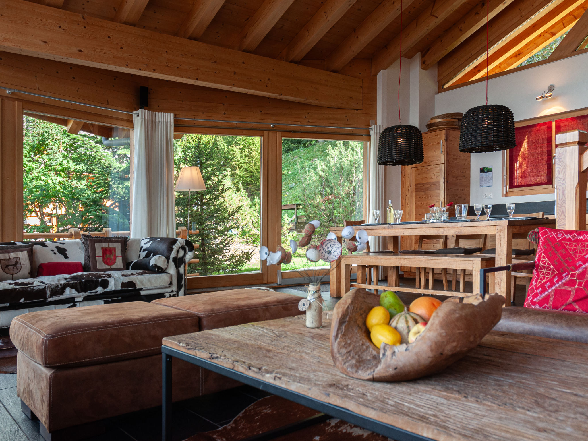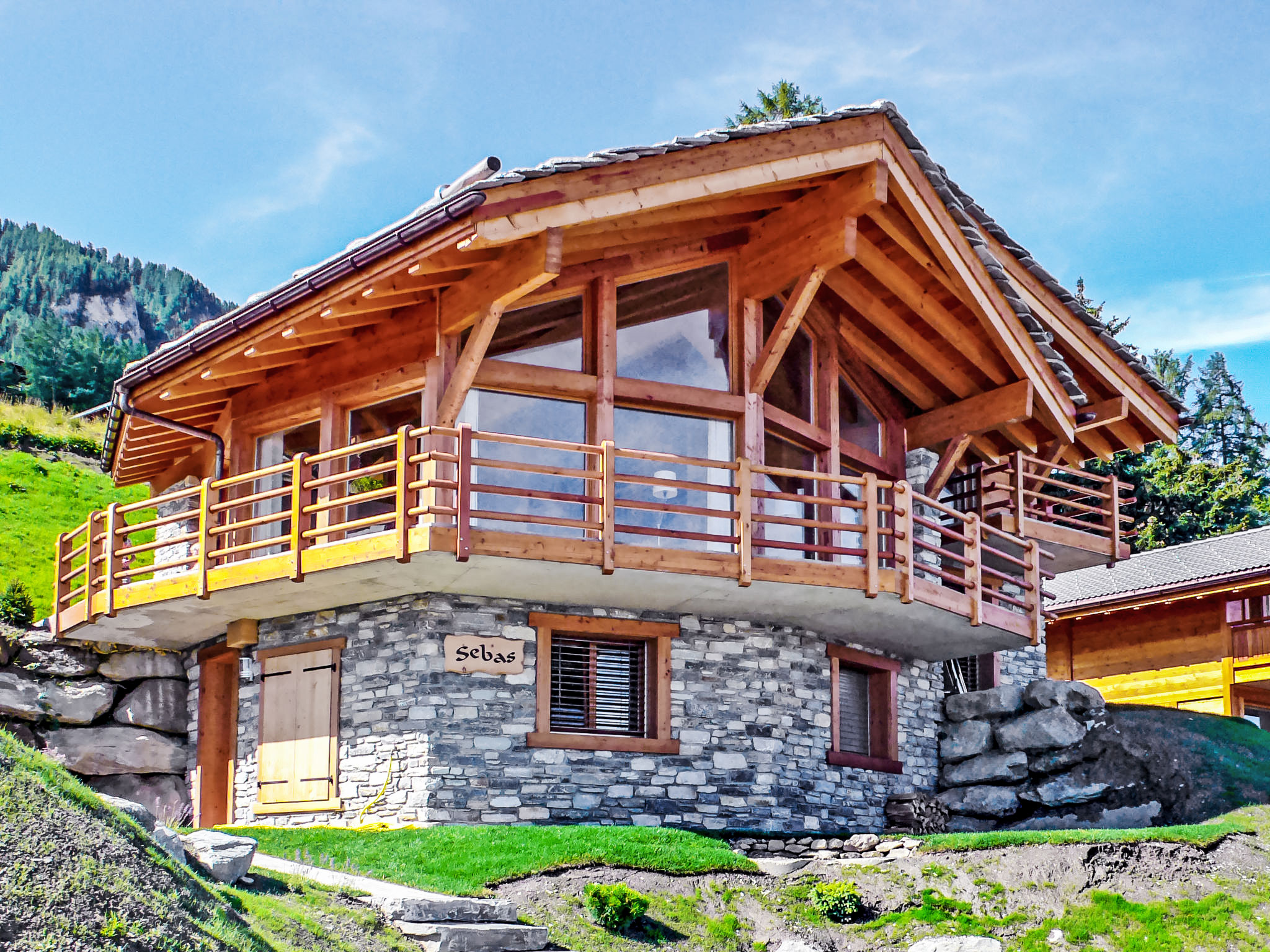 "Sebas", 5-Zimmer-Chalet 150 m2 auf 3 Stockwerken. Geräumig, komfortabel und geschmackvoll eingerichtet: grosses Wohn-/Esszimmer mit Panoramafenster mit offenem Kamin, Kabel-TV und CD. Ausgang zur Terrasse. 1 Zimmer mit 1 Doppelbett (180 cm, Länge 200 cm), Bad/Dusche/WC. Ausgang zur Terrasse. Offene Küche (Backofen, Geschirrspüler, 4 Induktionskochplatten, Toaster, Wasserkocher, elektrische Kaffeemaschine, Kapseln für die Kaffeemaschine (nespresso) extra, Racletteofen, Fondue Set (Käse)). Heizung. Unteres Geschoss: 1 Zimmer mit 1 Doppelbett (180 cm, Länge 200 cm). Dusche, sep. WC, Sauna. Obergeschoss: 1 Zimmer mit 2 Betten (90 cm, Länge 200 cm). 1 Zimmer mit 1 Doppelbett (180 cm, Länge 200 cm). Ausgang zum Balkon, Richtung Norden. Dusche/WC. Balkon, Nordlage und Westlage, grosse Terrasse 50 m2, Südlage und Ostlage. Gartengrill (mobil). Sehr schöne Sicht auf die Berge und das Tal. Zur Verfügung: Waschmaschine, Wäschetrockner, Sauna, Kinderhochstuhl, Babybett, Haartrockner. Internet (WLAN, gratis). Parkplatz (2 Autos). E-Ladestation. Bitte beachten: Nichtraucher-Unterkunft.
