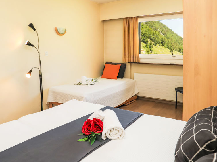 "Rosablanche C54", 2-Zimmer-Wohnung 60 m2 im 5. Stock. Komfortabel eingerichtet: Wohn-/Esszimmer mit 2 Diwanbetten (80 cm, Länge 200 cm), Kabel-TV. 1 Zimmer mit 1 Bett (90 cm, Länge 190 cm), 1 Ausziehbett (2 Pers. 2 x 90 cm, Länge 190 cm). Kochnische (Geschirrspüler, 4 Glaskeramikplatten, Toaster, Wasserkocher, elektrische Kaffeemaschine, Kapseln für die Kaffeemaschine (Nespresso) extra, Kombinationsmikrowelle, Fondue Set (Käse)). 2 Bäder/WC. Balkon, Südlage. Sicht auf die Skipiste. Zur Verfügung: Haartrockner. Internet (Wireless LAN, gratis). Bitte beachten: Nichtraucher-Haus. Aufzug C.
