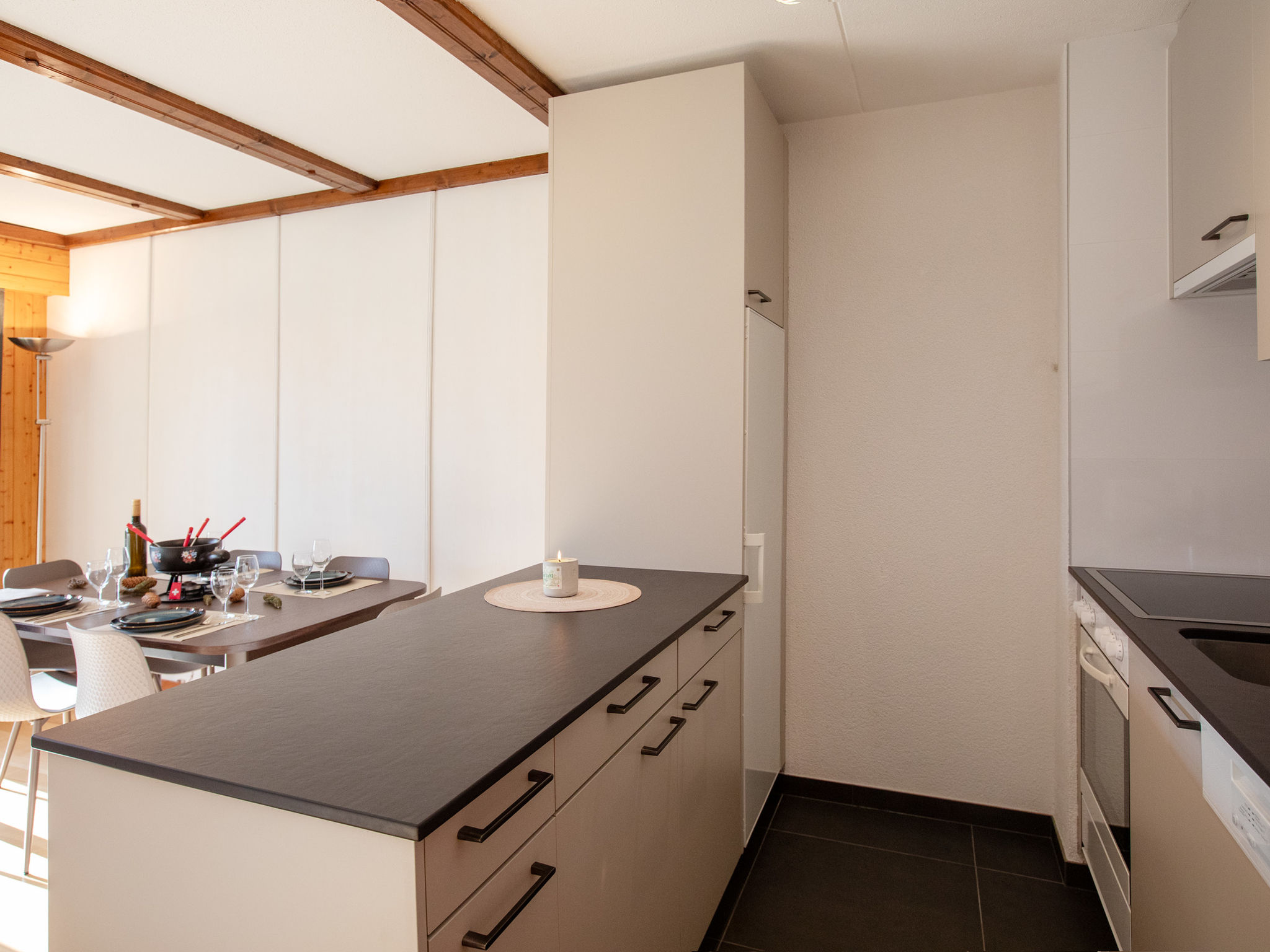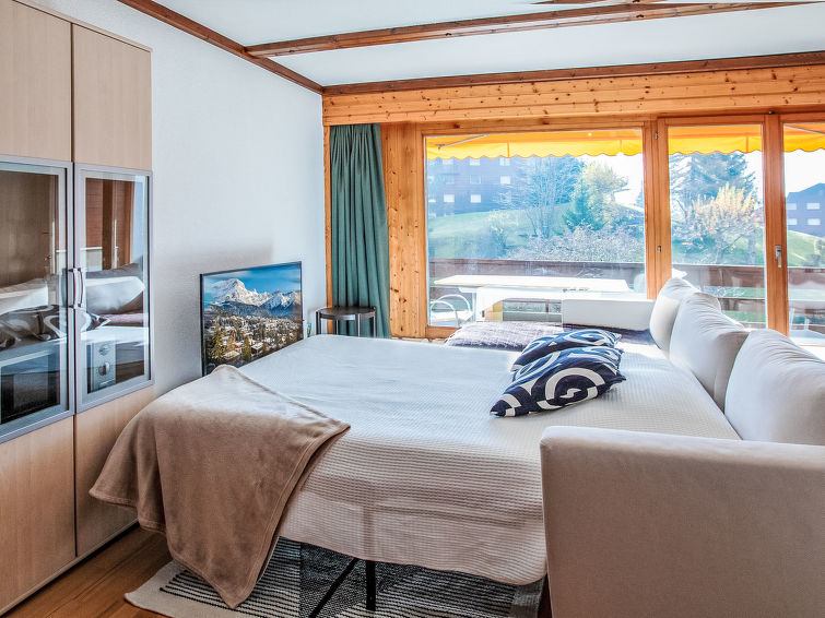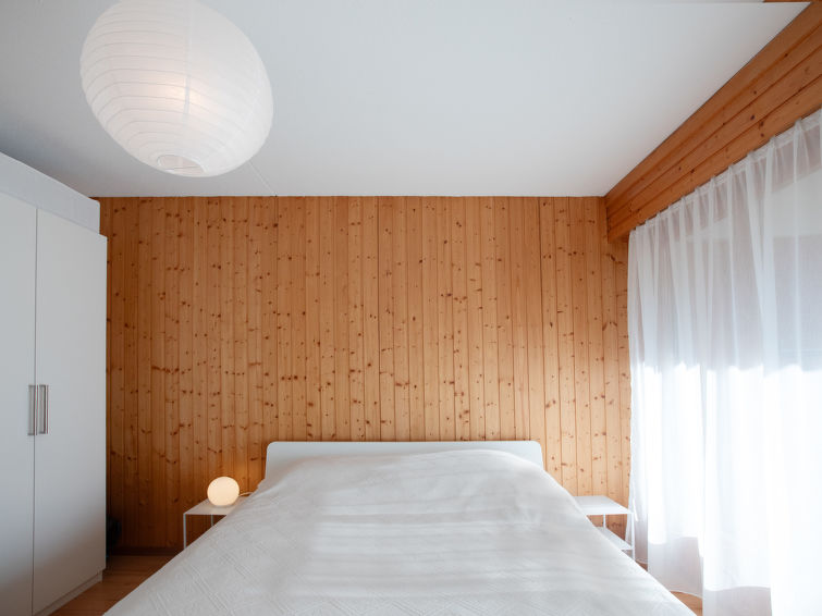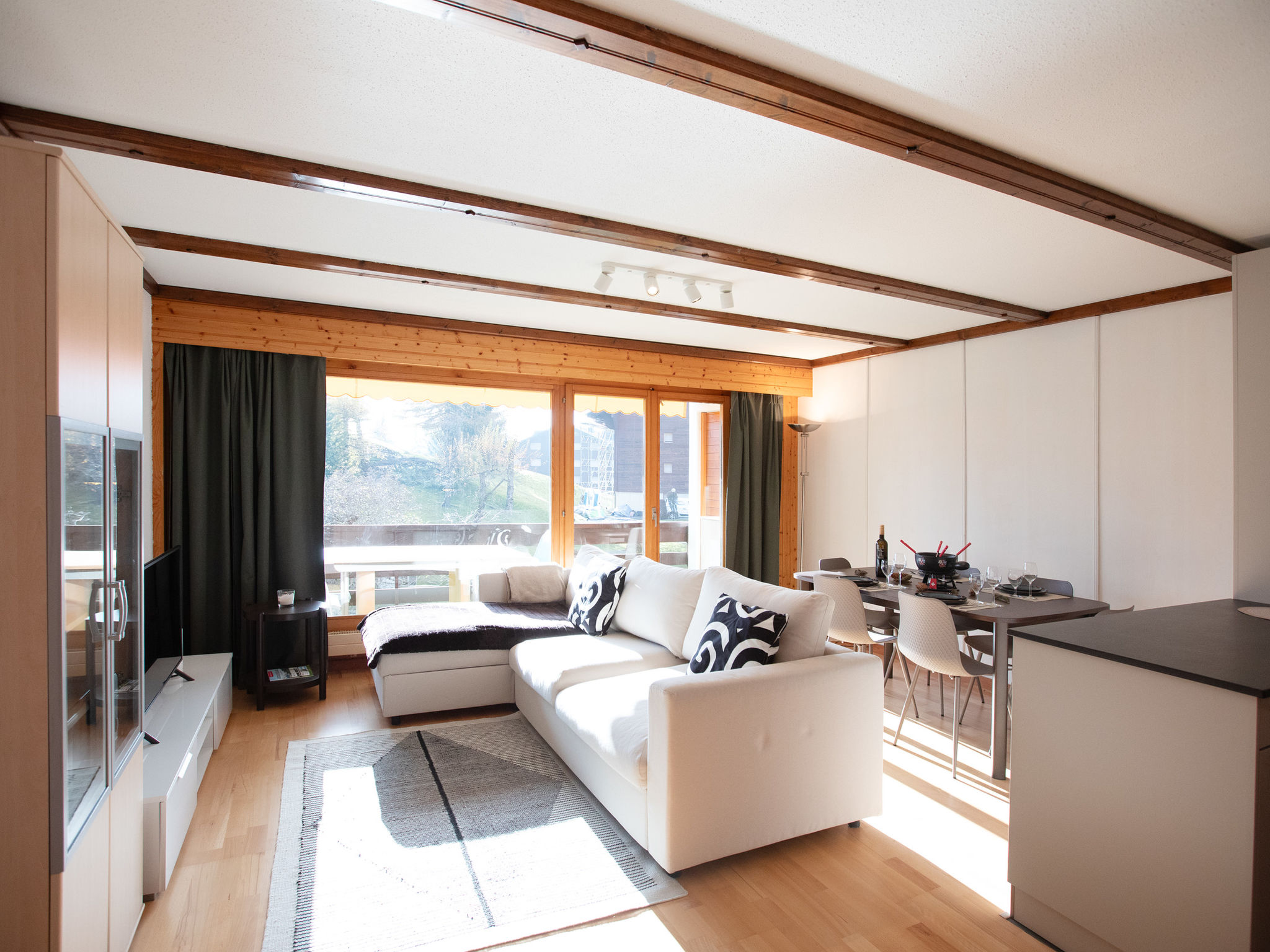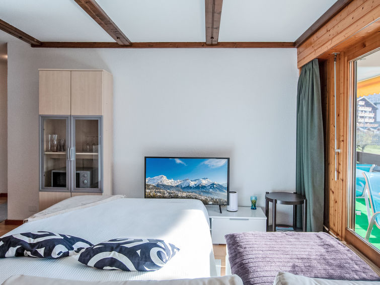 "Opale 24", 2-Zimmer-Wohnung 48 m2 im 2. Stock, Südlage. Teilweise renoviert im Jahre 2024, zweckmässig und komfortabel eingerichtet: Wohn-/Esszimmer mit Panoramafenster mit 1 Diwanbett (160 cm), Esstisch und TV (Flachbildschirm). Ausgang zum Balkon, Richtung Süden. 1 Zimmer mit 1 franz. Bett (1 x 160 cm). Ausgang zum Balkon, Richtung Süden. Offene Küche (Backofen, Geschirrspüler, 4 Glaskeramikplatten, Toaster, Wasserkocher, Mikrowelle, elektrische Kaffeemaschine, Kapseln für die Kaffeemaschine (Nespresso) extra, Racletteofen, Fondue Set (Chinoise, Käse)). Bad/WC. Grosser Balkon, Südlage. Balkonmöbel. Eingeschränkte Sicht auf die Berge und die Landschaft. Zur Verfügung: Internet (Wireless LAN, gratis). Garage Nr. 19 (1 Auto). Bitte beachten: Nichtraucher-Unterkunft.