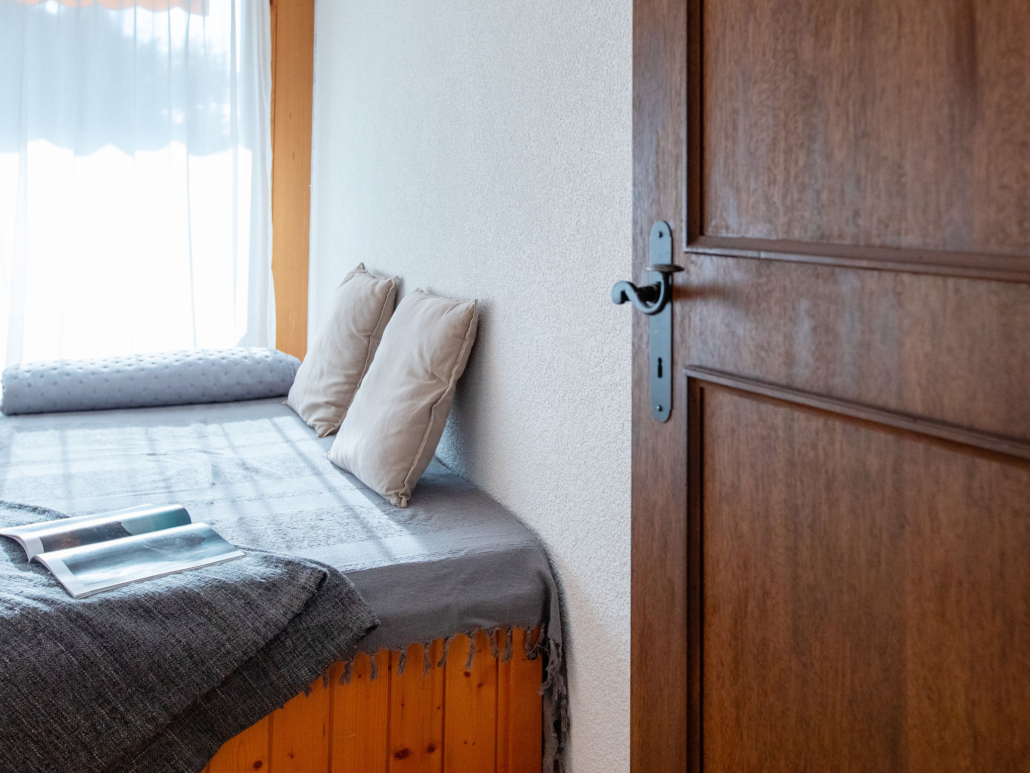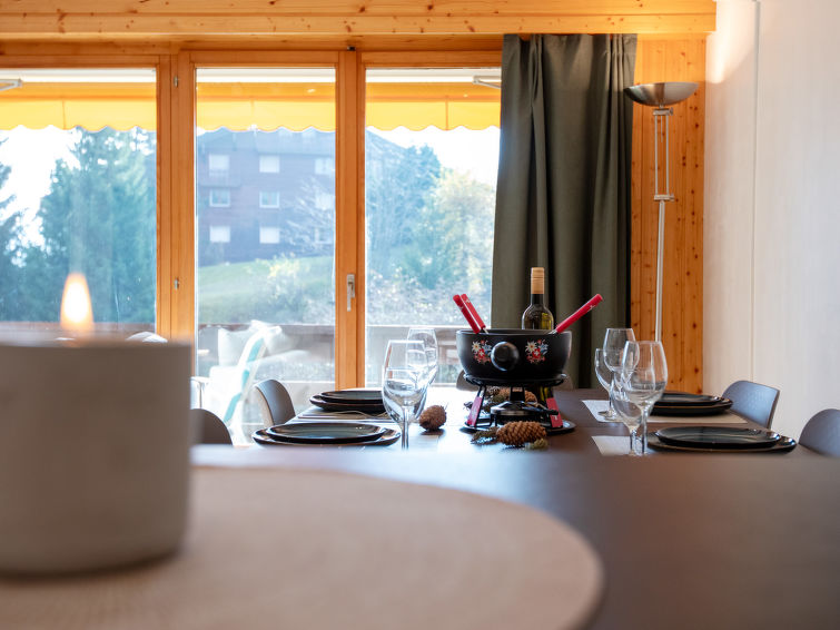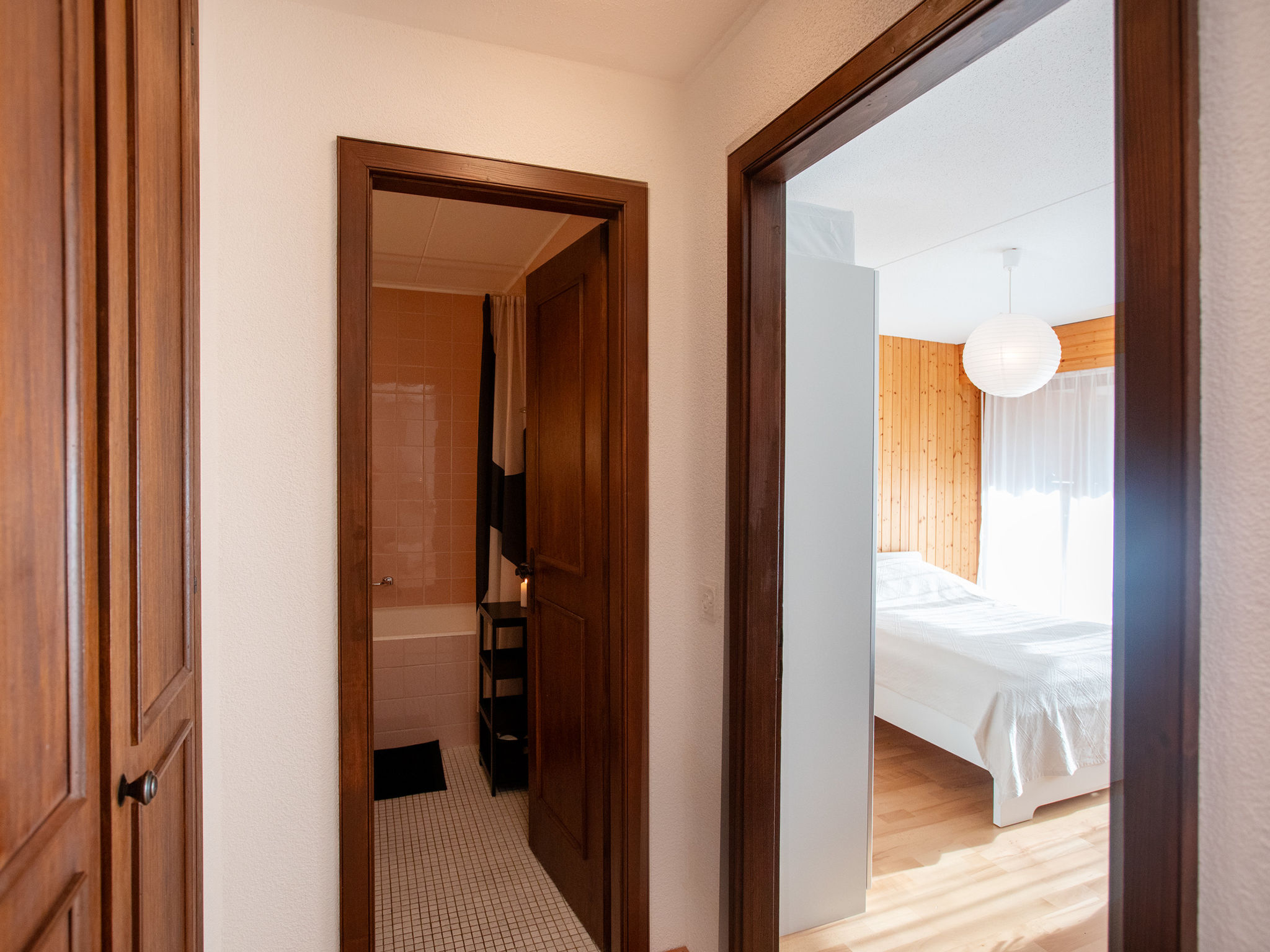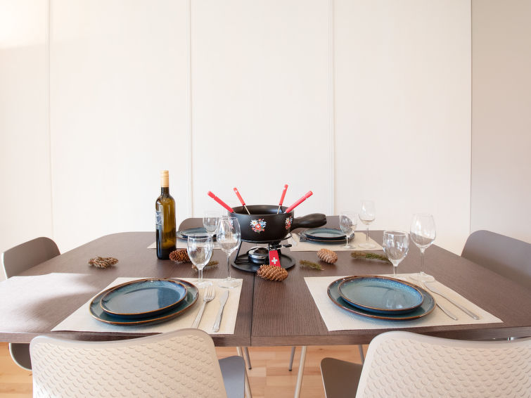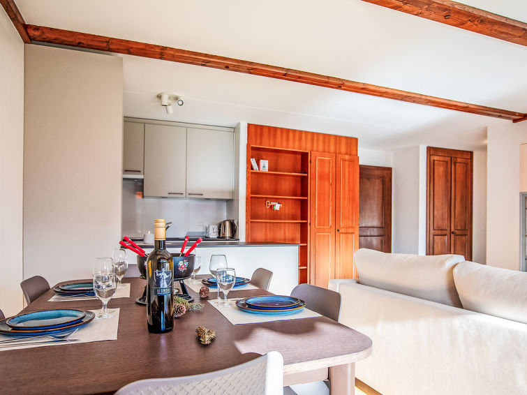 "Opale 24", 2-Zimmer-Wohnung 48 m2 im 2. Stock, Südlage. Teilweise renoviert im Jahre 2024, zweckmässig und komfortabel eingerichtet: Wohn-/Esszimmer mit Panoramafenster mit 1 Diwanbett (160 cm), Esstisch und TV (Flachbildschirm). Ausgang zum Balkon, Richtung Süden. 1 Zimmer mit 1 franz. Bett (1 x 160 cm). Ausgang zum Balkon, Richtung Süden. Offene Küche (Backofen, Geschirrspüler, 4 Glaskeramikplatten, Toaster, Wasserkocher, Mikrowelle, elektrische Kaffeemaschine, Kapseln für die Kaffeemaschine (Nespresso) extra, Racletteofen, Fondue Set (Chinoise, Käse)). Bad/WC. Grosser Balkon, Südlage. Balkonmöbel. Eingeschränkte Sicht auf die Berge und die Landschaft. Zur Verfügung: Internet (Wireless LAN, gratis). Garage Nr. 19 (1 Auto). Bitte beachten: Nichtraucher-Unterkunft.