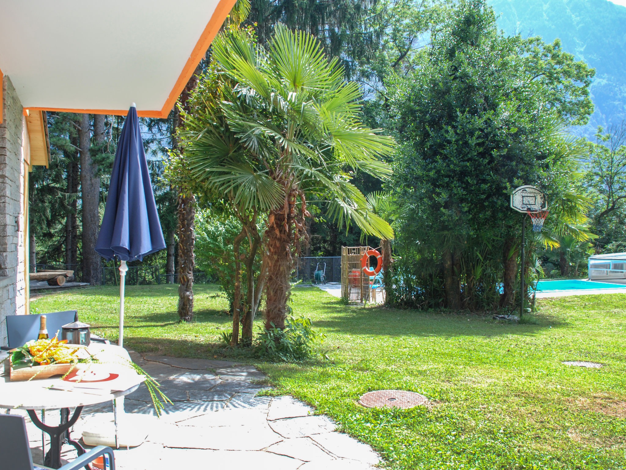 "Poolside", 2-Zimmer-Wohnung 45 m2, im Erdgeschoss, Südlage. Geräumig und hell, renoviert im Jahre 2018, komfortabel und gemütlich eingerichtet: offenes Wohn-/Esszimmer mit Kabel-TV und Flachbildschirm. Ausgang zum Garten, zum Gartensitzplatz. 1 Doppelzimmer mit 1 Bett (90 cm, Länge 200 cm), 1 Doppelbett (1 x 180 cm, Länge 200 cm). Offene Küche (Backofen, Geschirrspüler, 4 Glaskeramikplatten, Toaster, Wasserkocher, Tiefkühler, elektrische Kaffeemaschine, Kapseln für die Kaffeemaschine (CoffeeB (Migros)) extra, Racletteofen, Fondue Set (Käse)) mit Esstisch. Dusche/WC. Gartensitzplatz teilweise überdacht. Terrassenmöbel. Herrliche Panoramasicht auf die Landschaft. Zur Verfügung: Bügeleisen, Kinderhochstuhl, Babybett bis 2 Jahre (extra), Haartrockner. Internet (WLAN, gratis). Bitte beachten: Nichtraucher-Unterkunft. Maximal 1 Haustier/Hund erlaubt. Rauchmelder, Feuerlöscher. NL-00004819
