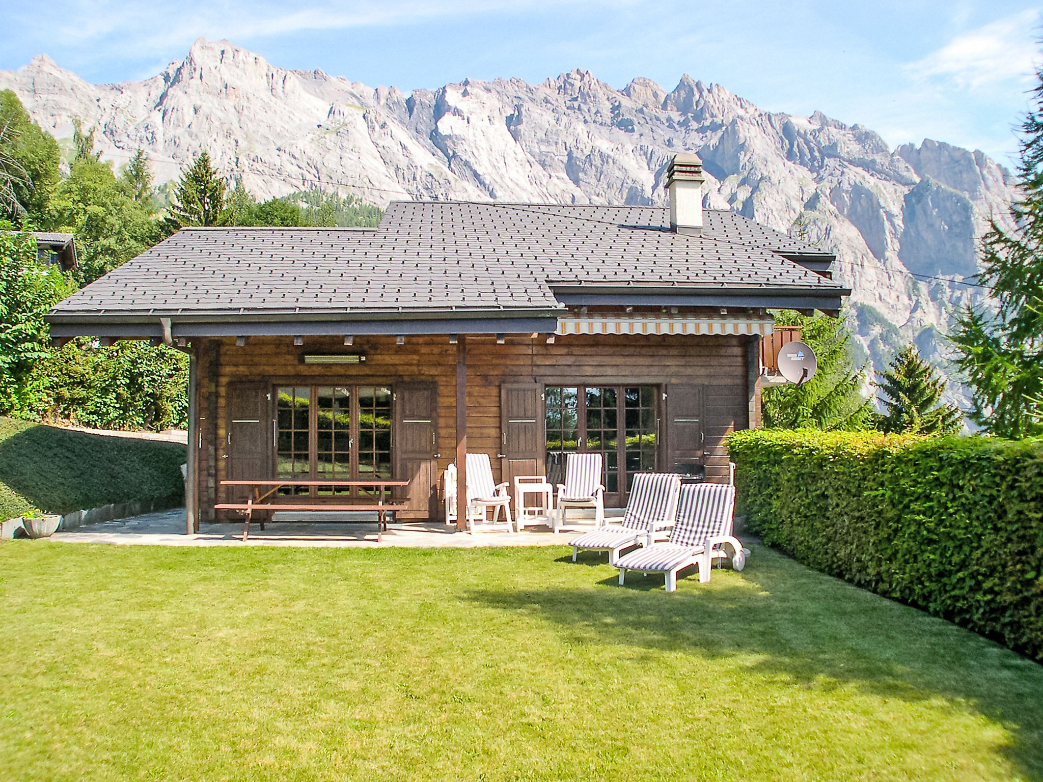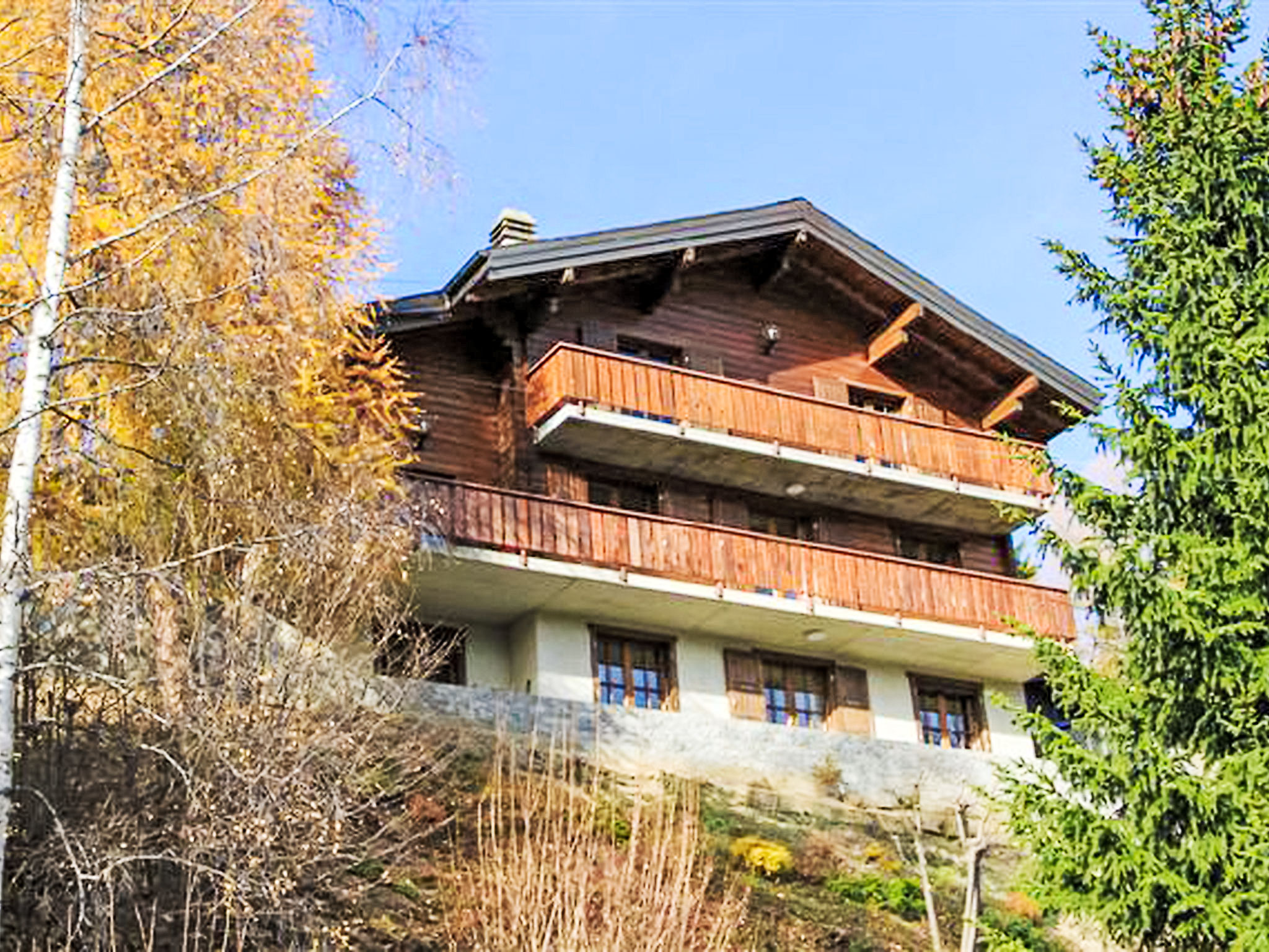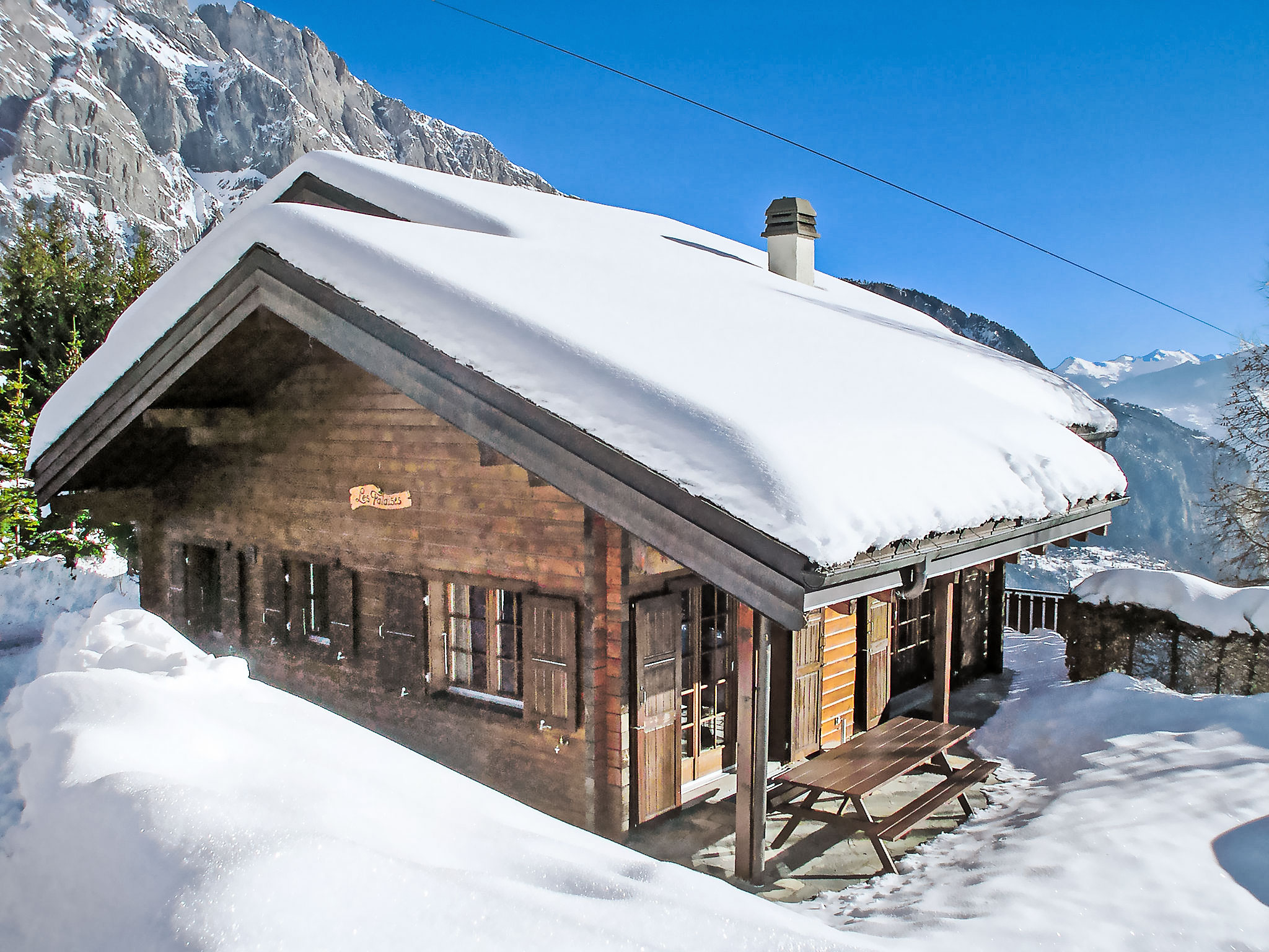 "Falaises", 5-Zimmer-Chalet 200 m2 auf 4 Stockwerken, Südlage. Komfortabel und geschmackvoll eingerichtet: 1 Zimmer mit 1 franz. Bett (160 cm, Länge 200 cm). 1 Zimmer mit 1 franz. Bett (180 cm). 1 Zimmer mit 2 Betten (90 cm, Länge 190 cm). Bad/WC, Doppelwaschbecken. E-Heizung. Unteres Geschoss: 1 Zimmer, ohne Fenster mit 2 Betten (90 cm, Länge 200 cm). Dusche/WC. Obergeschoss: Eingang. Grosses Wohn-/Esszimmer mit Essecke. Ausgang zum Balkon, zur Terrasse. Grosse, offene Küche (Backofen, Geschirrspüler, 4 Induktionskochplatten, Toaster, Wasserkocher, Mikrowelle, elektrische Kaffeemaschine, Kapseln für die Kaffeemaschine (Nespresso) extra, Racletteofen, Fondue Set (Chinoise, Käse)). Sep. WC. 2. Obergeschoss: Galerie mit Kabel-TV, Flachbildschirm, Video, Stereoanlage und DVD. Terrassenmöbel, Gartengrill, Liegestühle (4). Sehr schöne Sicht auf die Berge und das Tal. Zur Verfügung: Waschmaschine, Wäschetrockner, Bügeleisen, Kinderhochstuhl, Babybett, Haartrockner, Wickelkommode. Internet (Wireless LAN, gratis). Bitte beachten: Nichtraucher-Unterkunft.