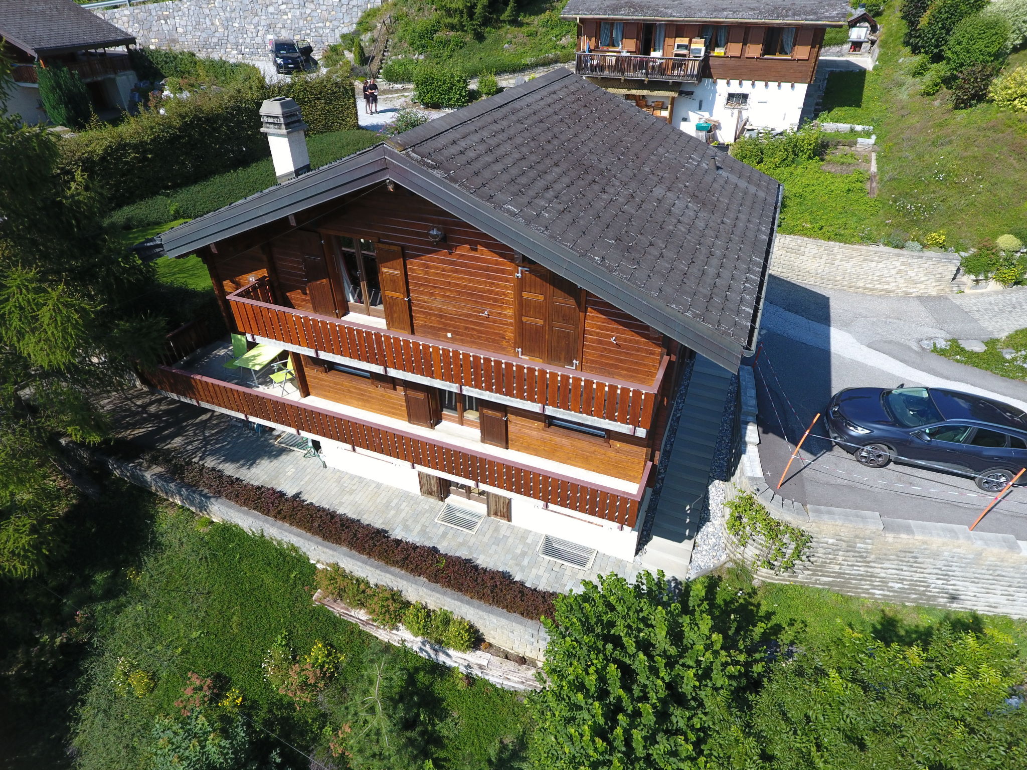 Mayens de Chamoson 4 km von Ovronnaz: Schönes, gemütliches, komfortables Chalet "Les Falaises", auf 3 Stockwerken. Im Ortsteil Esserts, ruhige, sonnige Lage, 4 km vom Skigebiet, in einer Sackgasse, im Grünen, Richtung Süden. Zur Alleinbenutzung: Garten 80 m2 mit Rasen. Terrasse, Gartenmöbel, Grill. Zufahrt bis zum Haus. Im Winter bitte Schneeketten mitbringen. Einzelgarage. Lebensmittelgeschäft 3.5 km, Restaurant, Café, Bushaltestelle 300 m, Thermalbad 4 km. Skibushaltestelle 300 m, Skischule 3.5 km, Langlaufloipe 3.5 km. Bitte beachten: Fahrzeug empfohlen. Der Besitzer akzeptiert keine Jugendgruppen. Der gratis Skibus fährt zum Skigebiet d'Ovronnaz.