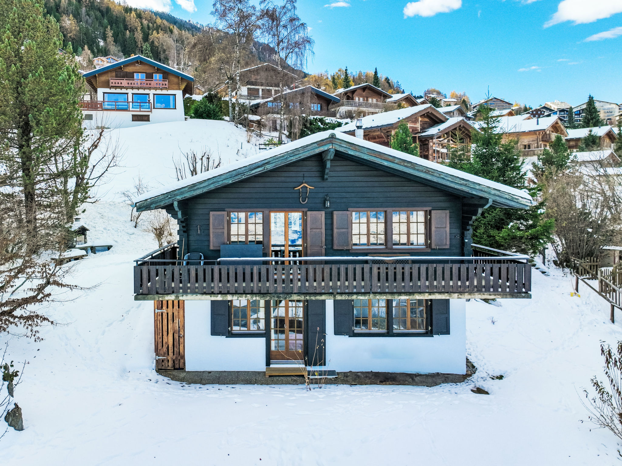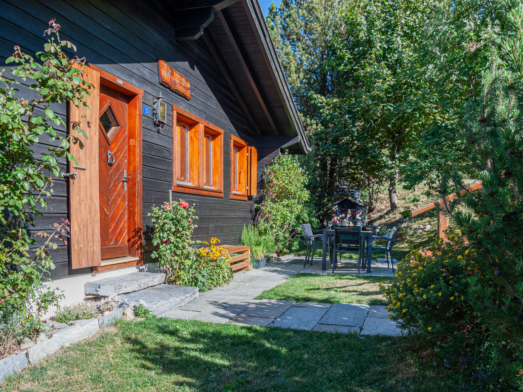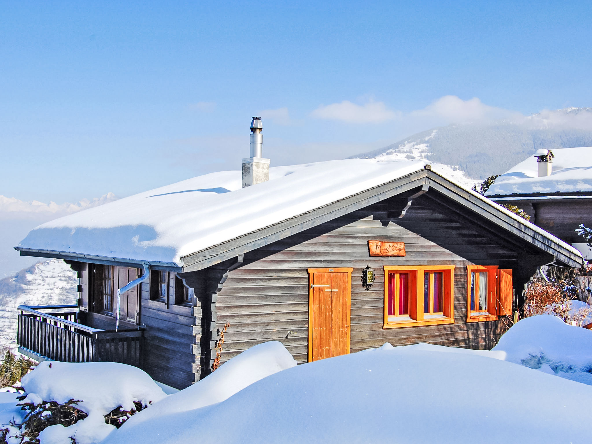 "Mustela", 4-Zimmer-Chalet 95 m2 auf 2 Stockwerken. Teilweise renoviert im Jahre 2019, schön und gemütlich eingerichtet: Wohn-/Esszimmer mit offenem Kamin, Kabel-TV und DVD. Küche (Backofen, Geschirrspüler, 4 Glaskeramikplatten, Toaster, Wasserkocher, elektrische Kaffeemaschine, Kapseln für die Kaffeemaschine (Delizio) extra, Racletteofen, Fondue Set (Käse)). Dusche/WC. E-Heizung. Unteres Geschoss: 2 Zimmer, jedes Zimmer mit 2 Betten (90 cm, Länge 190 cm). 1 Zimmer mit 1 x 2 Etagenbetten (80 cm, Länge 190 cm). Dusche/WC. Balkon, Nordlage und Westlage Balkon, Ostlage. Terrassenmöbel, Balkonmöbel, Gartengrill, Liegestühle (3). Sehr schöne Sicht auf die Berge und das Tal. Zur Verfügung: Kinderhochstuhl, Babybett, Haartrockner. Internet (Wireless LAN). Parkplatz (2 Autos). Bitte beachten: Nichtraucher-Unterkunft.