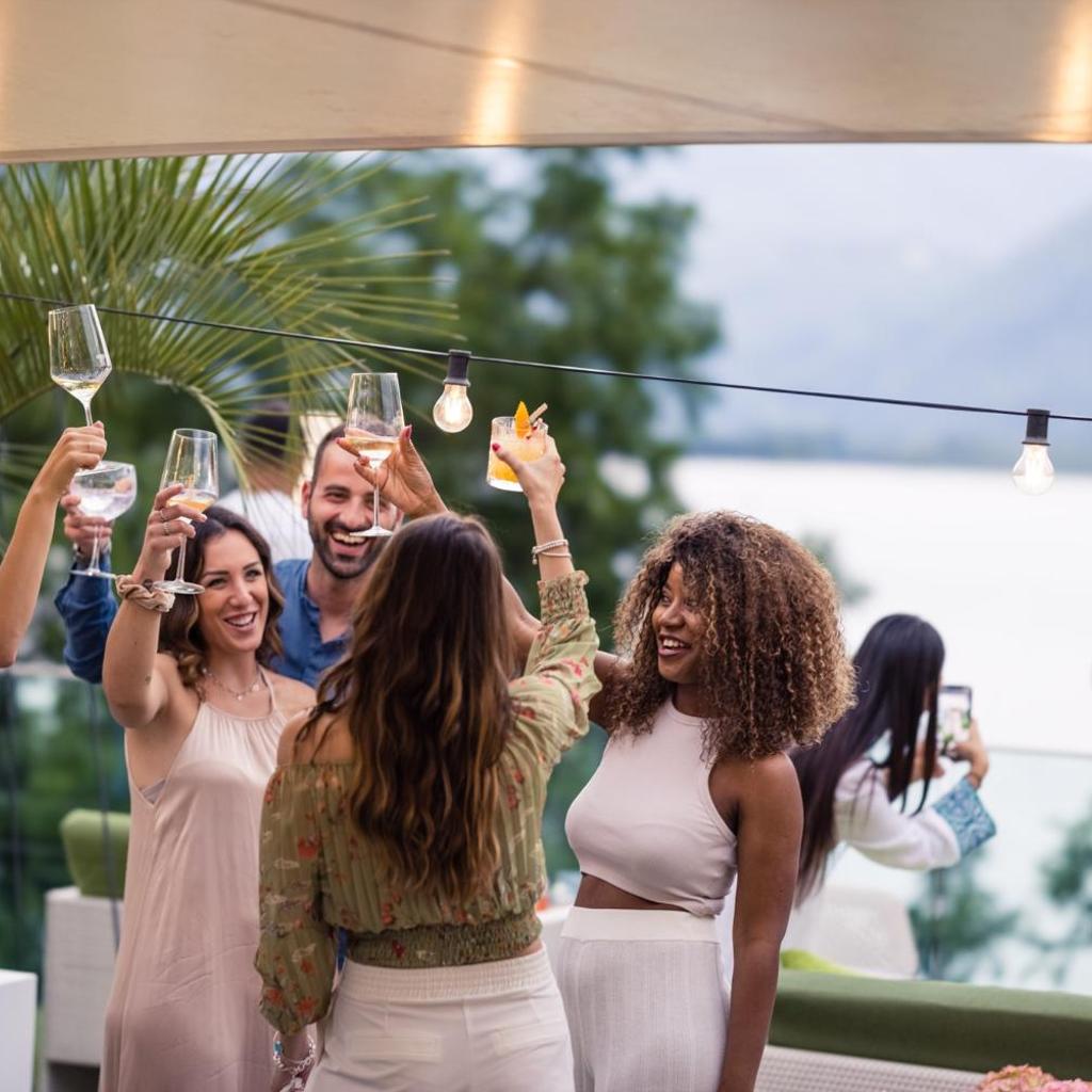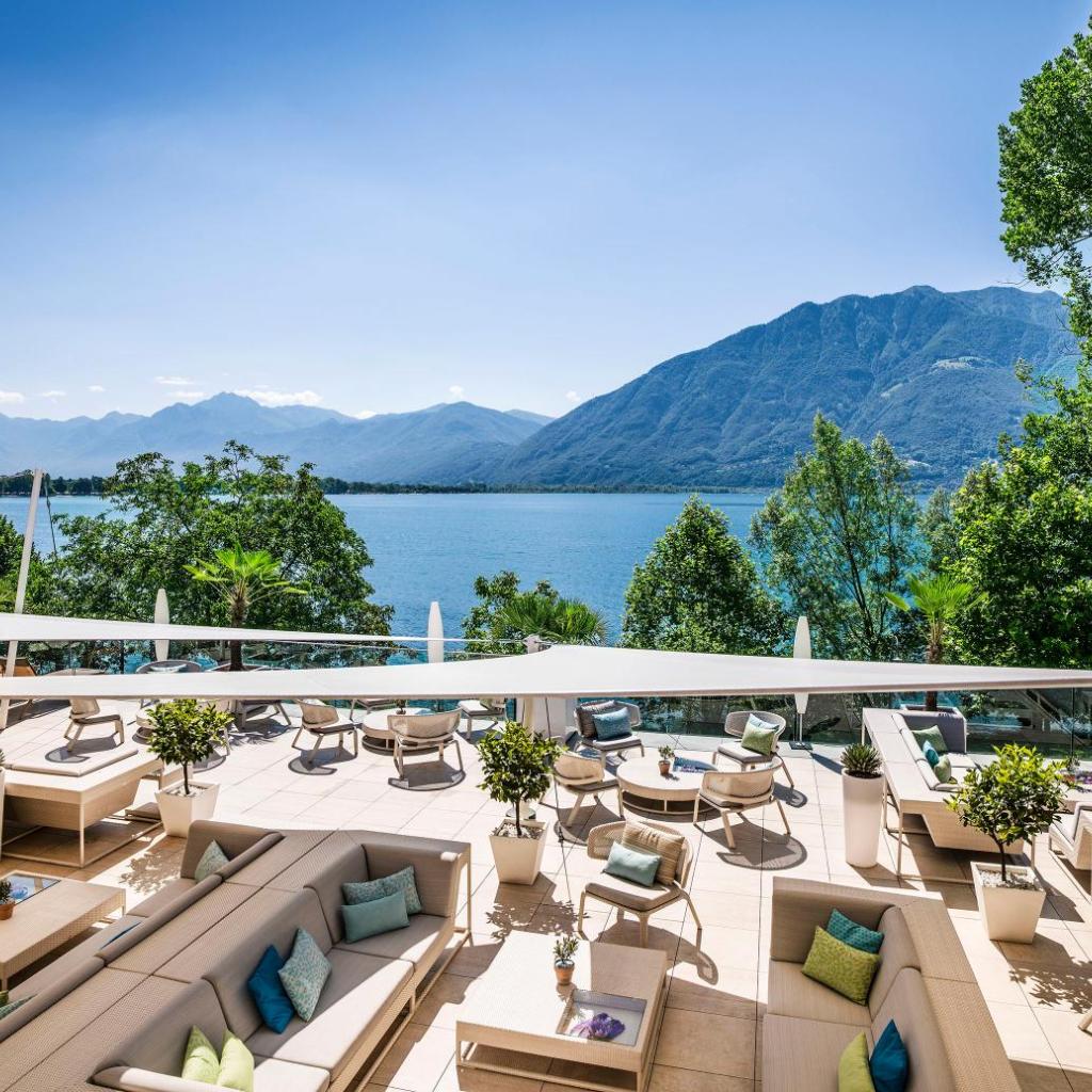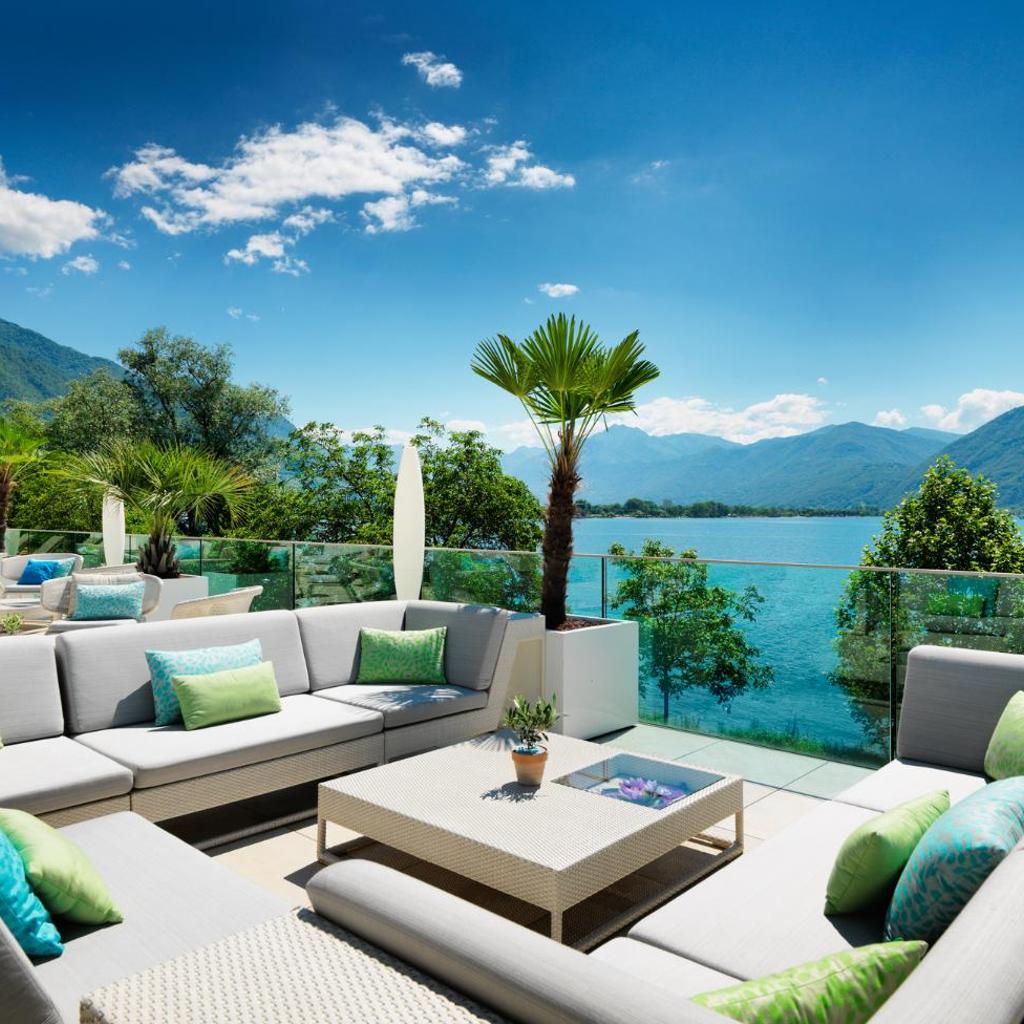 Die Lounge auf dem Dach lädt zum Entspannen bei einem Getränk oder einem Sonnenbad auf den Liegestühlen mit Blick auf den Lago Maggiore ein.