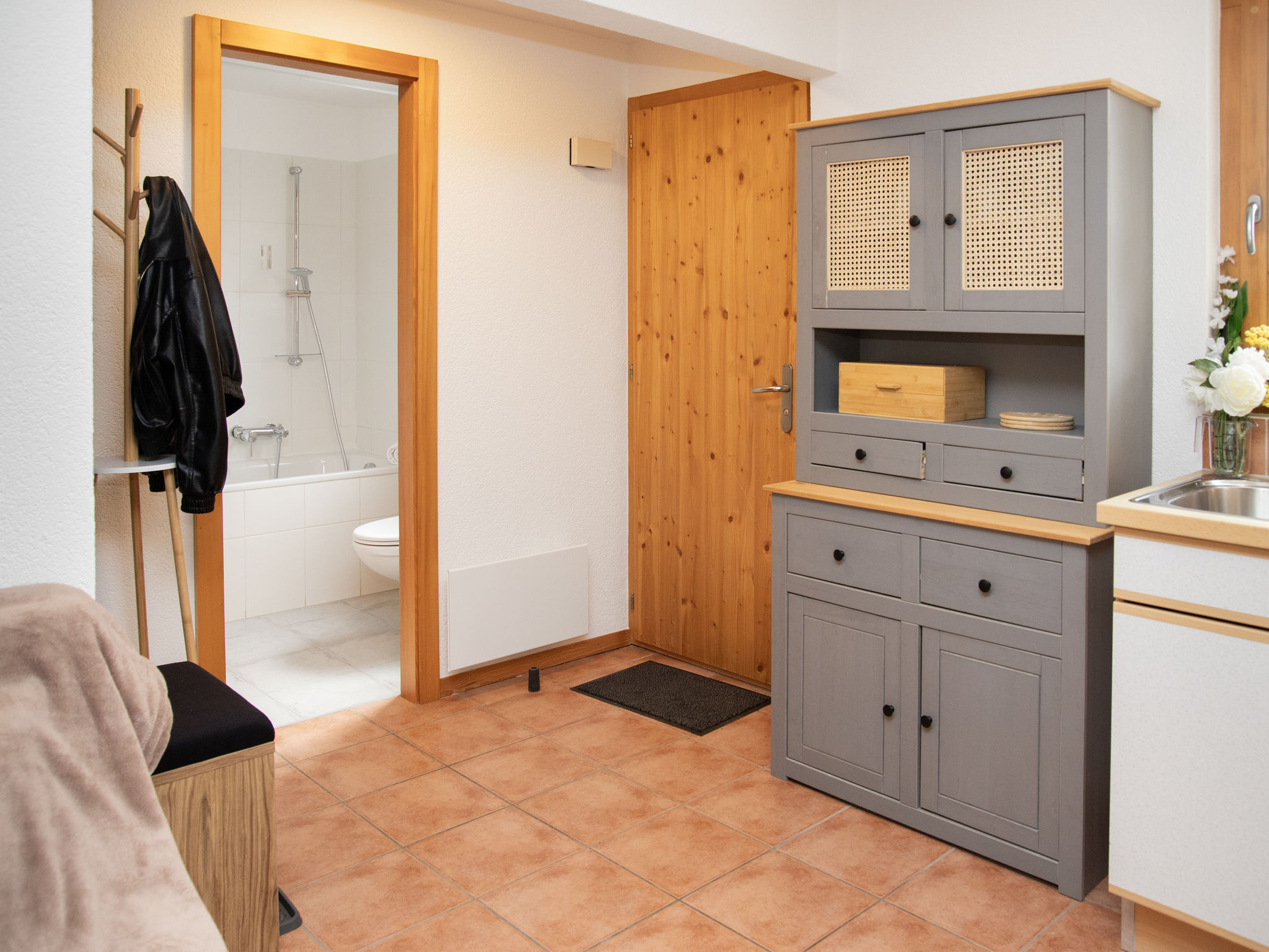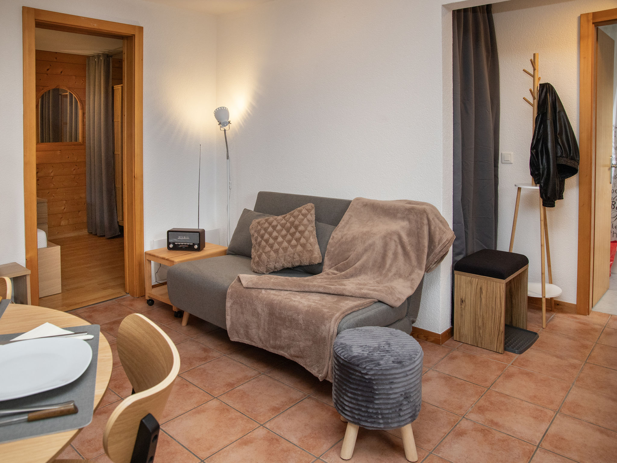 "Bolettes", 2-Zimmer-Wohnung im Erdgeschoss. Objekt geeignet für 2 Erwachsene + 1 Kind. Schön und geschmackvoll eingerichtet: Eingang. Wohn-/Esszimmer mit 1 Diwanbett (140 cm, Länge 200 cm), Kabel-TV, Radio und Holzofen. Ausgang zum Garten, zur Terrasse. 1 Zimmer mit 1 franz. Bett (160 cm, Länge 200 cm). Offene Küche (4 Kochplatten, Backofen, Geschirrspüler, Toaster, Wasserkocher, elektrische Kaffeemaschine, Kapseln für die Kaffeemaschine (Nespresso) extra, Racletteofen, Fondue Set (Käse)) mit Esstisch. Bad/WC. Terrassenmöbel, Liegestühle (2). Schöne Sicht auf die Berge. Zur Verfügung: Haartrockner, Holz (gratis). Parkplatz (1 Auto). Bitte beachten: geeignet für Familien. Nichtraucher-Unterkunft. Eigener Eingang.