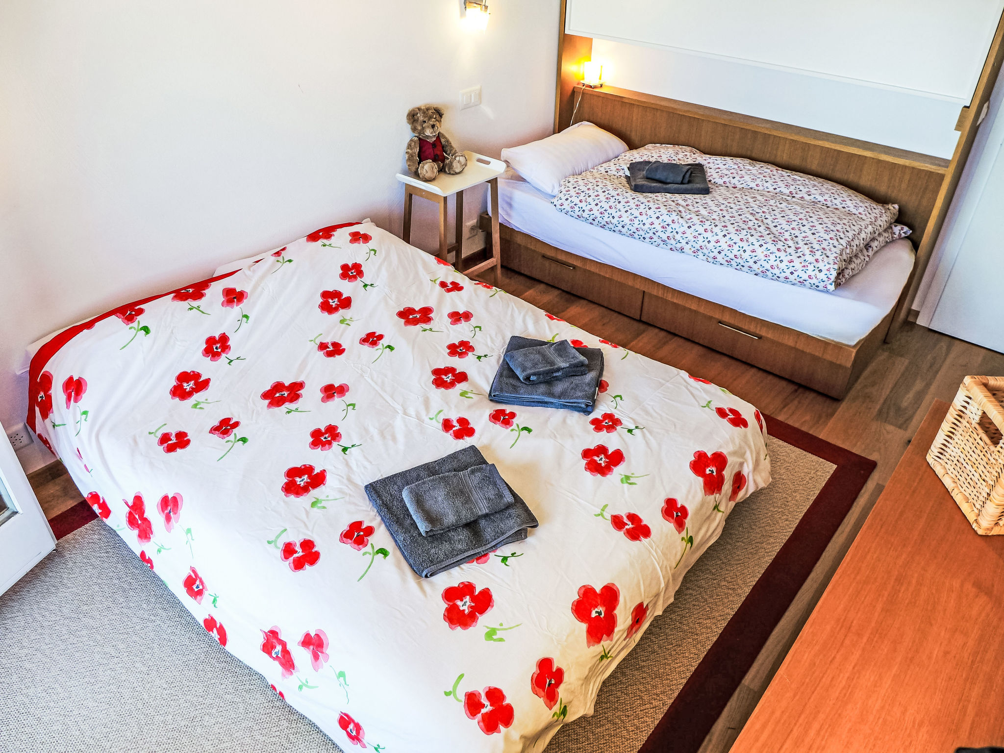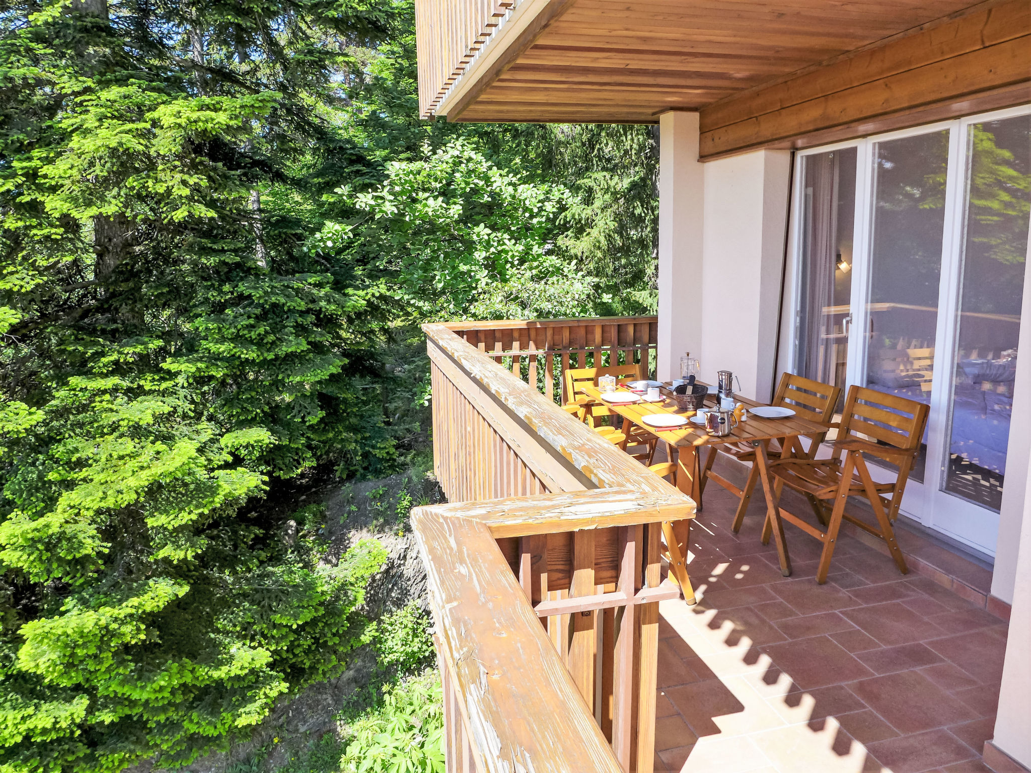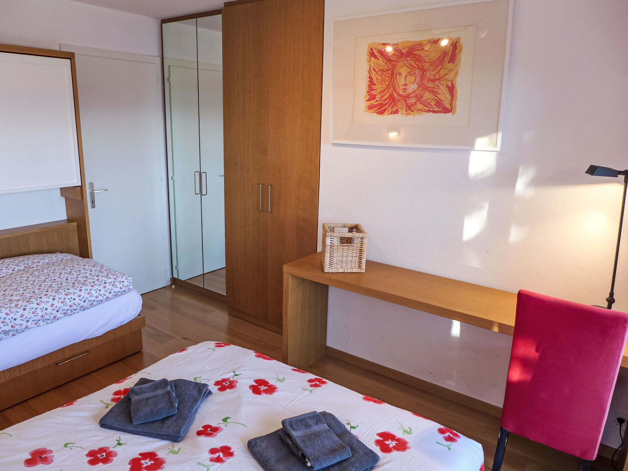 "Les Arolles B12", 3-Zimmer-Wohnung 90 m2 im 2. Stock. Geräumig, komfortabel und schön eingerichtet: Wohn-/Esszimmer mit offenem Kamin, Kabel-TV, Flachbildschirm, DVD und DVD Sammlung vorhanden. Ausgang zum Balkon, Richtung Süden. 1 Zimmer mit begehbarem Kleiderschrank mit 1 Doppelbett (160 cm, Länge 200 cm), Sitzbad/WC. 1 Zimmer mit 1 Bett (80 cm, Länge 190 cm), 1 Diwanbett (140 cm, Länge 190 cm). Ausgang zum Balkon, Richtung Süden. Küche (Backofen, Geschirrspüler, 4 Glaskeramikplatten, Wasserkocher, Tiefkühler, elektrische Kaffeemaschine, Kapseln für die Kaffeemaschine (Nespresso) extra, Racletteofen, Kombinationsmikrowelle, Fondue Set (Chinoise)). Ausgang zum Balkon, Richtung Norden. Dusche/WC. Balkon 20 m2, Südlage. Balkonmöbel. Sehr schöne Sicht auf die Berge und die Landschaft. Zur Verfügung: Bügeleisen, Haartrockner. Internet (Wireless LAN, gratis). Garage (1 Auto), Höhe 193 cm, Breite 220 cm. Bitte beachten: Nichtraucher-Unterkunft.
