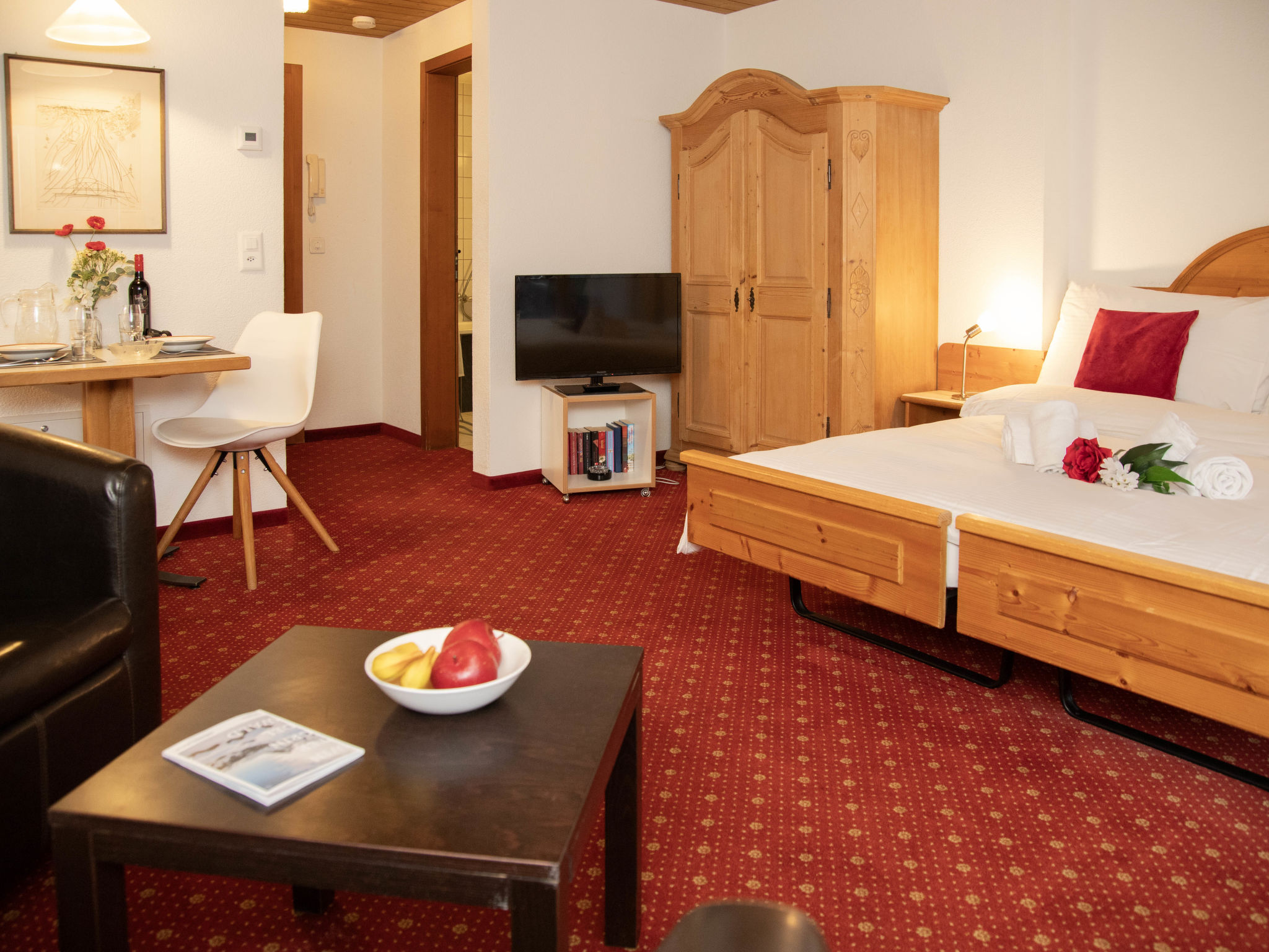 1-Zimmer-Wohnung 27 m2 im 2. Stock, Südlage. Wohn-/Schlafzimmer mit 2 Betten und Kabel-TV (Flachbildschirm). Offene Küche (Backofen, 4 Glaskeramikplatten, Toaster, Wasserkocher, elektrische Kaffeemaschine) mit Esstisch. Bad/WC. Balkon, Südlage. Balkonmöbel. Schöne Sicht auf die Berge und Eiger. Zur Verfügung: Haartrockner. Internet (Wireless LAN, gratis). Bitte beachten: Nichtraucher-Unterkunft. Maximal 1 Haustier/Hund erlaubt. Ein Fondue Set (Fleisch oder Käse) sowie ein Raclette-Ofen kann an der Rezeption ausgeliehen werden.