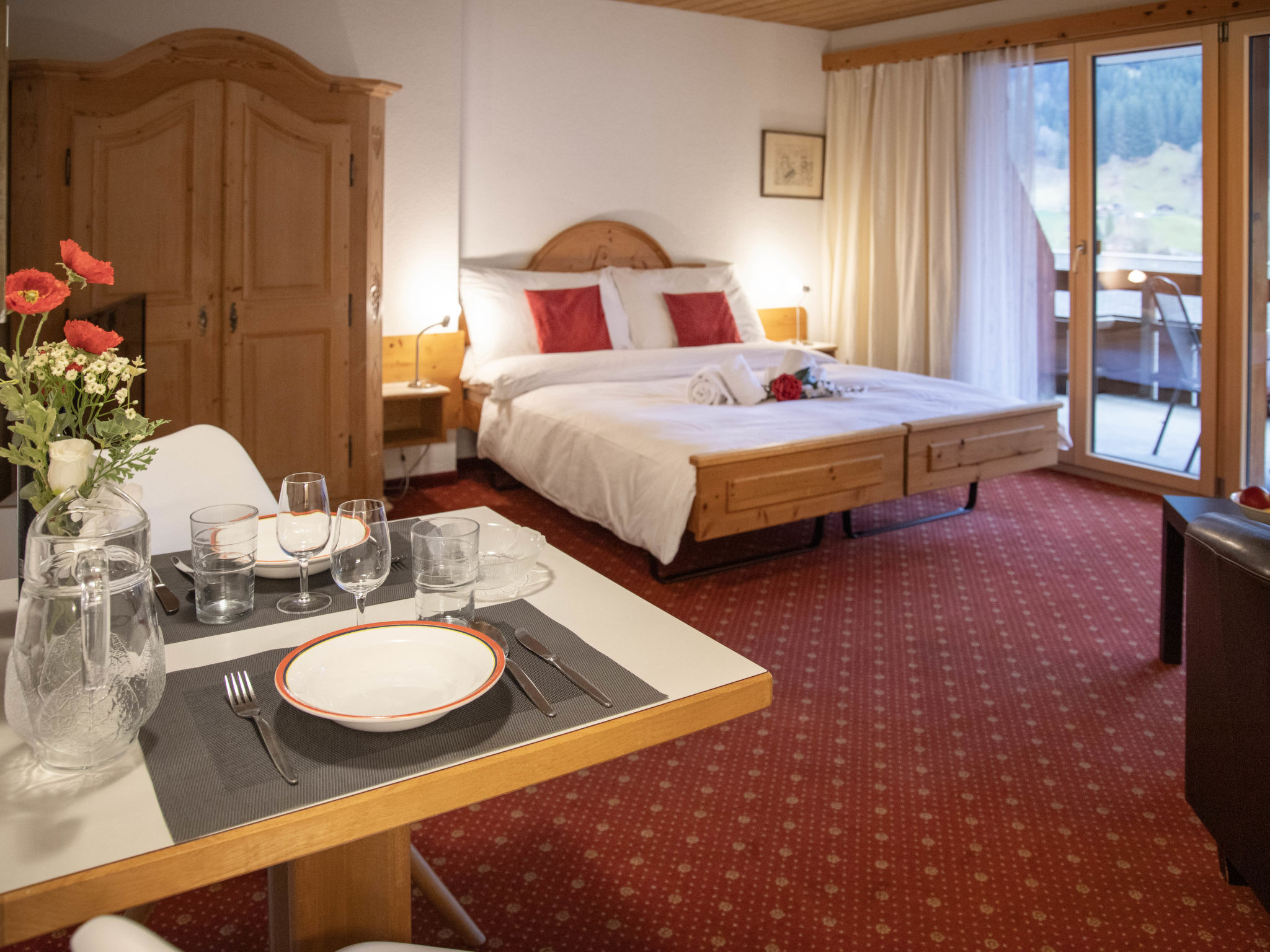 Residenz "Chalet Abendrot apARTments". Im Ortszentrum. Im Hause: Empfang, Aufenthaltsraum, Wireless LAN, Tischtennis, Billard, Spielzimmer, Fahrstuhl, Skiraum, Zentralheizung. Einkaufsservice vor Anreise möglich. Im Winter bitte Schneeketten mitbringen. Gemeinschaftsgarage (extra), öffentliche Parkplätze 200 m extra. Einkaufsgeschäft 400 m, Restaurant 10 m, Bushaltestelle "Firstbahn" 80 m, Bahnstation "Grindelwald Dorf" 800 m, Freibad 2.5 km, Hallenbad 600 m. Golfplatz (9 Loch) 2 km, Tennis 1 km, Minigolf 400 m, Sportzentrum 600 m, Bergeisenbahn 800 m, Gondelbahn 80 m, Skiverleih 50 m, Skibushaltestelle 80 m, Langlaufloipe 1 km, Kinderspielplatz 600 m. Bekannte Seen in der Umgebung sind gut erreichbar: Thuner-/Brienzersee 18 km. Bitte beachten: Der Besitzer akzeptiert keine Gruppen. Gratis Skibus. Die Nachbarschaft ist sehr lärmempfindlich. Ruhe und gutes Benehmen wird erwartet. Indisches Restaurant "Golden India" im Hause. Das im Chaletstil erbaute Appartementhaus bietet einen Jugendraum, ein Kinderspielzimmer, eine Autoeinstellhalle (Parkplatz CHF 98.00/Woche, Reservierung bei Ankunft). Modern-rustikale und gemütliche Wohnungen, die meisten mit grosszügigem Balkon oder Terrasse und wunderbarem Blick auf die Bergwelt. Bitte beachten: Beschränkte Anzahl Garagenplätze. Nicht vorreservierbar. Garagenhöhe und -breite: 12 Parklpätze 2.09x2.06 m, 15 Parkplätze 1.65x2.06 m. Max. 2000 kg.