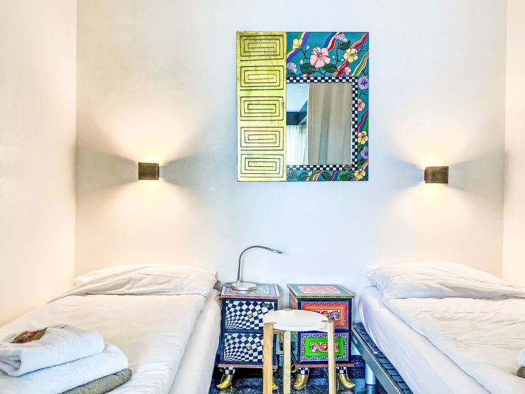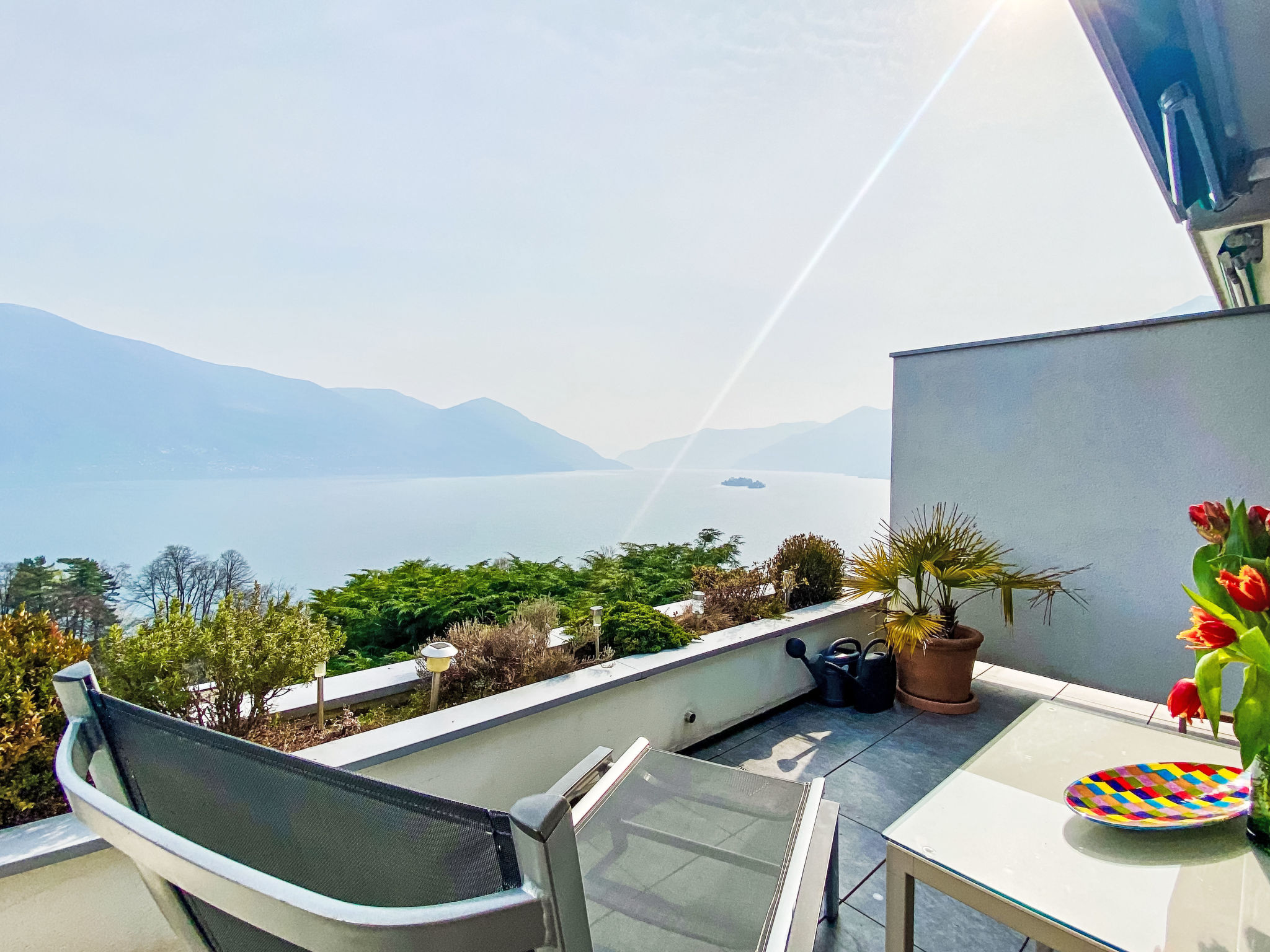 Moscia - Ascona: Schöne Residenz "Sollevante". Am Ortsrand, 2.5 km vom Zentrum von Ascona, ruhige, sonnige, erhöhte Lage am Hang, Richtung Südosten. Zur Mitbenutzung: Schwimmbad (7 x 5 m, 190 cm tief, saisonale Verfügbarkeit: 01.Mai. - 30.Sep.). Aussendusche, Terrasse. Im Hause: Wireless LAN, Einstellraum für Fahrräder, Zentralheizung. Zufahrt bis zum Haus. Lebensmittelgeschäft 2.5 km, Restaurant 200 m, Bushaltestelle "Ascona Moscia Linie 316" 400 m, Bahnstation "Locarno SBB" 6 km. Golfplatz 4 km, Wanderwege ab Haus 5 m. Nahe gelegene Sehenswürdigkeiten: Madonana del Sasso, Orselina, Locarno-Ascona, Ronco sopra Ascona, Falconeria, Kamelienpark, Piazza Grande. Wandergebiete: Cardada, Monte Bré, Monti di Ronco, Vallemaggia - Valle Verzasca. Bitte beachten: Tiere in der Umgebung. Terrassenbau mit wunderbarer Panoramasicht auf den Lago Maggiore. Eine Seilbahn verbindet die verschiedenen Ebenen.