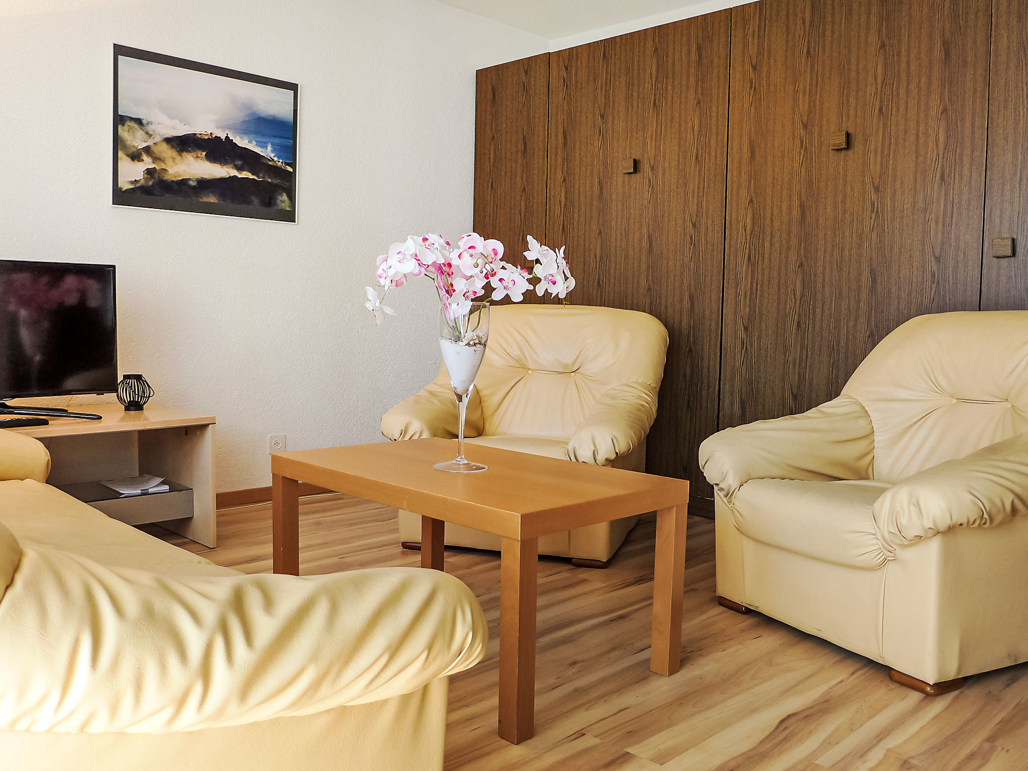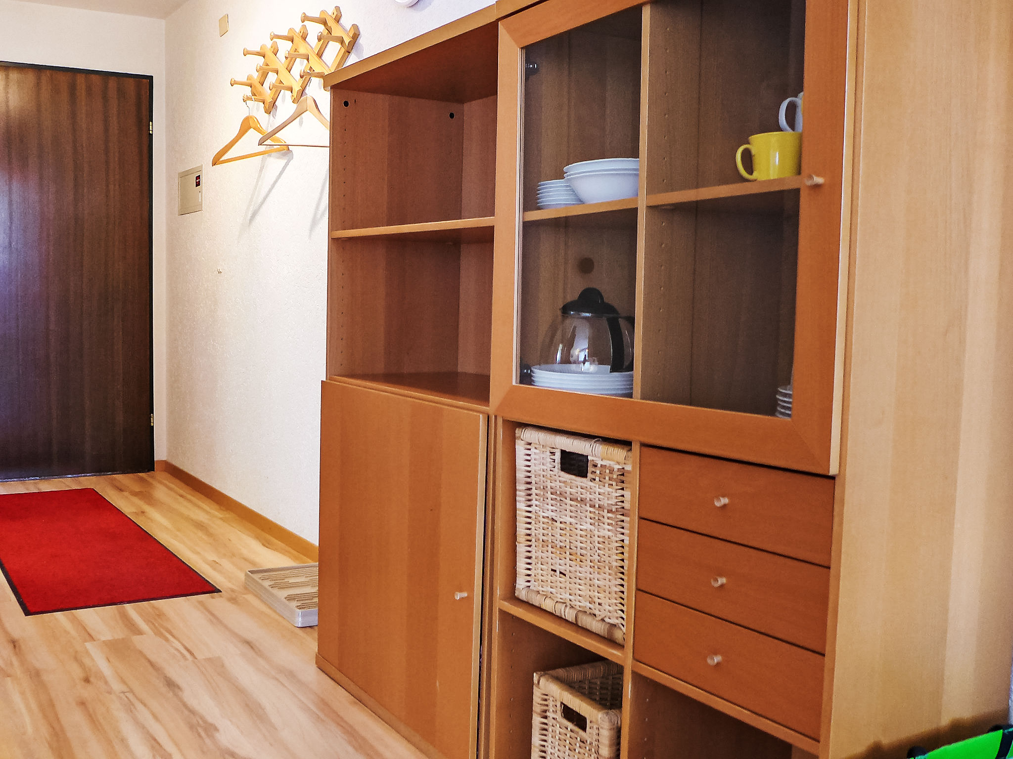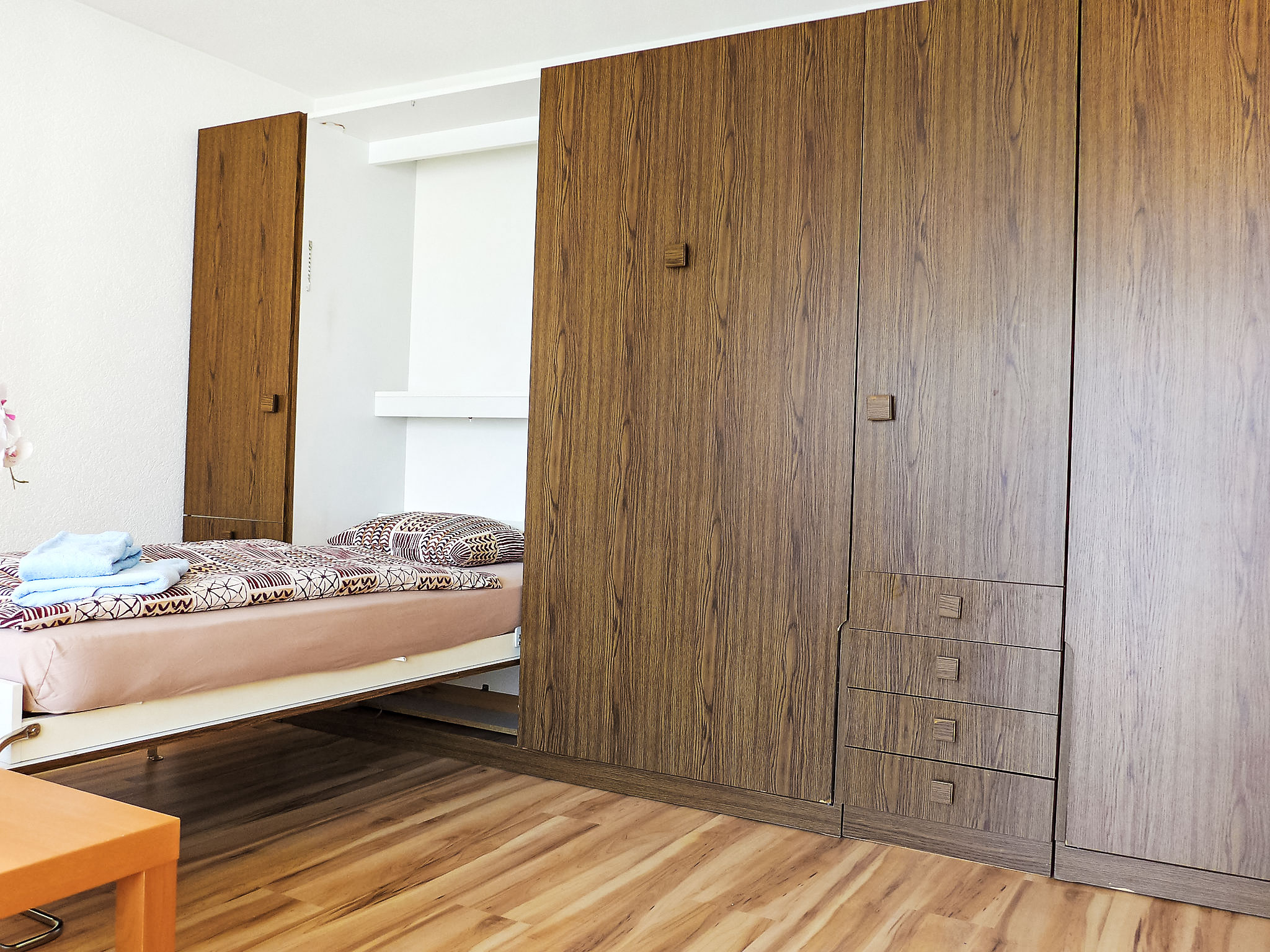 2-Zimmer-Wohnung 64 m2 im 1. Stock, Südlage. Hell, einfach und gemütlich eingerichtet: Wohn-/Schlafzimmer mit 3 Wandschrankbetten (90 cm, Länge 200 cm), TV. Ausgang zum Balkon, Richtung Süden. 1 Zimmer mit 1 Doppelbett (2 x 90 cm, Länge 200 cm). Küche (Backofen, 4 Glaskeramikplatten, Toaster, Wasserkocher, Mikrowelle, Tiefkühler, elektrische Kaffeemaschine, Racletteofen, Fondue Set (Käse)). Dusche/WC. Heizung. Grosser Balkon, Südlage und Westlage. Balkonmöbel. Schöne Sicht auf die Berge. Zur Verfügung: Haartrockner. Internet (Wireless LAN, gratis). Bitte beachten: Nichtraucher-Unterkunft.