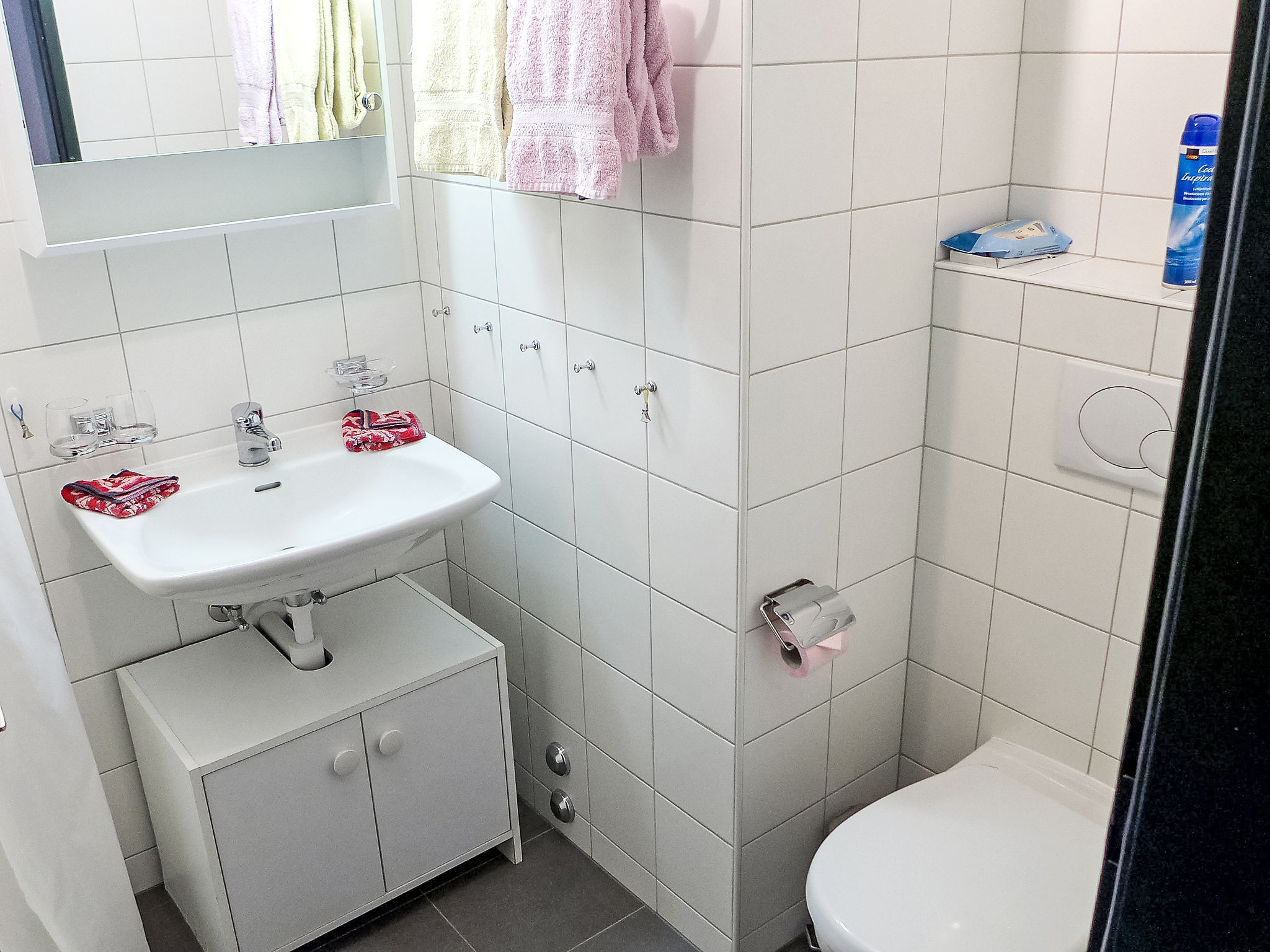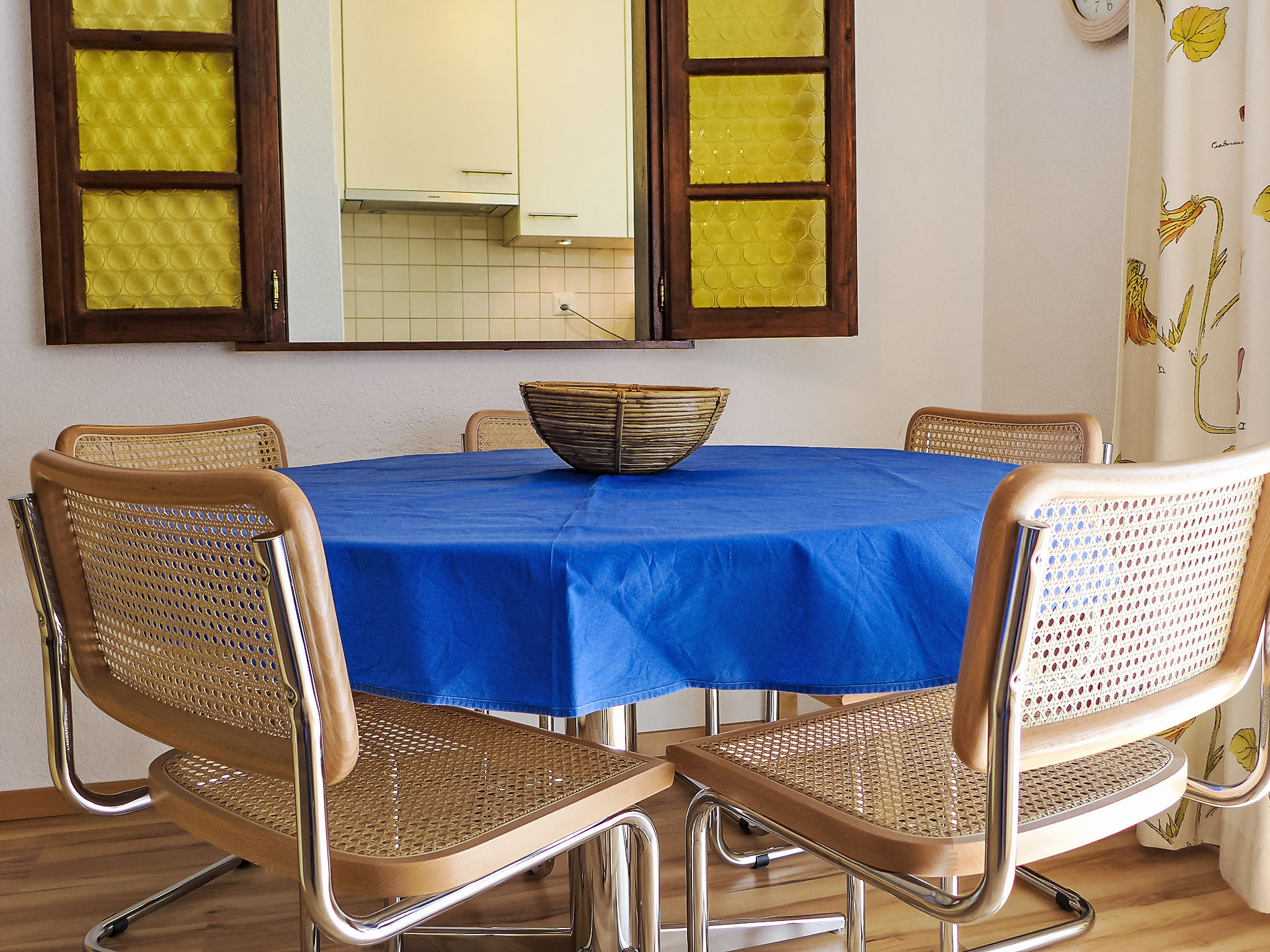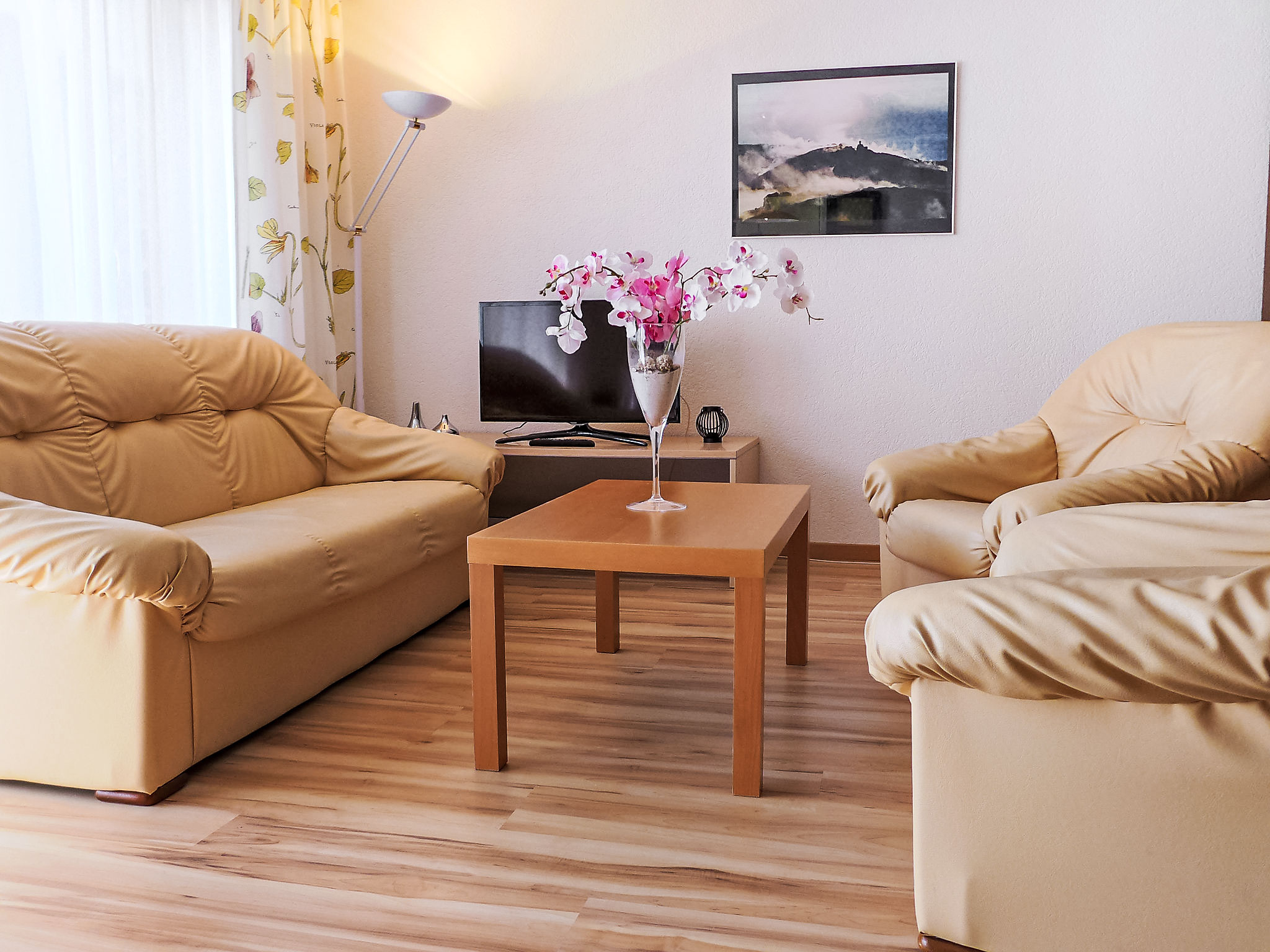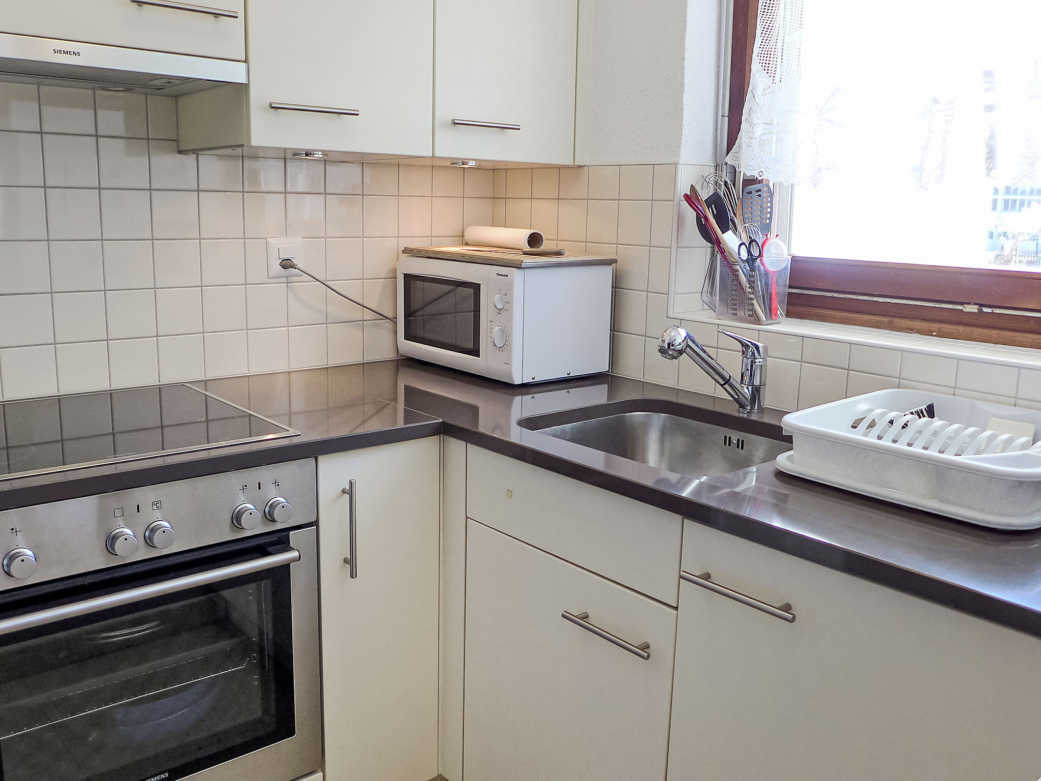 2-Zimmer-Wohnung 64 m2 im 1. Stock, Südlage. Hell, einfach und gemütlich eingerichtet: Wohn-/Schlafzimmer mit 3 Wandschrankbetten (90 cm, Länge 200 cm), TV. Ausgang zum Balkon, Richtung Süden. 1 Zimmer mit 1 Doppelbett (2 x 90 cm, Länge 200 cm). Küche (Backofen, 4 Glaskeramikplatten, Toaster, Wasserkocher, Mikrowelle, Tiefkühler, elektrische Kaffeemaschine, Racletteofen, Fondue Set (Käse)). Dusche/WC. Heizung. Grosser Balkon, Südlage und Westlage. Balkonmöbel. Schöne Sicht auf die Berge. Zur Verfügung: Haartrockner. Internet (Wireless LAN, gratis). Bitte beachten: Nichtraucher-Unterkunft.