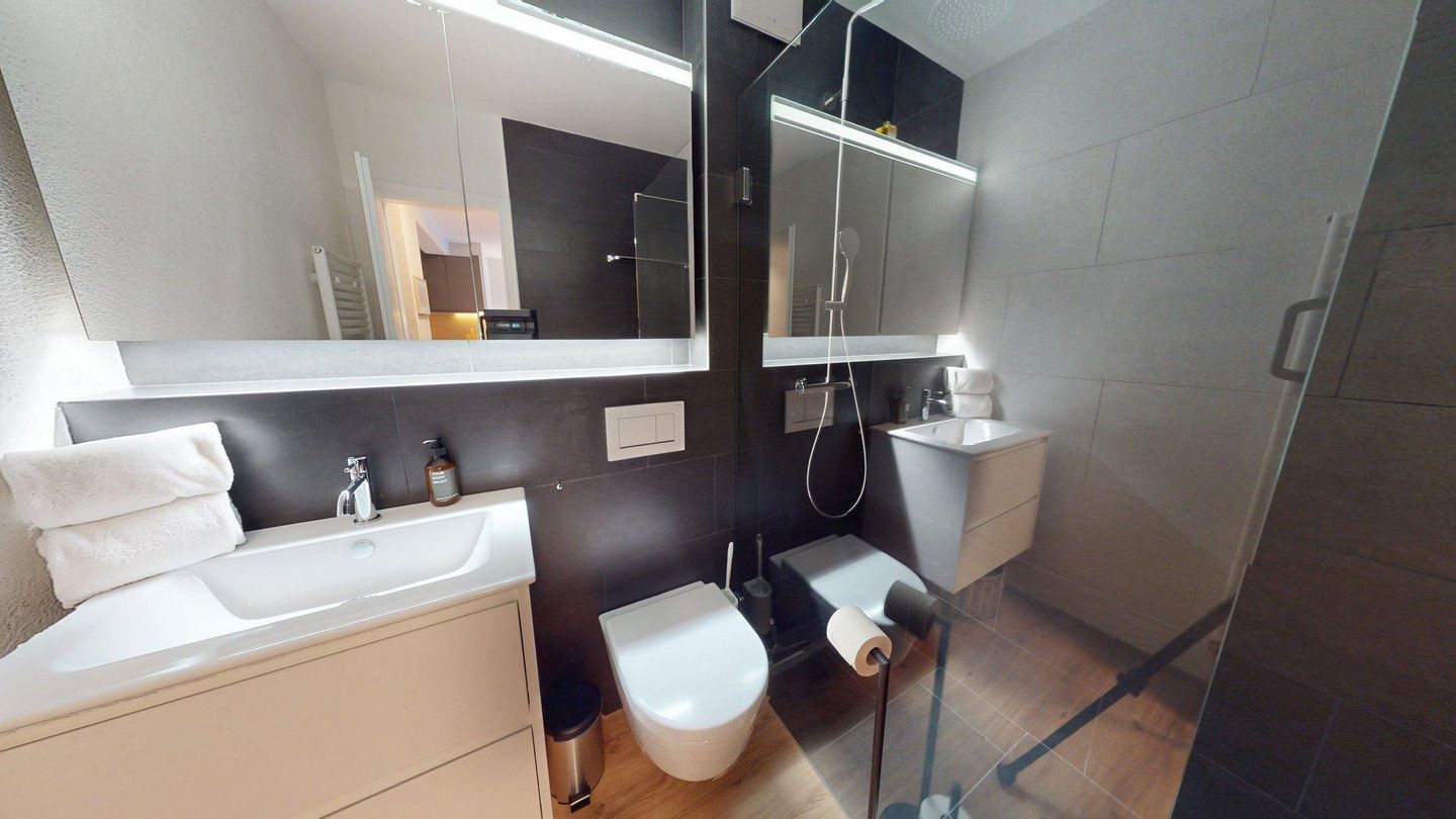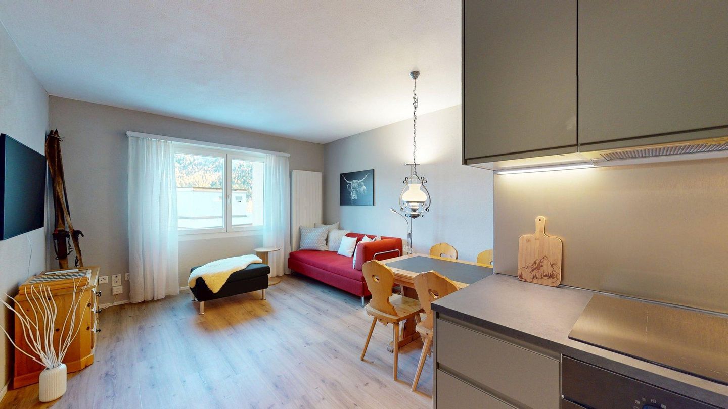 Die Ferienwohnung Sonnalpine B39 in St. Moritz ist ein modern renoviertes 2-Zimmer-Apartment und ideal für Paare oder kleine Familien, die ihren Urlaub im Engadin verbringen möchten. Auf Anfrage kann eine zusätzliche Person oder ein Kind auf dem Schlafsofa im Wohnzimmer übernachten. Das separate Schlafzimmer mit Doppelbett bietet einen herrlichen Blick auf den St. Moritzersee. Der offene Wohnbereich mit Sofaecke, Esstisch und Fernseher lädt zum Entspannen ein. Die grosse, moderne Küche ist vollständig ausgestattet und bietet alles, was man für einen komfortablen Aufenthalt braucht. Das Badezimmer verfügt über Dusche, WC und Waschbecken.