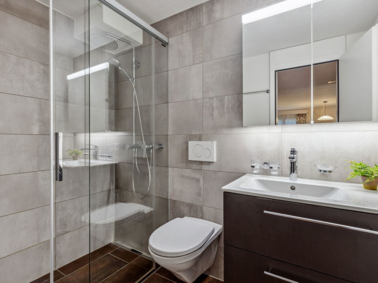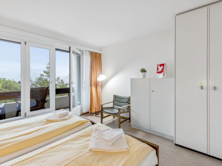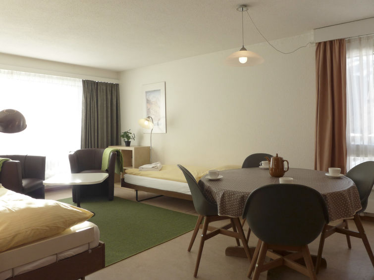 "Residence Apt. 15", 2-Zimmer-Wohnung 50 m2 im 2. Stock. Zweckmässig und komfortabel eingerichtet: Wohn-/Esszimmer mit 1 Diwanbett und 1 Wandklappbett (90 cm, Länge 200 cm), Esstisch, Kabel-TV, Radio und CD. 1 Zimmer mit 2 Betten (90 cm, Länge 200 cm). Offene Küche (Backofen, Geschirrspüler, 4 Glaskeramikplatten, Toaster, Wasserkocher, elektrische Kaffeemaschine, Kapseln für die Kaffeemaschine (Nespresso) extra, Racletteofen, Fondue Set (Käse)). Bad/Dusche/WC. Balkon. Balkonmöbel. Sehr schöne Panoramasicht auf die Berge. Zur Verfügung: Haartrockner. Internet (Wireless LAN, gratis). Bitte beachten: Nichtraucher-Unterkunft.